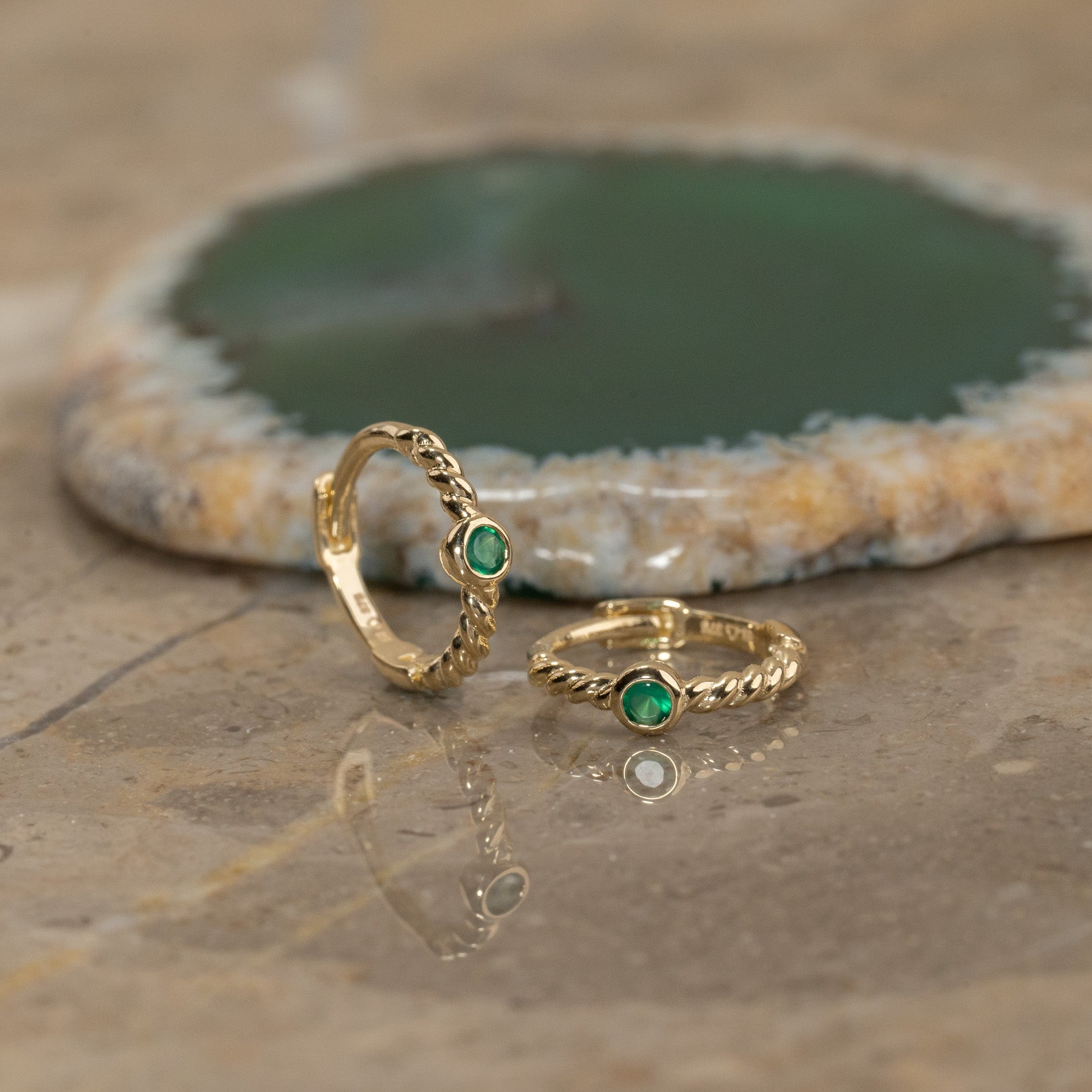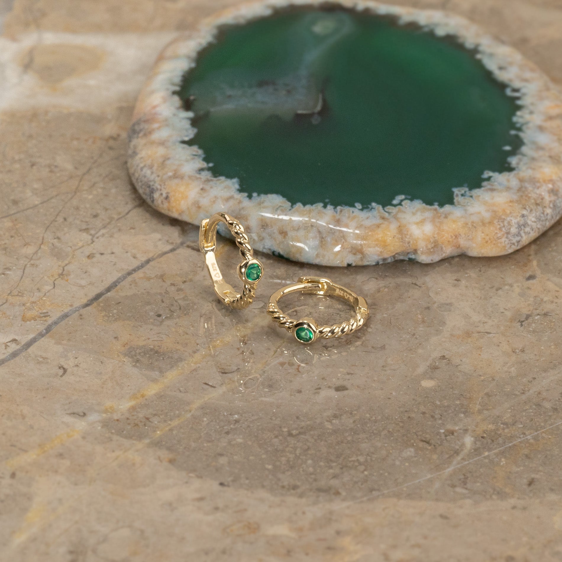 Små gullcreoler i 100% resirkulert 9 karat massivt gull med en grønn agat.