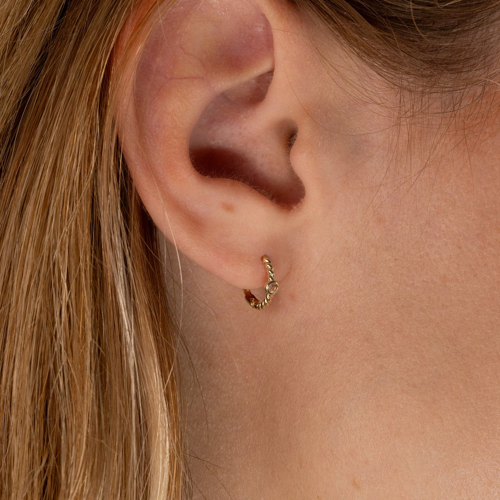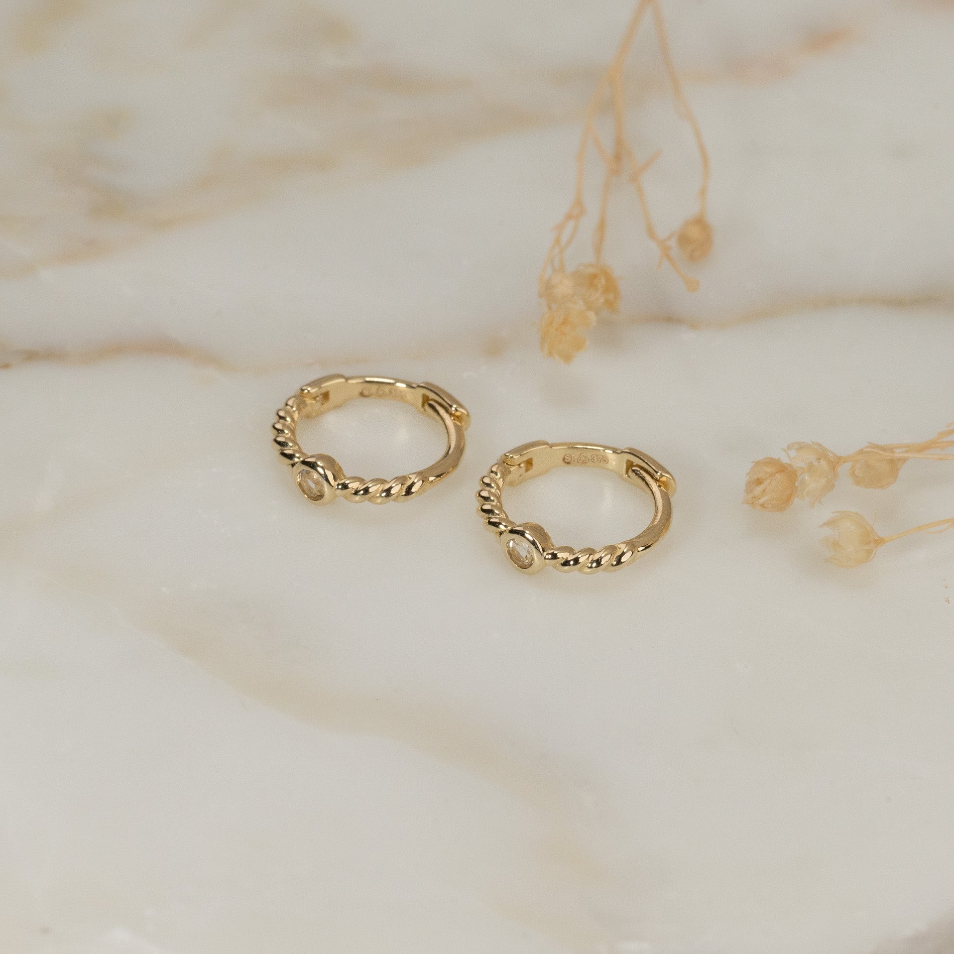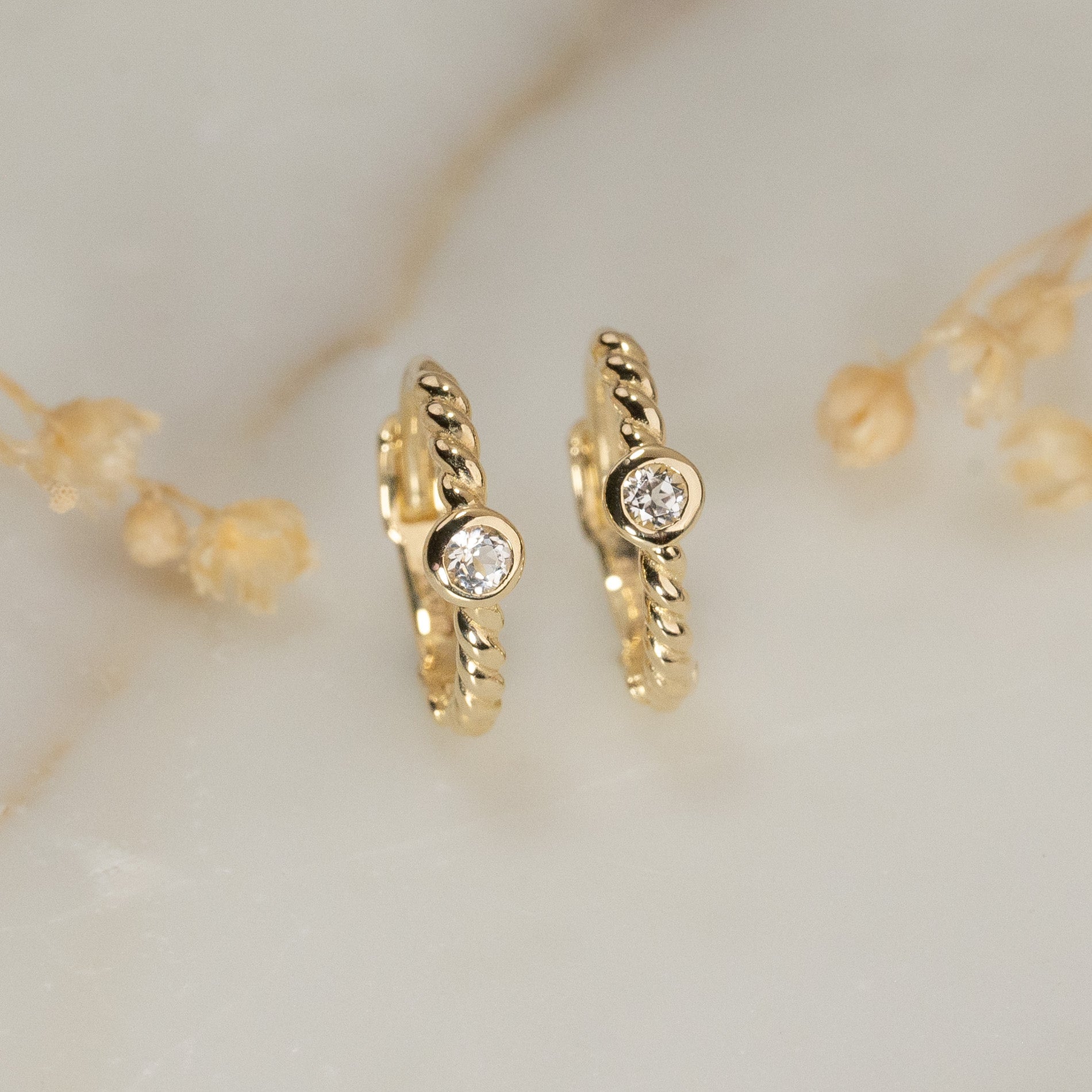 Øredobbene har et vridd design med en nydelig, liten edelsten i en innfatning på midten.