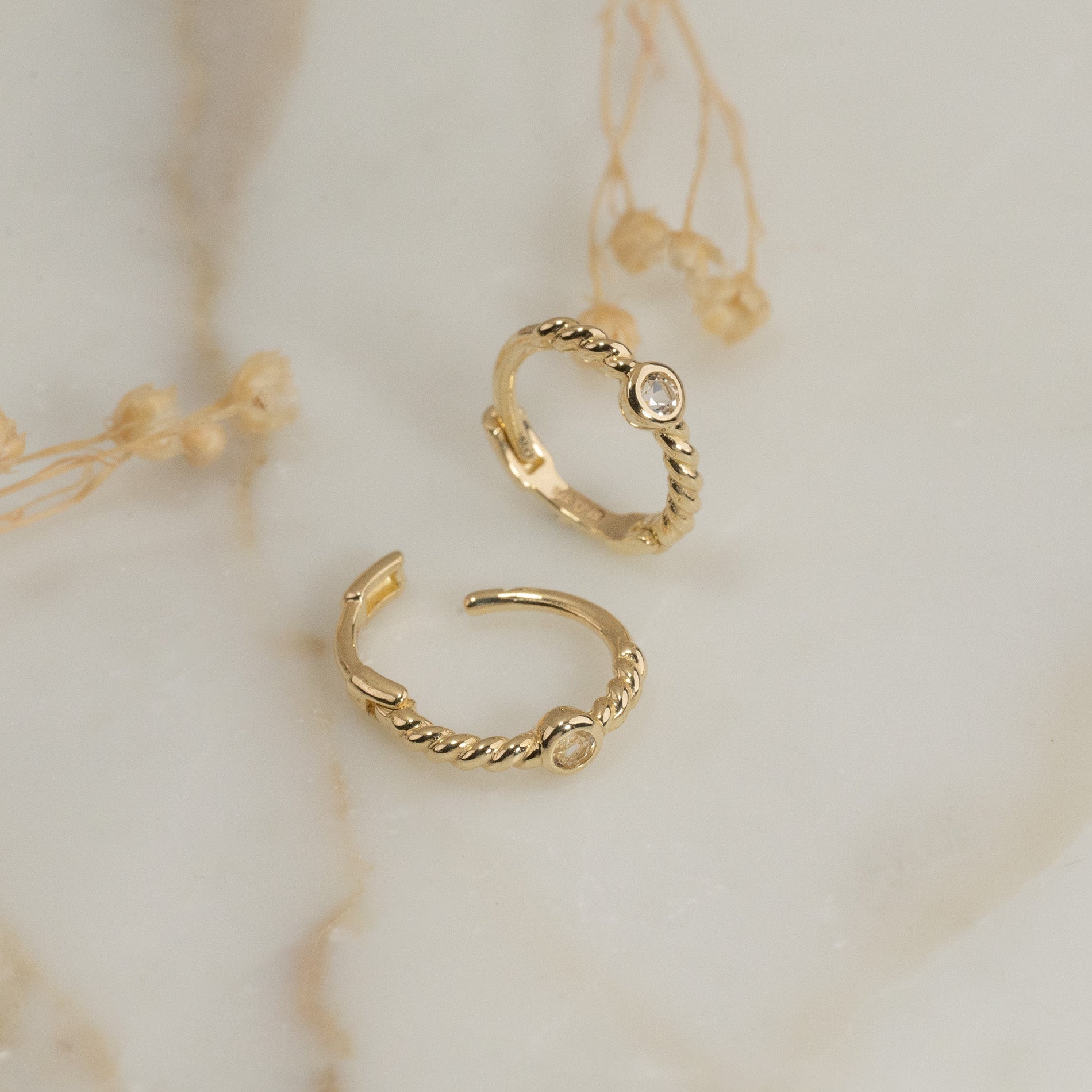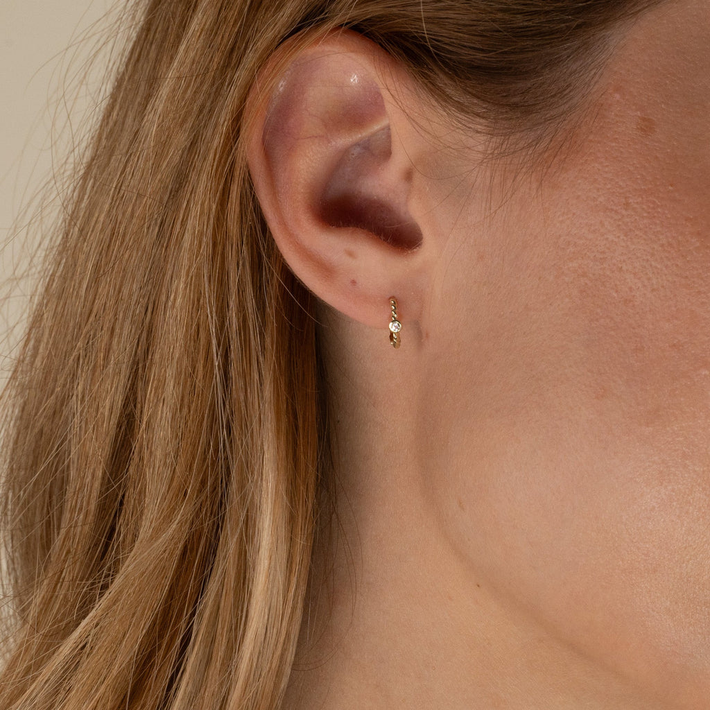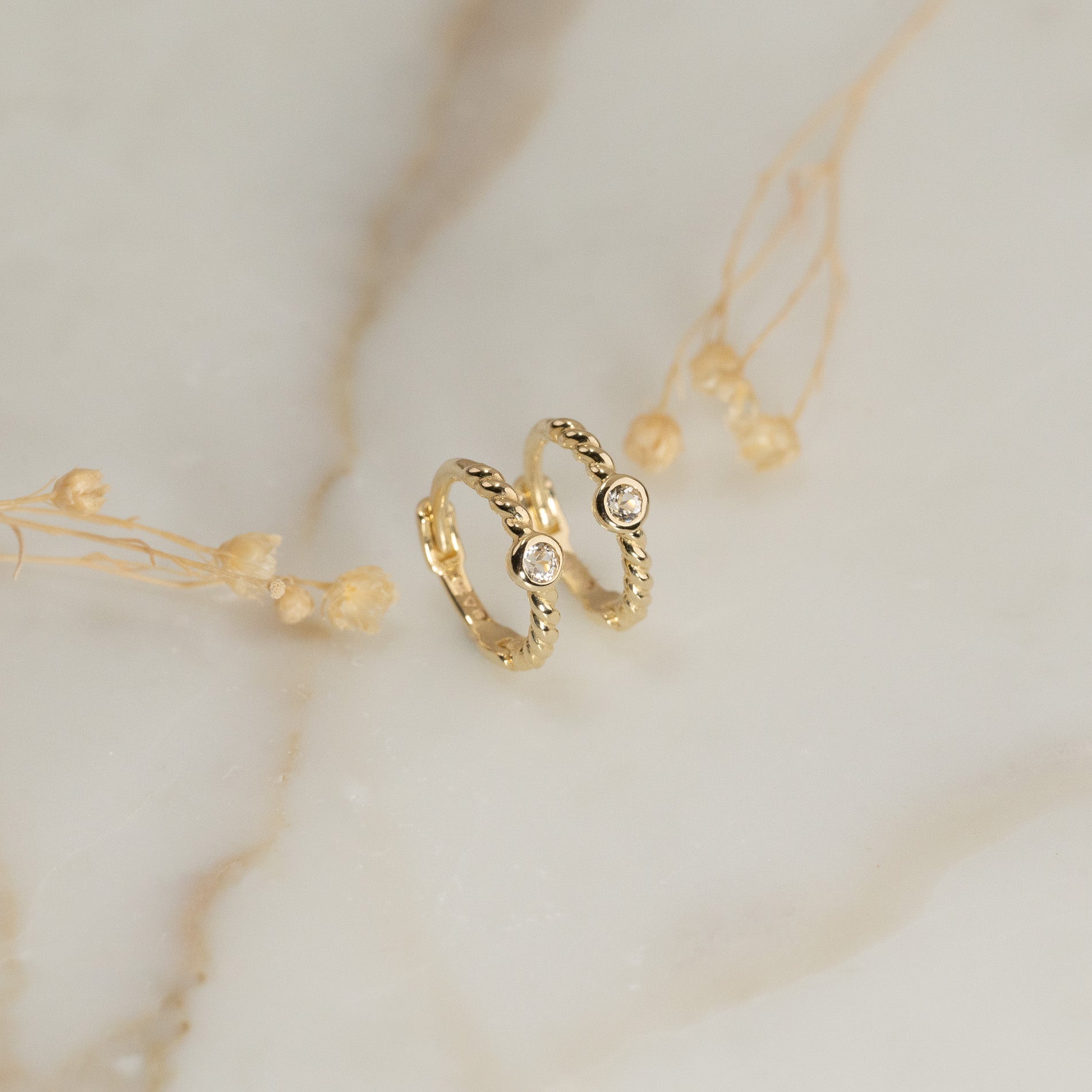 Øredobbene har et vridd design med en nydelig, liten edelsten i en innfatning på midten.