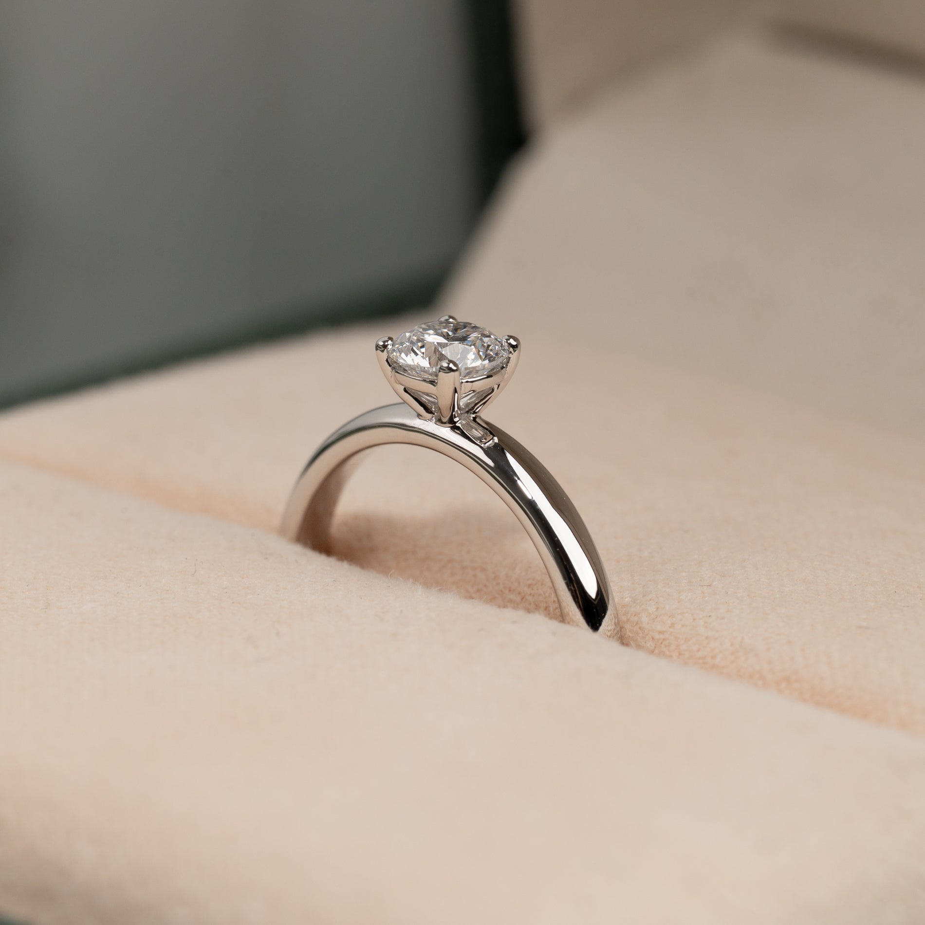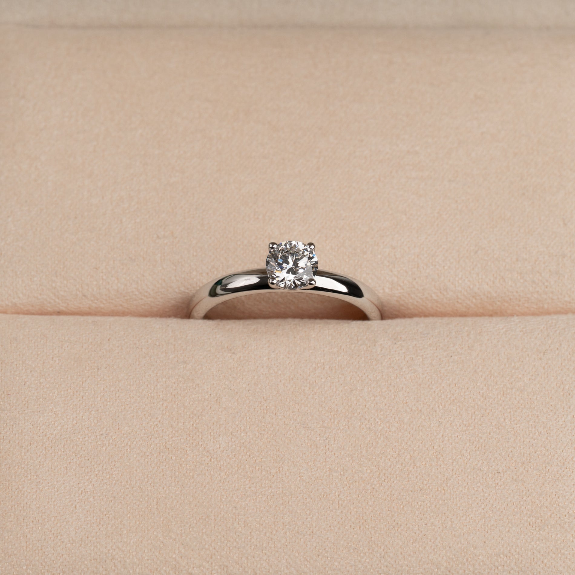 Klassisk og enkel solitaire diamantring i 14 karat hvitt gull. Den 0,5 ct. briljanslipte lab-grown diamanten sitter i en klassisk basket- omfatning, som sitter litt hevet over selve ringskinnen. Ringen er et tidløst og elegant smykke, som er perfekt som forlovelsesring.