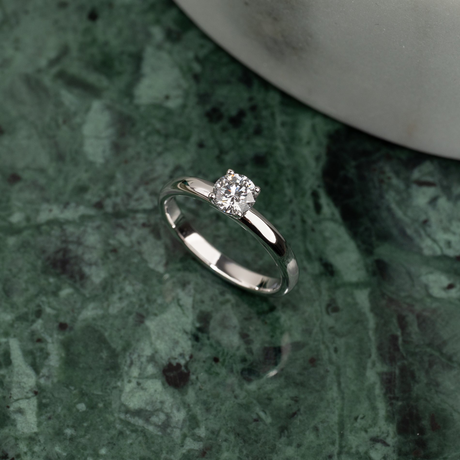 Ringen er laget i 14 karat massivt hvitt gull med en lab-grown diamant som har en vekt på 0,5 ct. (Ø5,1mm). Diamanten har fargen E/F (River) og klarhet VVS. Smykket er skapt med omtanke; diamantene er produsert med blant annet solenergi, og gullet er 100% sertifisert resirkulert.