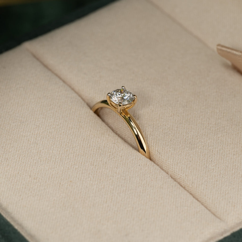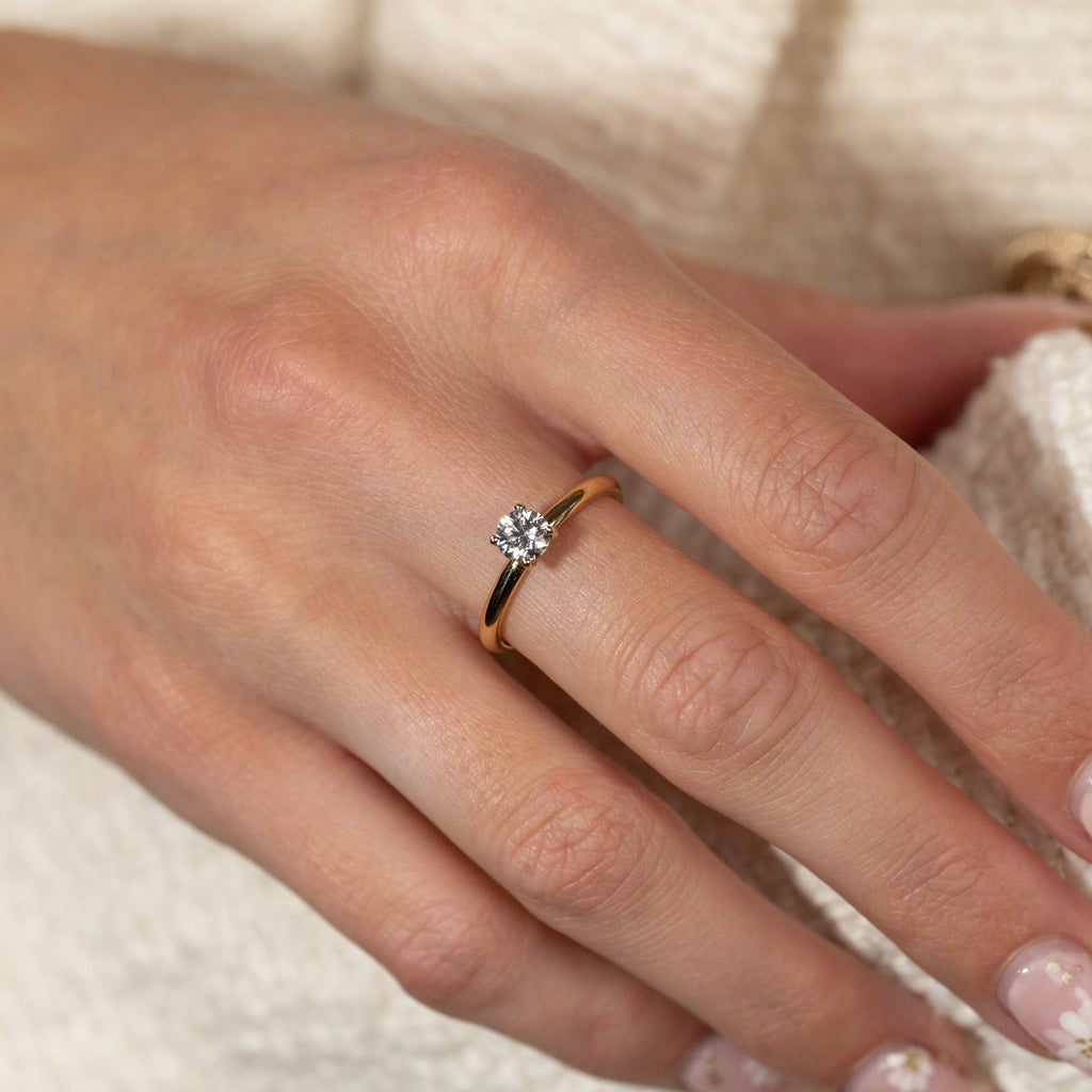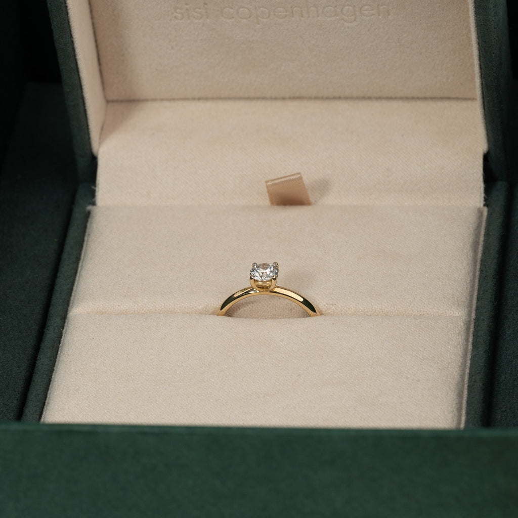 Klassisk og enkel solitaire diamantring i 14 karat gull. Den 0,5 ct. briljanslipte lab-grown diamanten sitter i en klassisk basket- omfatning, som sitter litt hevet over selve ringskinnen. Ringen er et tidløst og elegant smykke, som er perfekt som forlovelsesring.