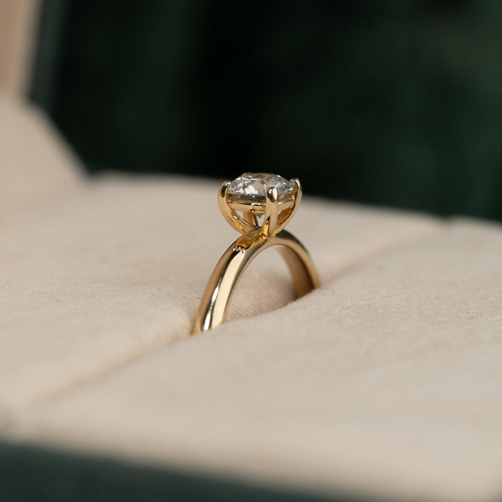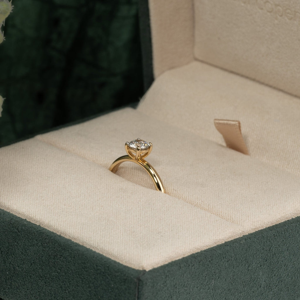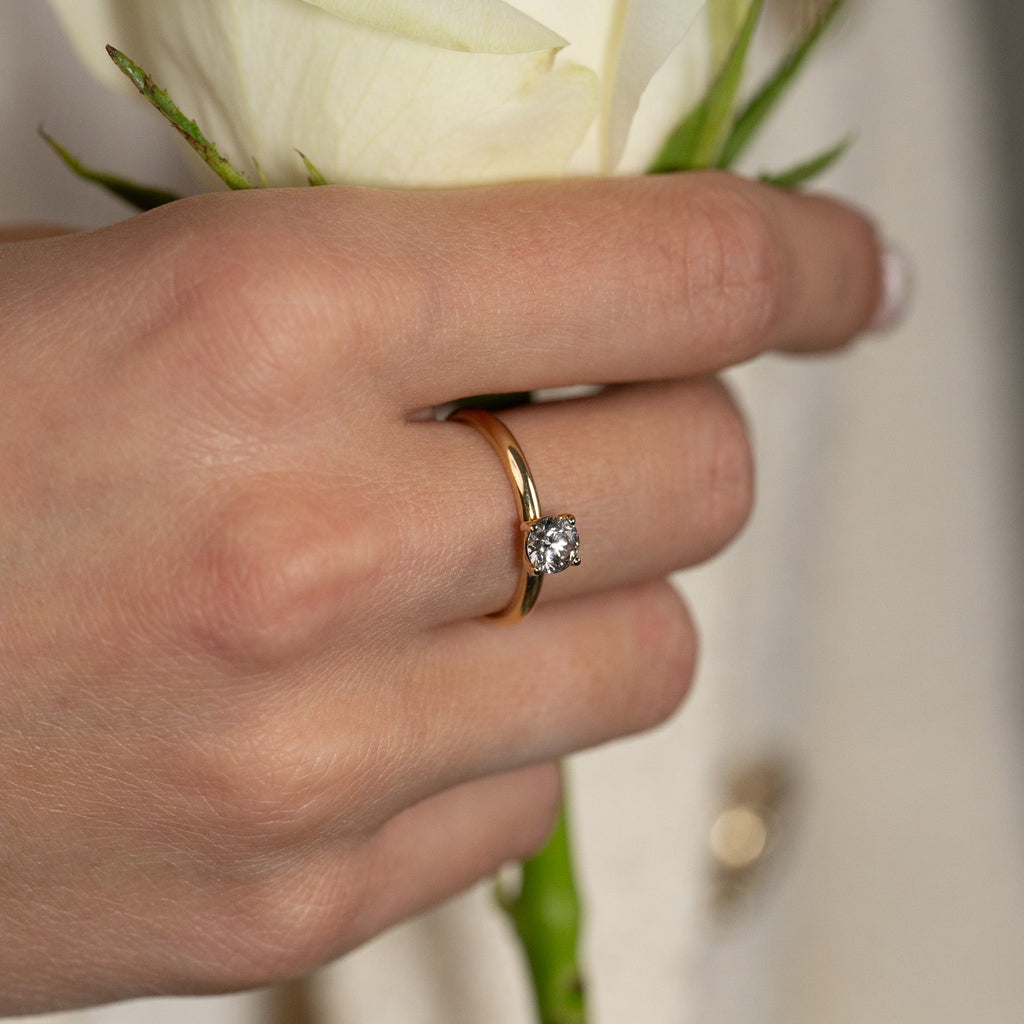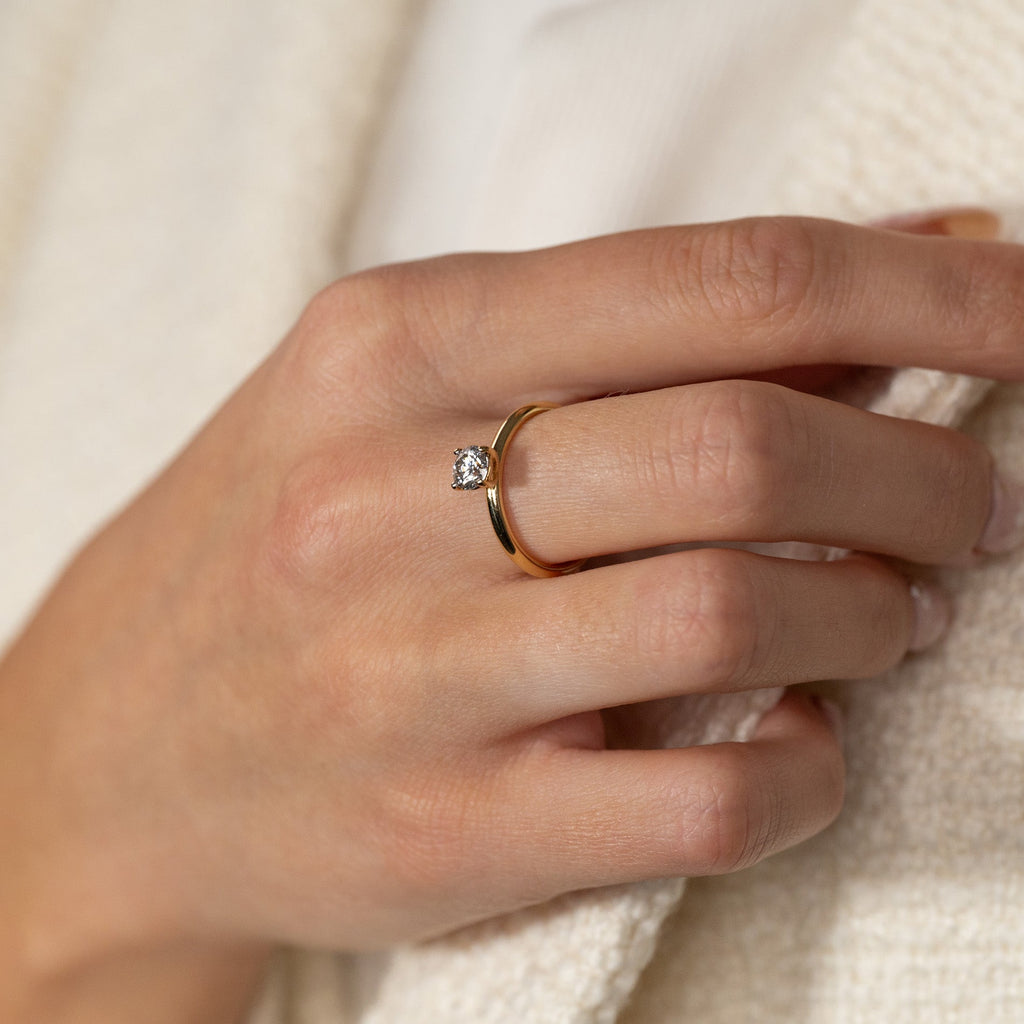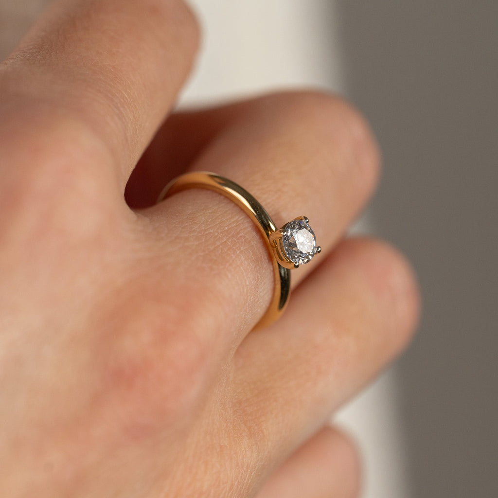 Ringen er laget i 14 karat massivt gull med en lab-grown diamant som har en vekt på 0,5 ct. (Ø5,1mm). Diamanten har fargen E/F (River) og klarhet VVS-VS. Smykket er skapt med omtanke; diamantene er produsert med blant annet solenergi, og gullet er 100% sertifisert resirkulert.