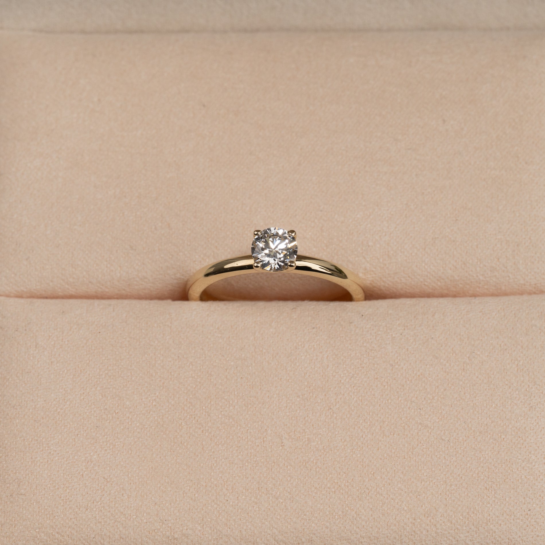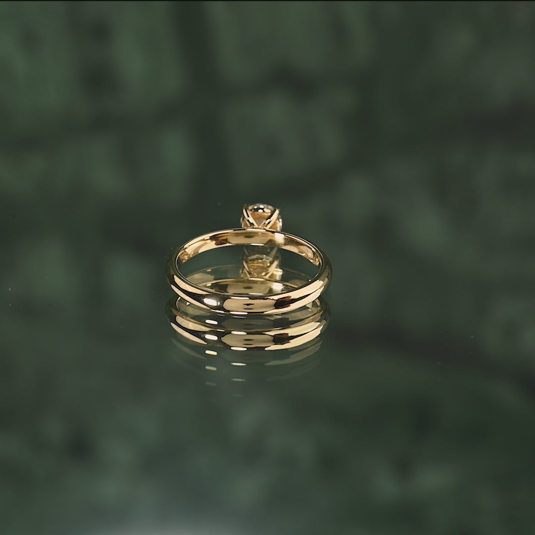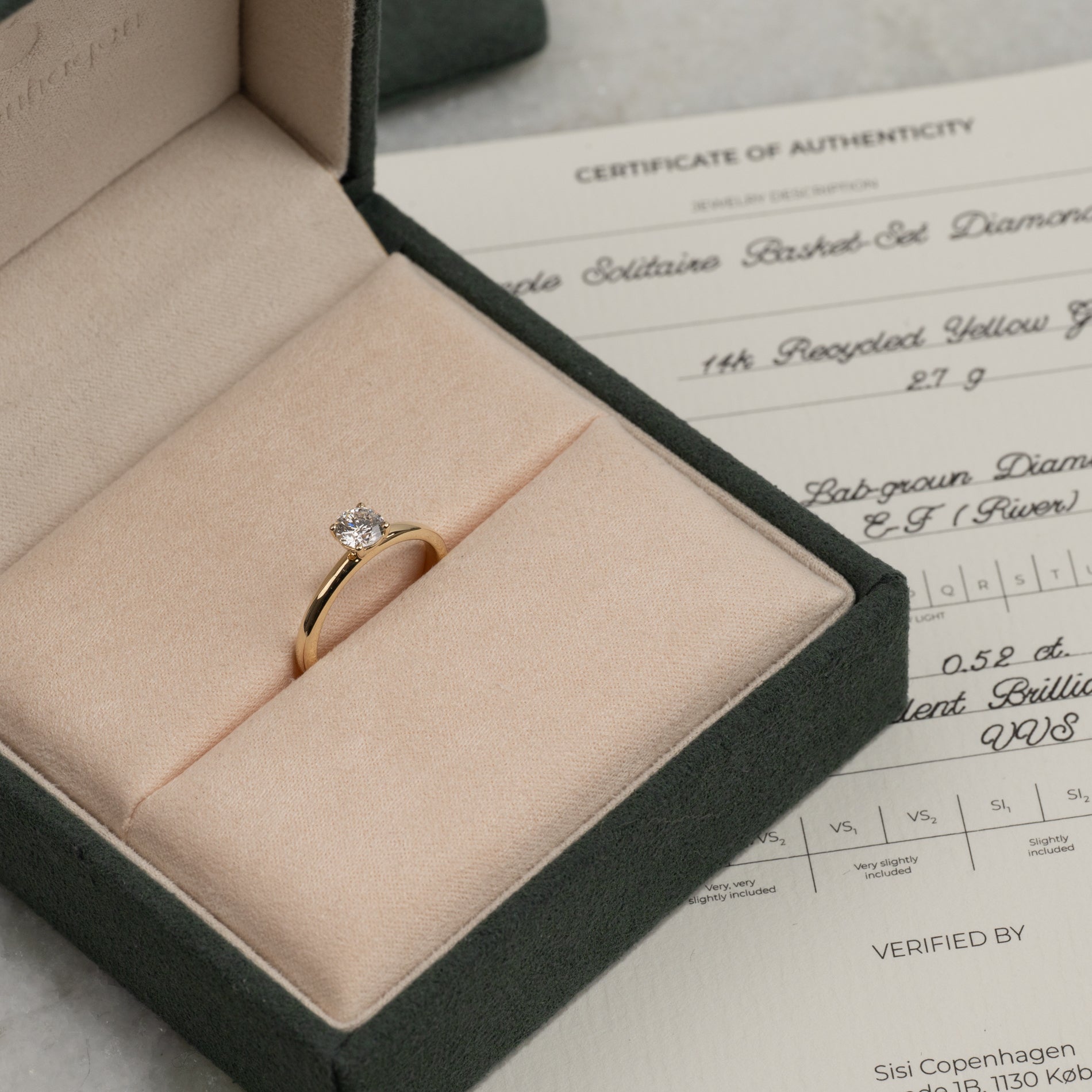 Ringen er laget i 14 karat massivt gull med en lab-grown diamant som har en vekt på 0,5 ct. (Ø5,1mm). Diamanten har fargen E/F (River) og klarhet VVS. Smykket er laget med omhu; diamantene er blant annet produsert ved hjelp av solenergi, og gullet er 100 % sertifisert resirkulert.