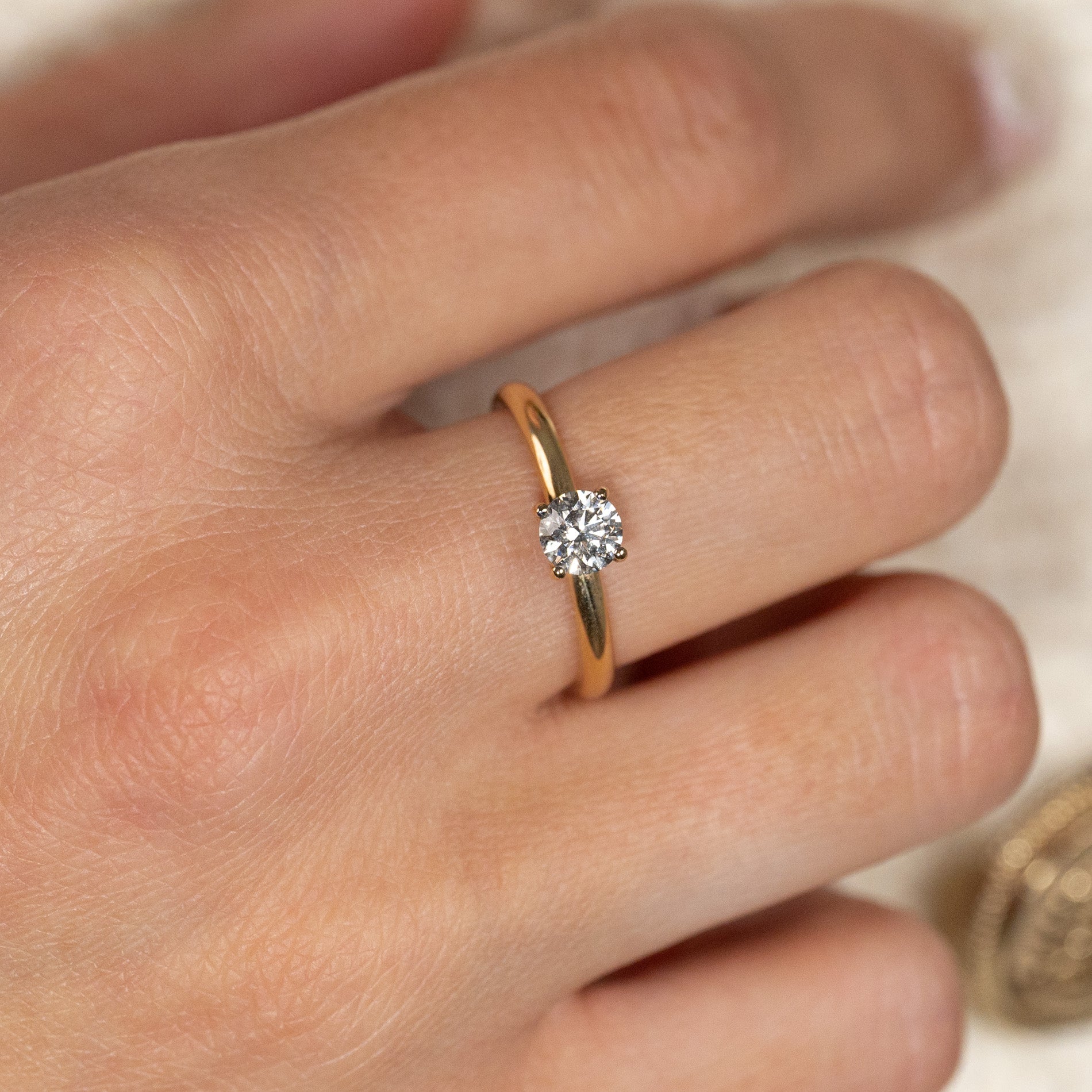 Klassisk og enkel solitaire diamantring i 14 karat gull. Den 0,5 ct. briljanslipte lab-grown diamanten sitter i en klassisk basket- omfatning, som sitter litt hevet over selve ringskinnen. Ringen er et tidløst og elegant smykke, som er perfekt som forlovelsesring.
