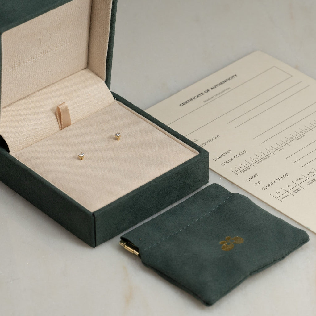 Øredobbene kommer i vår eksklusive Diamond Collection boks med en fin smykkeekse, diamant-sertifikat og pouch. Boksen er perfekt dersom smykket skal gis i gave.