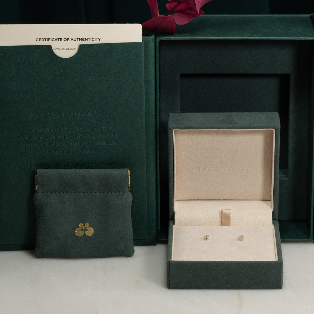 Øredobbene kommer i vår eksklusive Diamond Collection boks med en fin smykkeekse, diamant-sertifikat og pouch. Boksen er perfekt dersom smykket skal gis i gave.