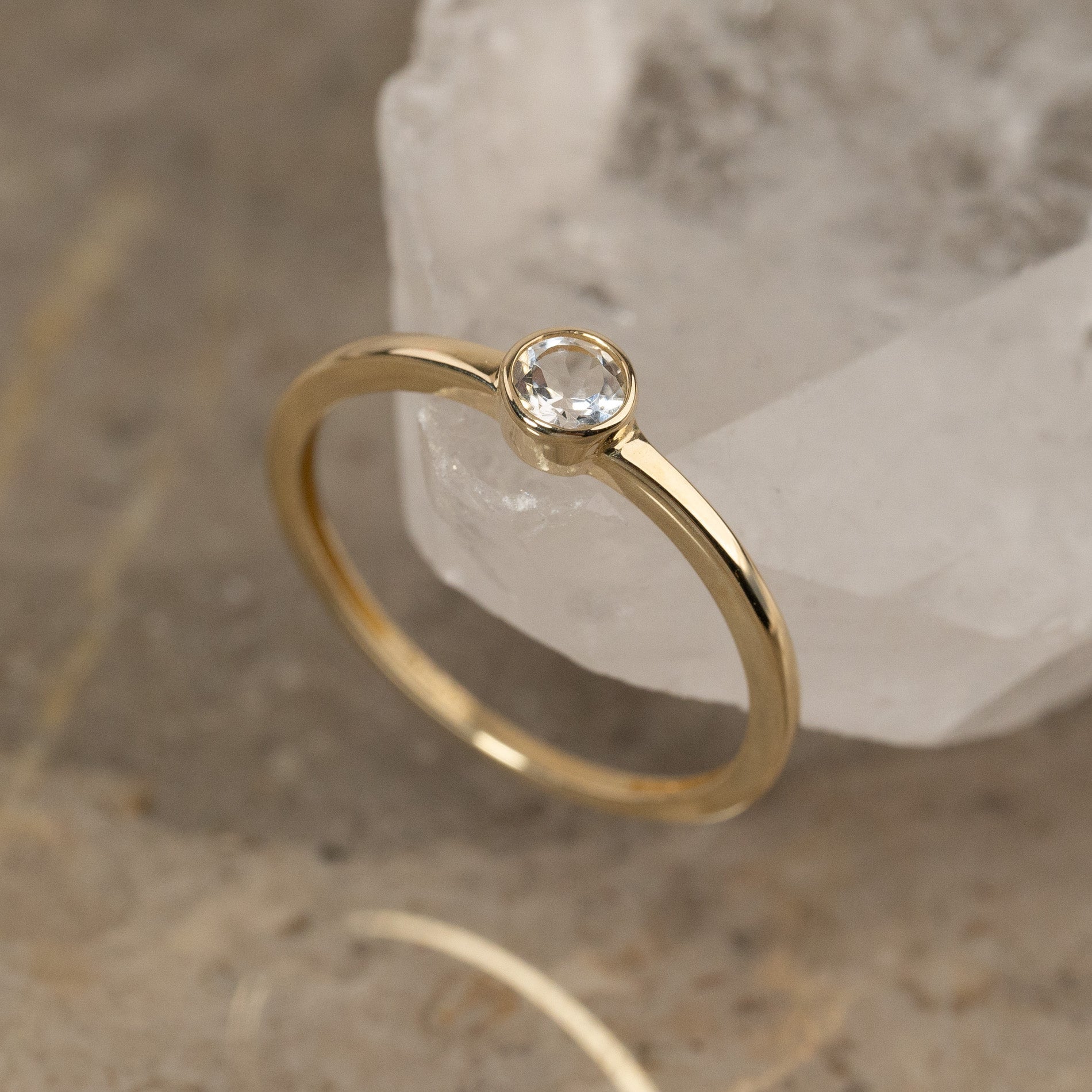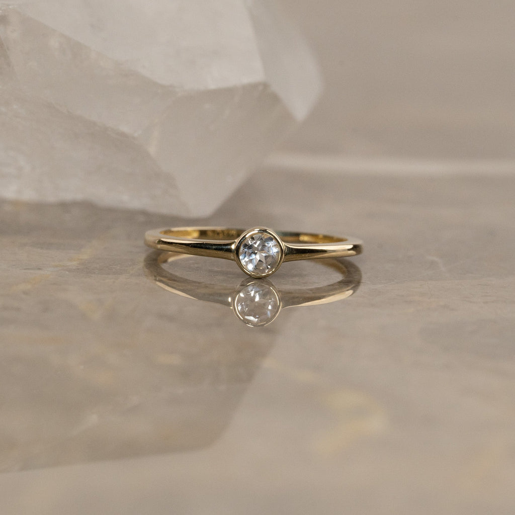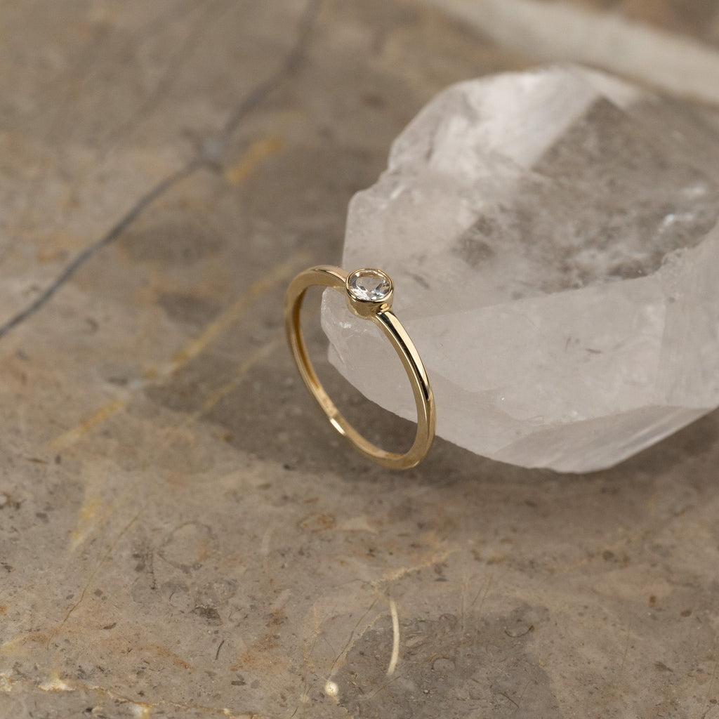 Ring i 100% resirkulert 9 karat massivt gull med en rund, fasettslipt hvit topas i en bezel-fatning.