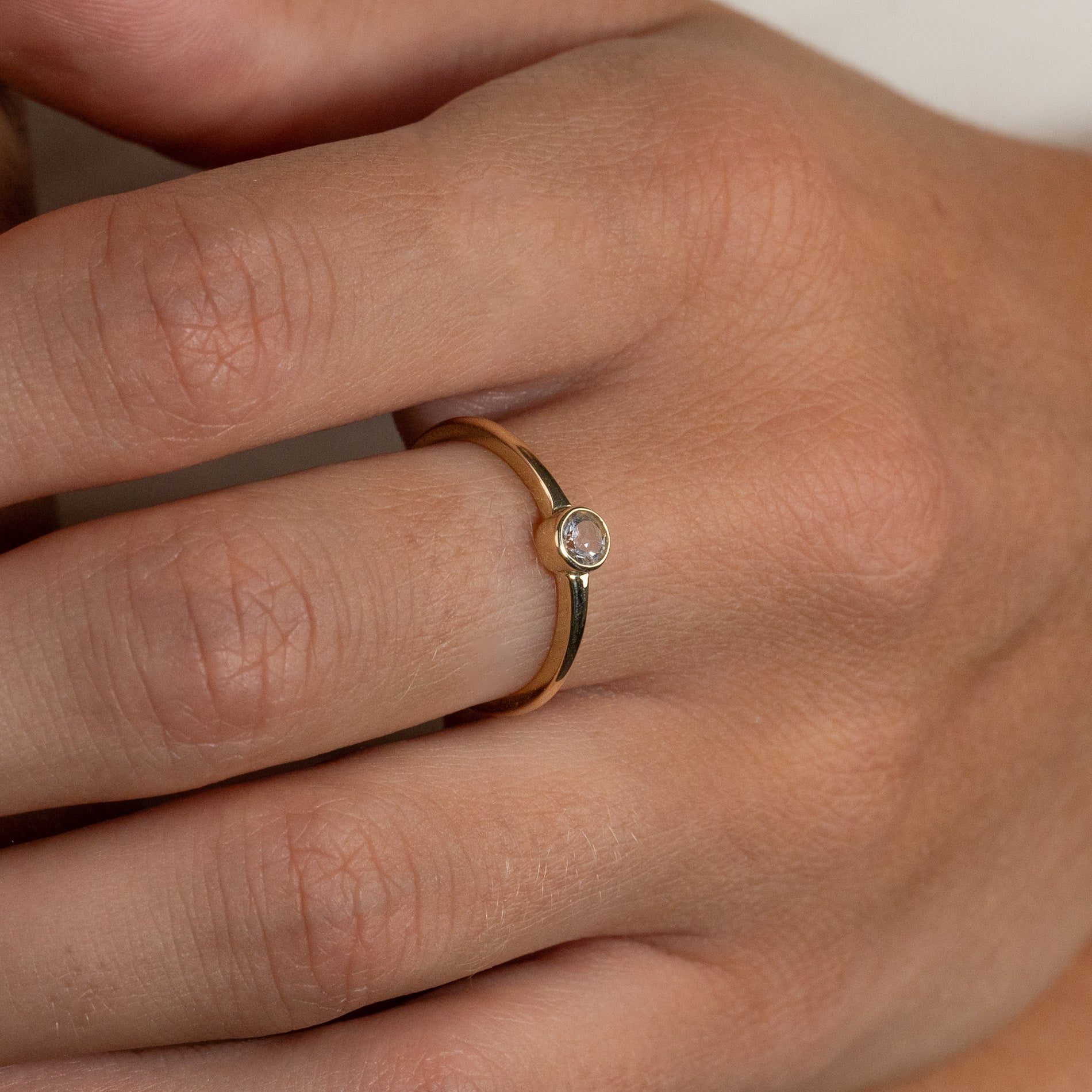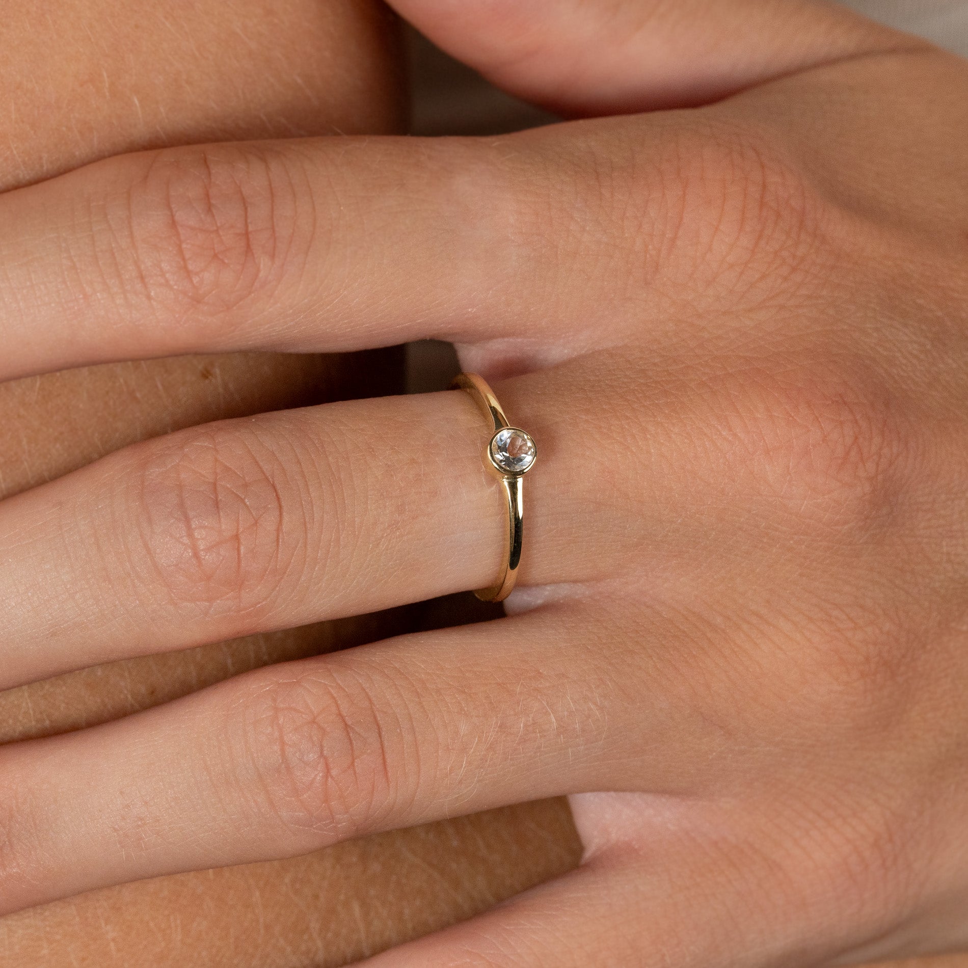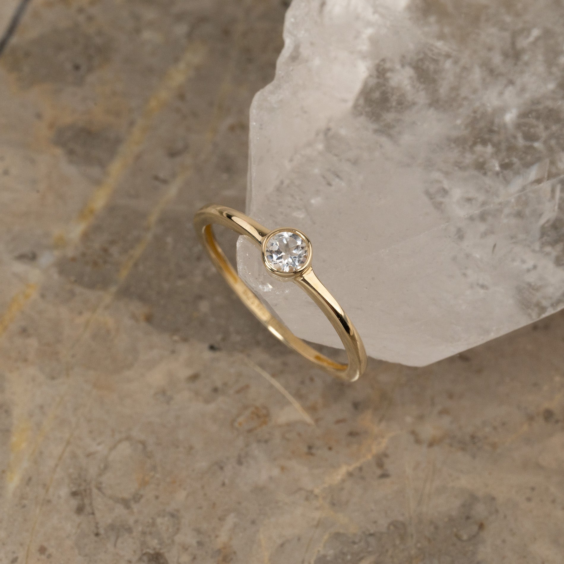 Ring i 100% resirkulert 9 karat massivt gull med en rund, fasettslipt hvit topas i en bezel-fatning.