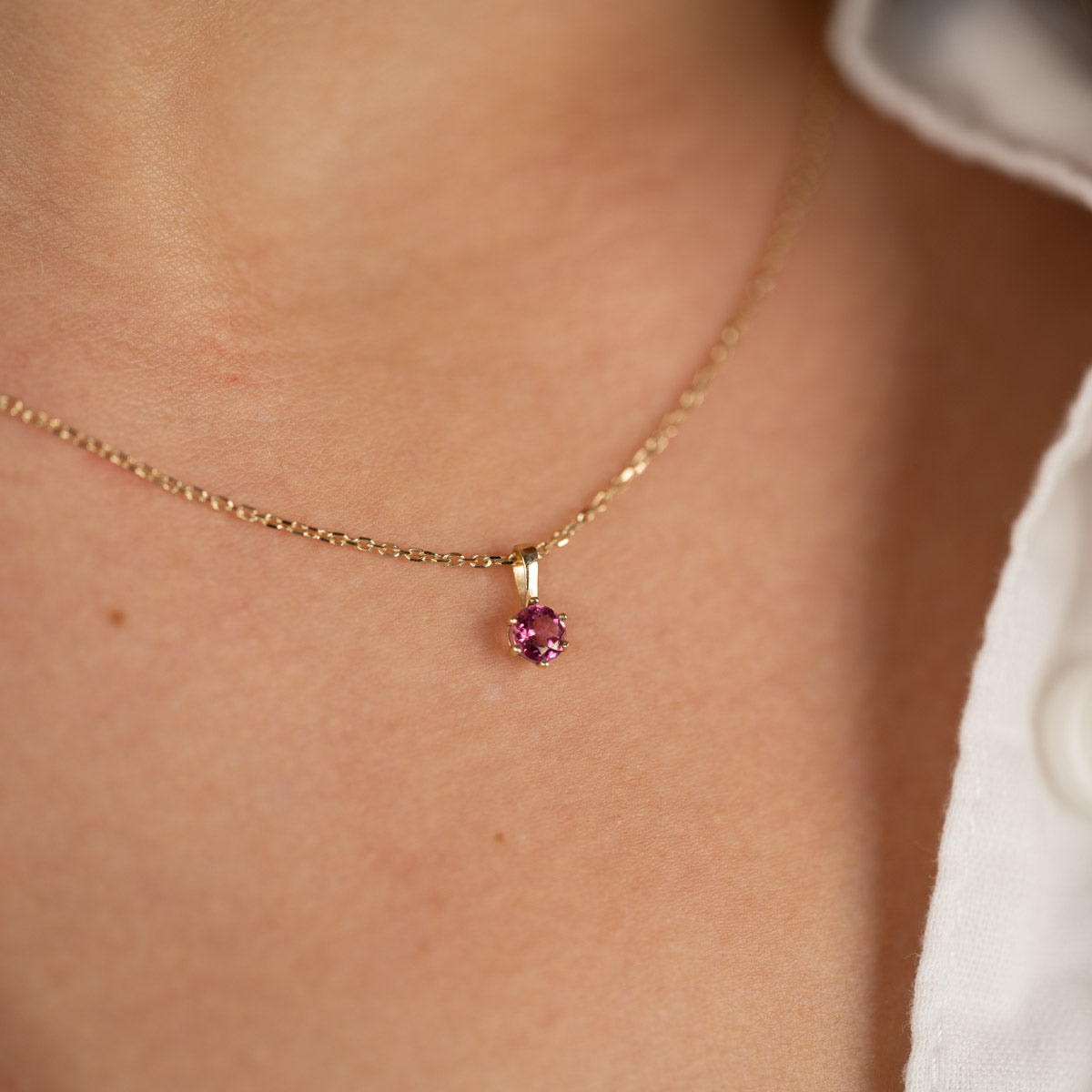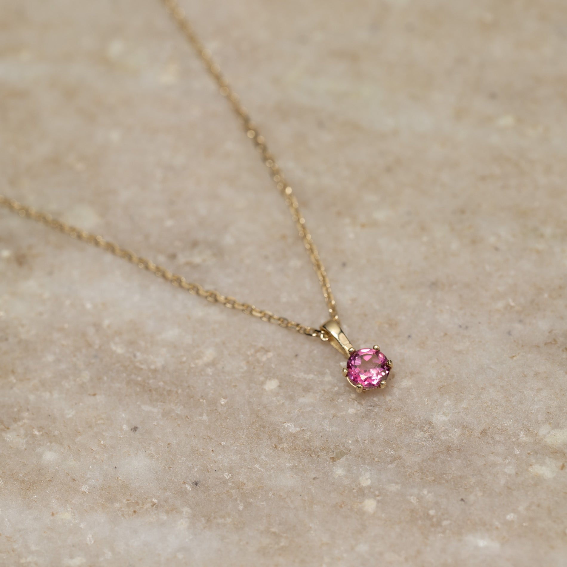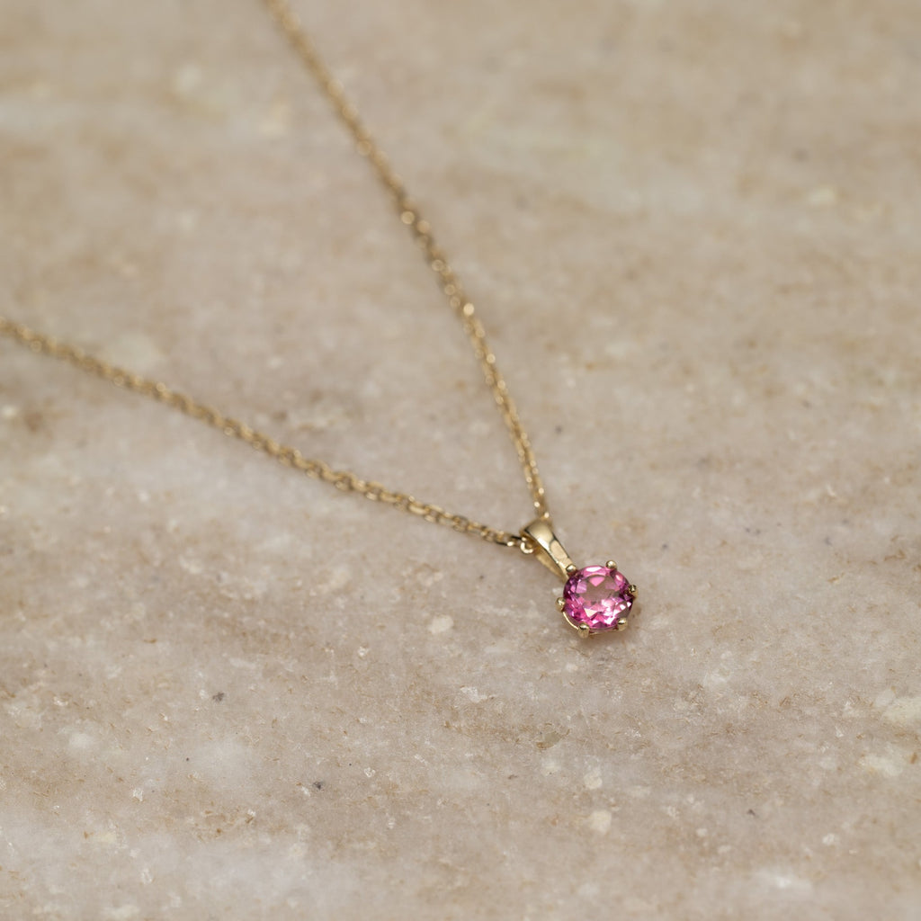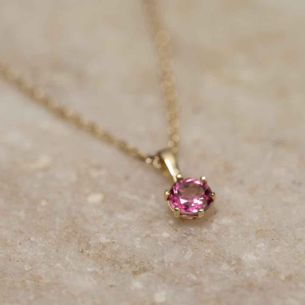 Anhenget er laget i 100% resirkulert 9 karat massivt gull, med en vakker halvedelsten av rosa topas. Anhenget er elegant, feminint og enkelt.
