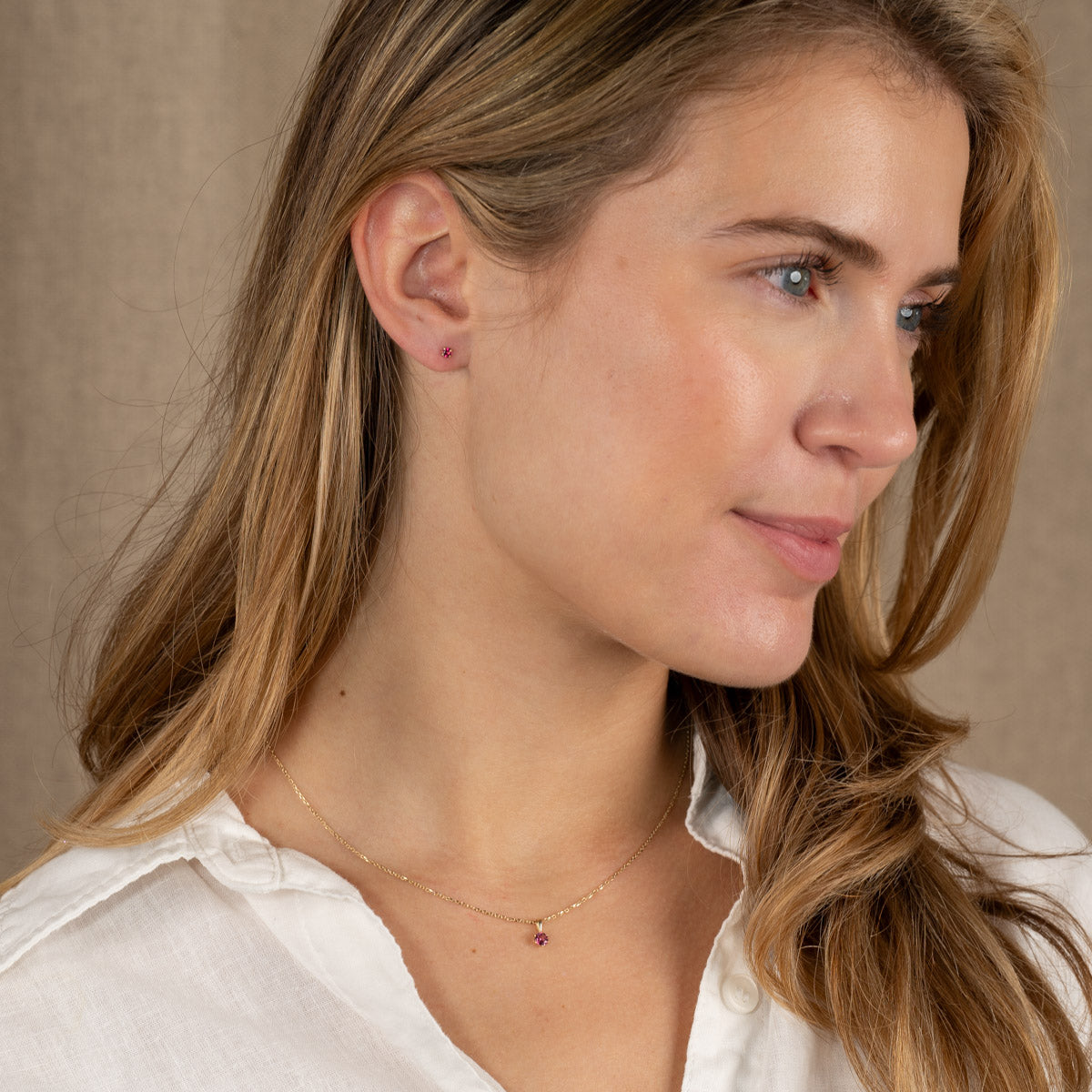 Øredobbene er laget i 100% resirkulert 9 karat massivt gull. Disse klassiske øredobbene har en fasettslipt, rosa topas som sitter i en fin er omfatning. Stenen har en diameter på 3mm.