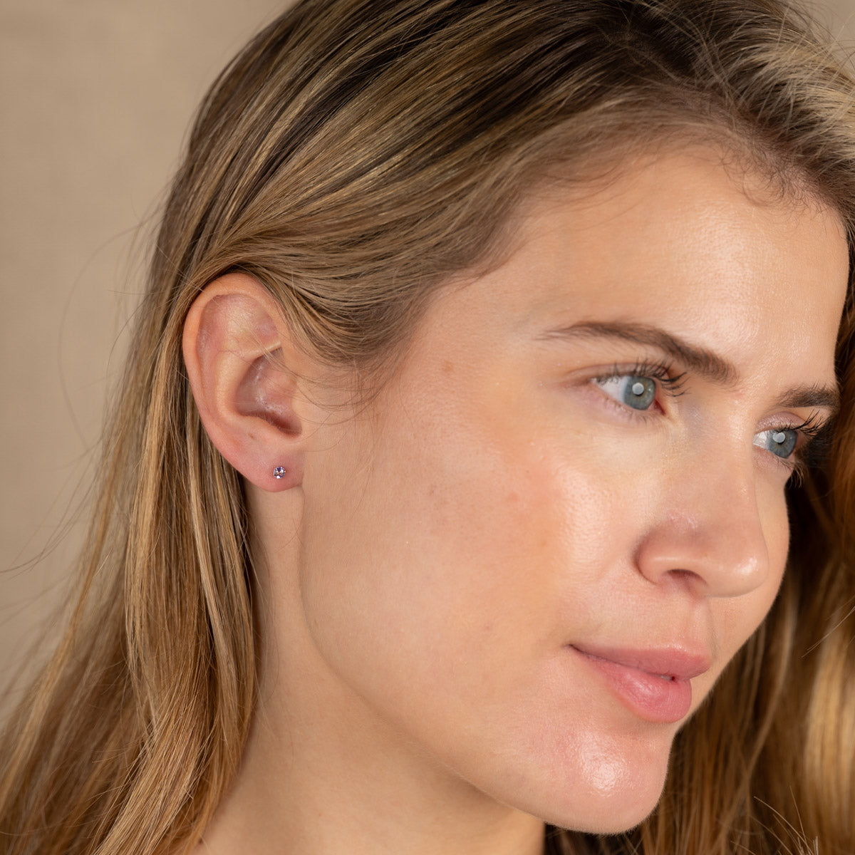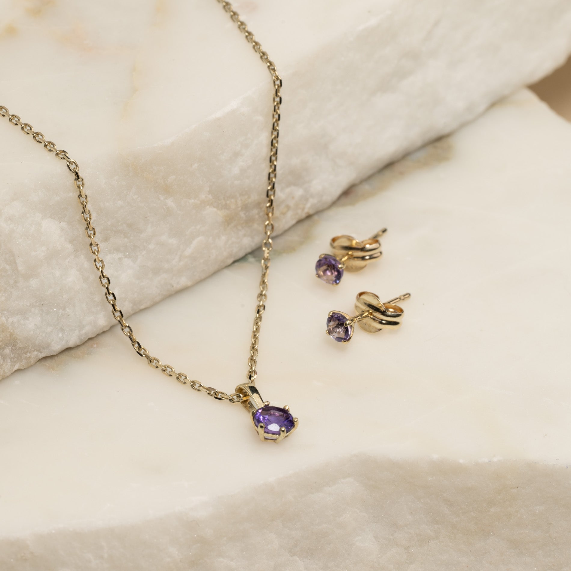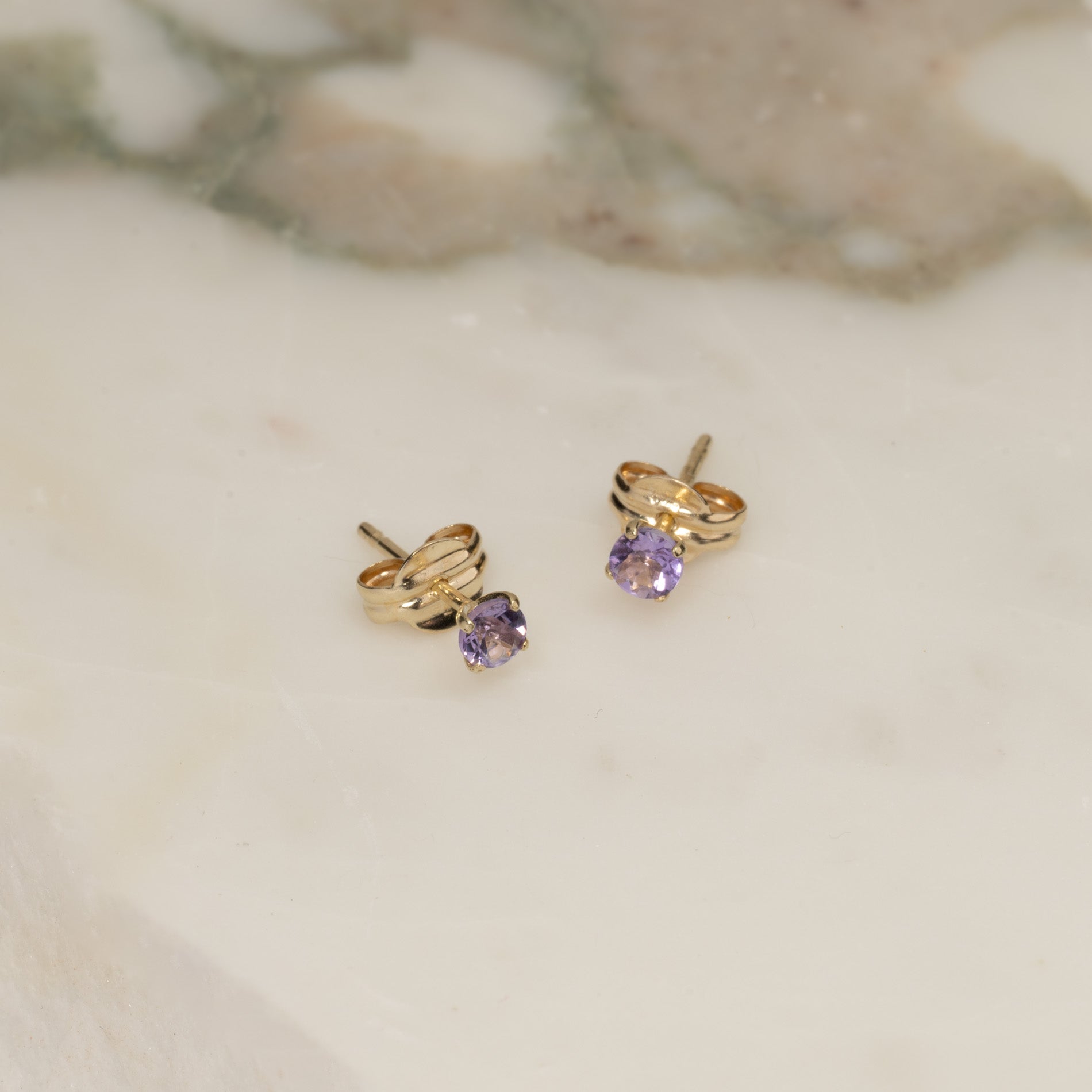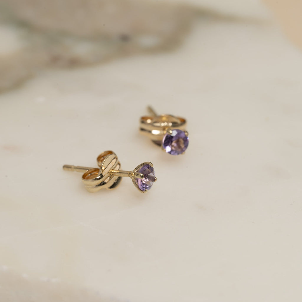 Øredobbene er laget i 100% resirkulert 9 karat massivt gull. Disse klassiske øredobbene har en fasettslipt, lilla ametyst som sitter i en fin er omfatning. Stenen har en diameter på 3mm.
