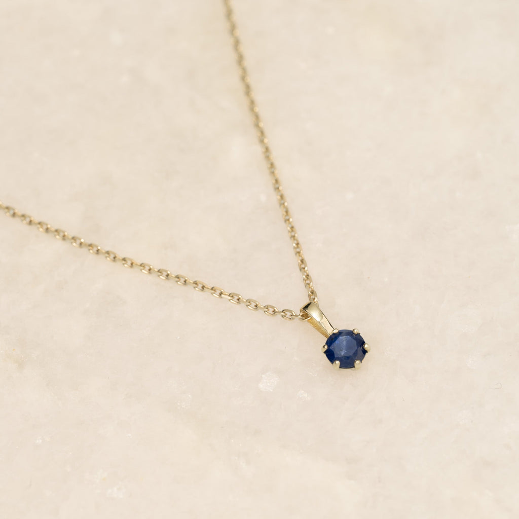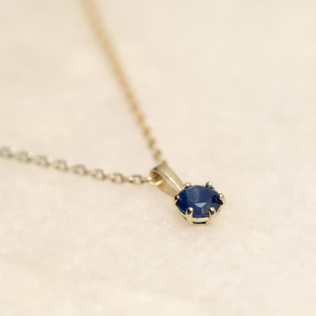 Anhenget er laget i 100% resirkulert 9 karat massivt gull, med en vakker halvedelsten av blå safir. Anhenget er elegant, feminint og enkelt.