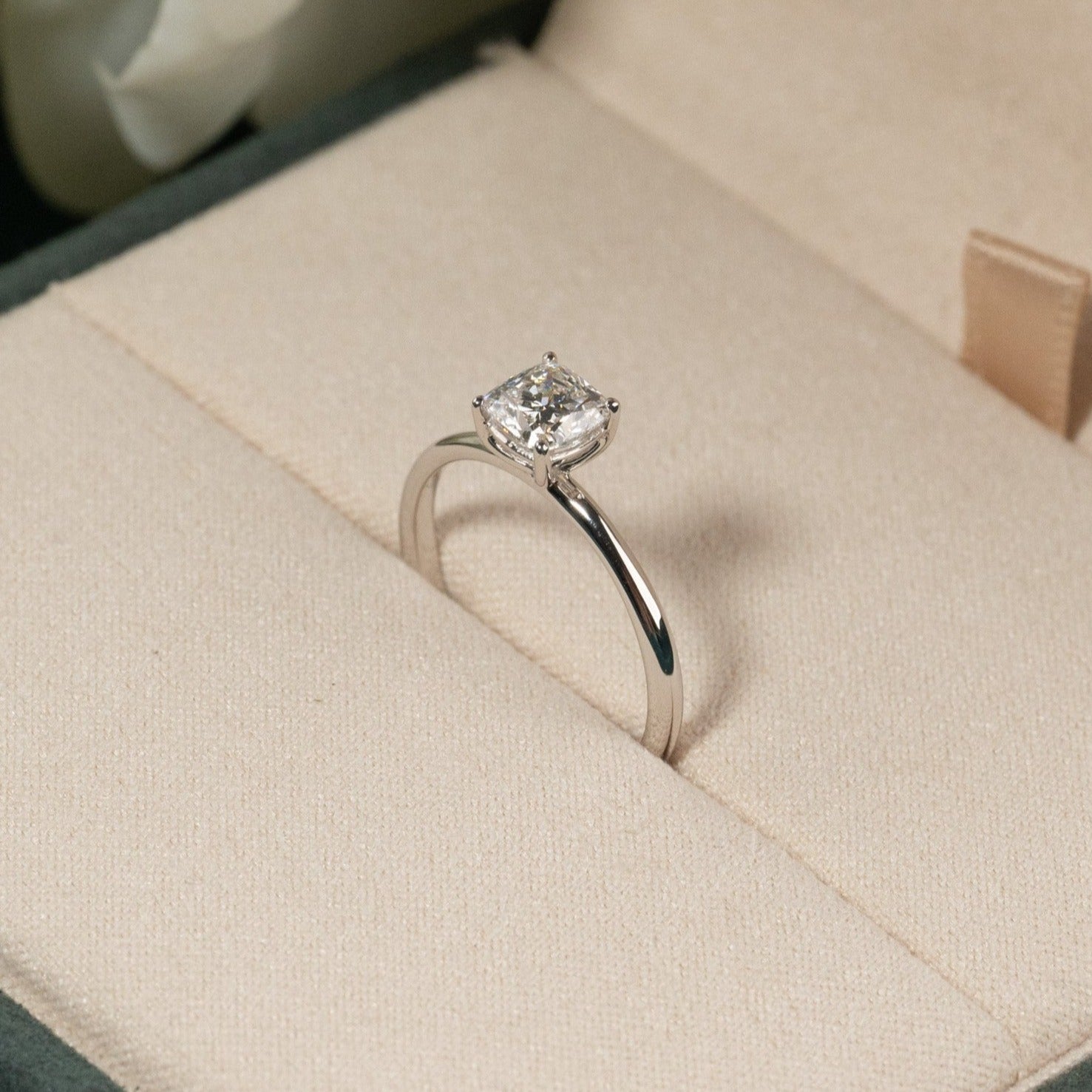 Elegant Solitaire ring i 14 karat massivt hvitt gull med 0,75 ct. cushionslipt laboratoriedyrket diamant. Diamanten sitter i en klassisk kurvomfatning. Cushion-slipen kombinerer et firkantet uttrykk med myke former - akkurat som en pute. Kombinasjonen av den minimalistiske ringskinnen, den klassiske kurvomfatningen og den spesielle puteslipingen gir en vakker og tidløs ring med både moderne og klassiske referanser. Ringen er den perfekte gaven til noen du er glad i og bryr deg om – eller den perfekte forlovelsesringen.