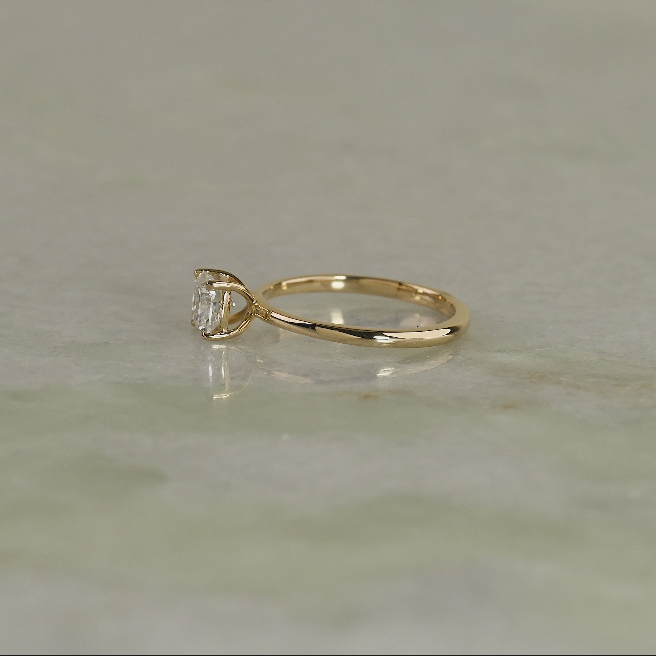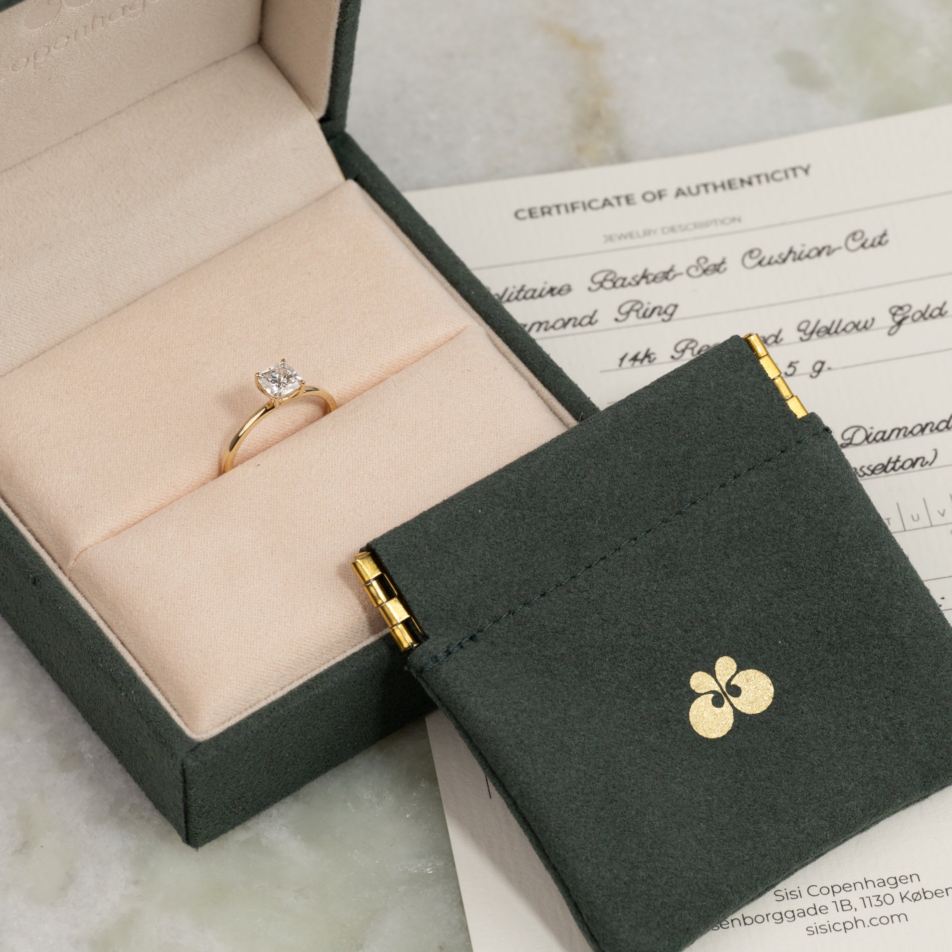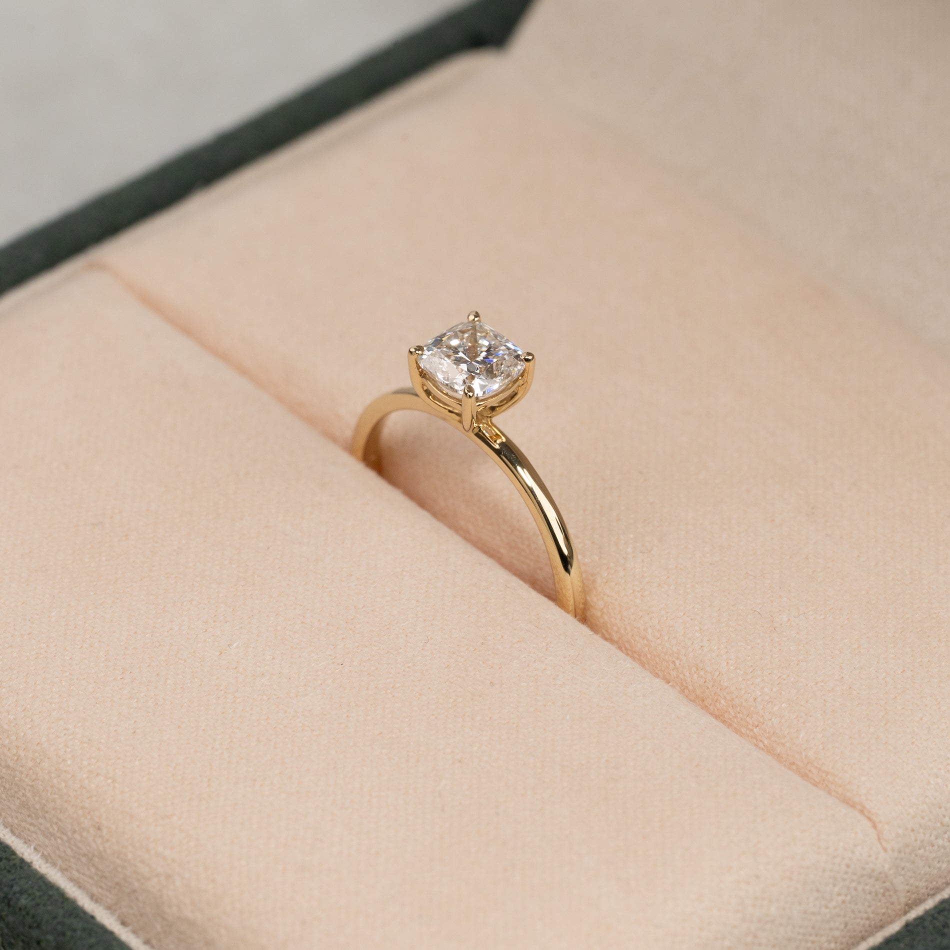Elegant Solitaire ring i 14 karat massivt gull med 0,75 ct. cushionslipt laboratoriedyrket diamant. Diamanten sitter i en klassisk kurvomfatning. Cushion-slipen kombinerer et firkantet uttrykk med myke former - akkurat som en pute. Kombinasjonen av den minimalistiske ringskinnen, den klassiske kurvomfatningen og den spesielle puteslipingen gir en vakker og tidløs ring med både moderne og klassiske referanser. Ringen er den perfekte gaven til noen du er glad i og bryr deg om – eller den perfekte forlovelsesringen.
