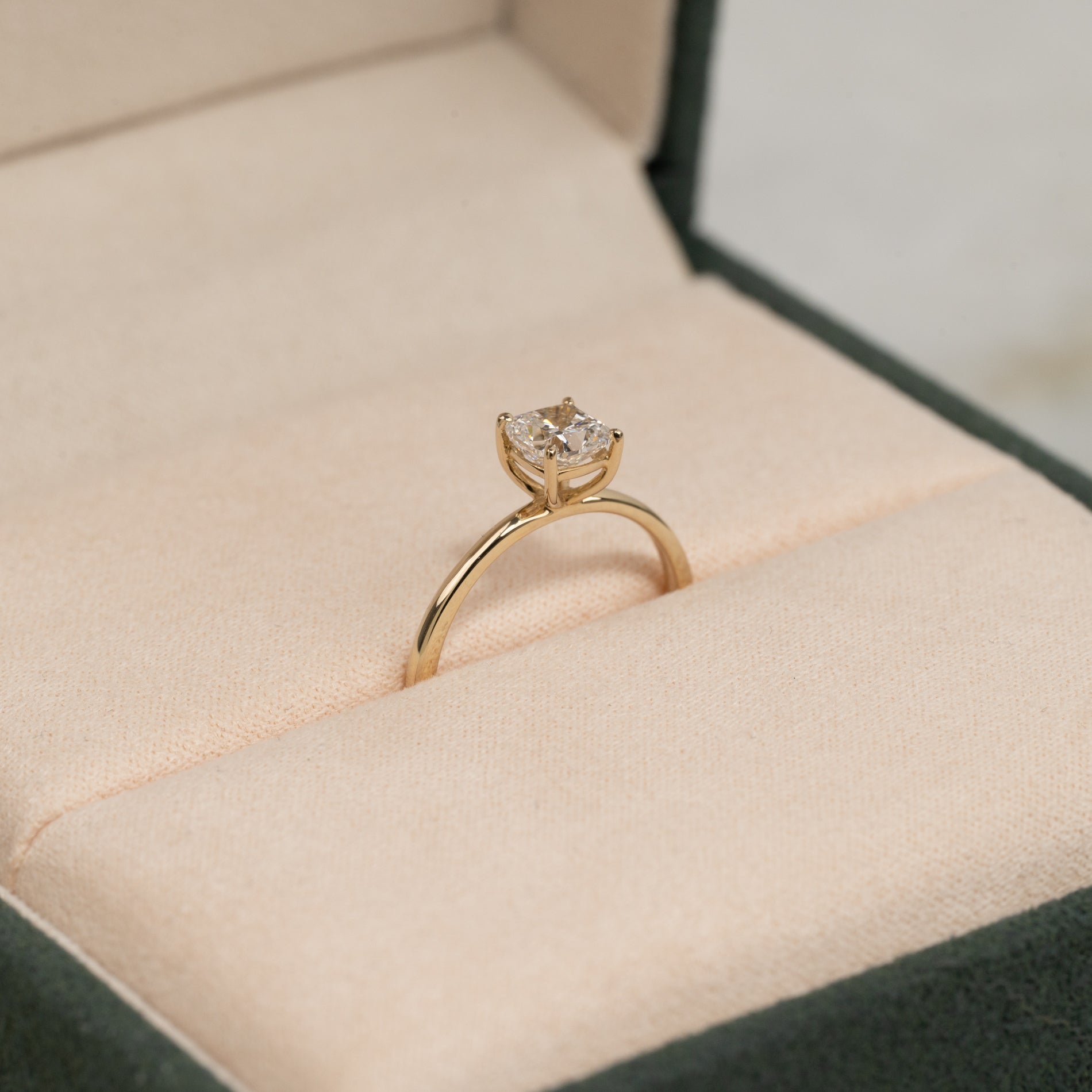 Ringen er laget av 14 karat massivt gull med 0,75 ct. lab-dyrket diamant. Diamanten har en fargen E/F (River) og klarhet VVS. Diamanten måler 5,2 x 5,2 mm. Smykket er laget med omhu; diamantene er blant annet produsert ved hjelp av solenergi, og gullet er 100 % sertifisert resirkulert.