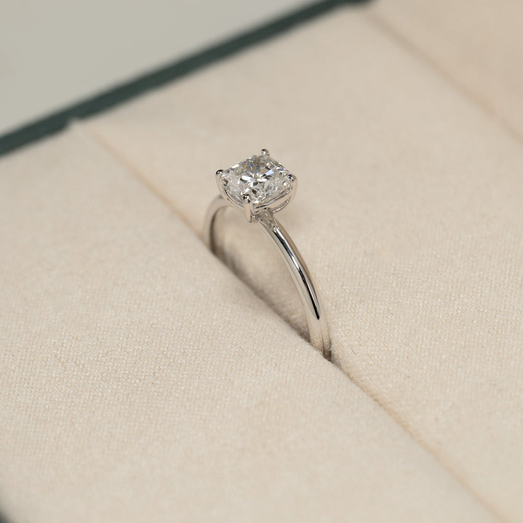Kombinasjonen av den minimalistiske ringskinnen, den klassiske omfatningen og den litt spesielle cushion-slipningen gir et tidløst og vakkert uttrykk, med moderne og klassiske referanser. Ringen er den perfekte gave til den man elsker, eller som forlovelsesring.