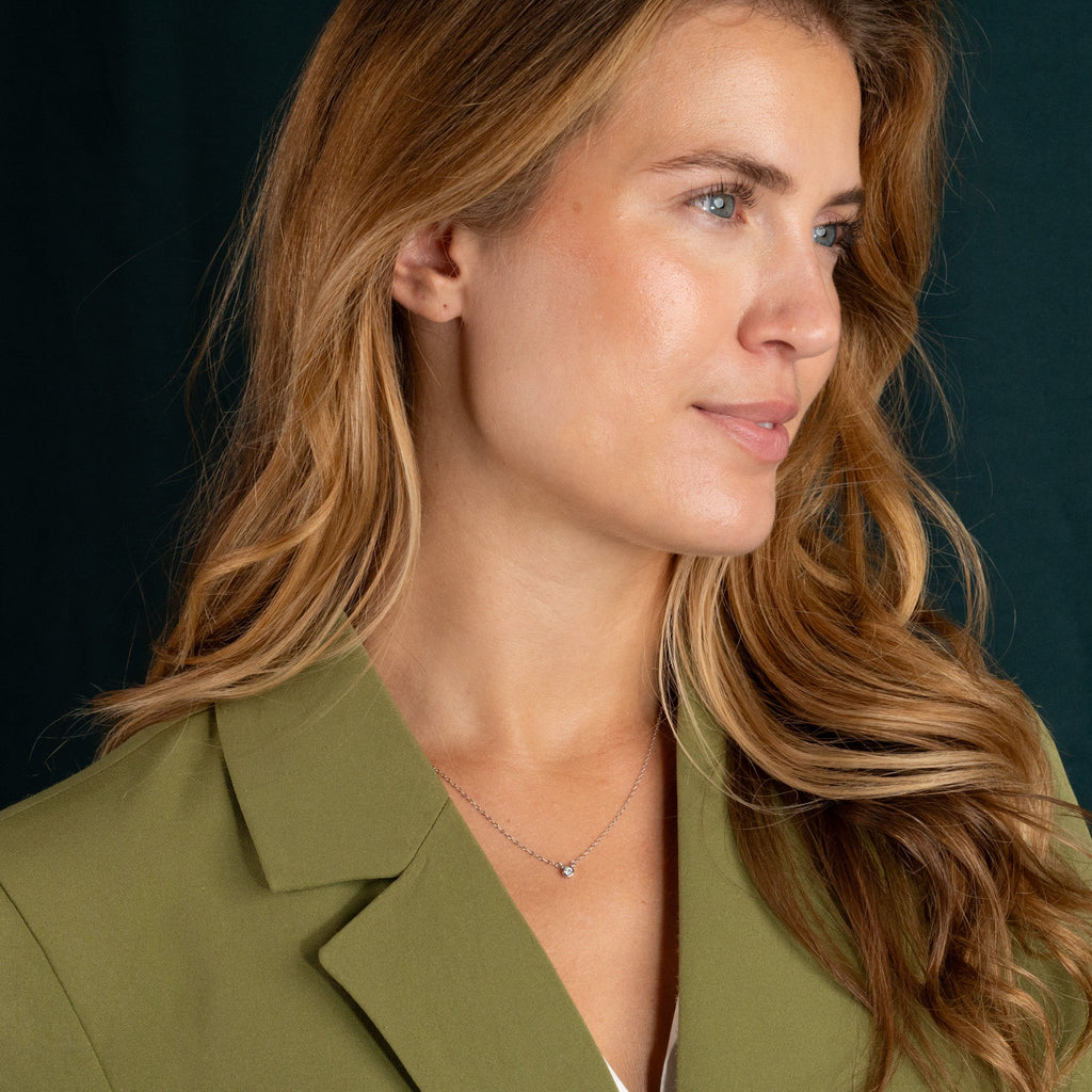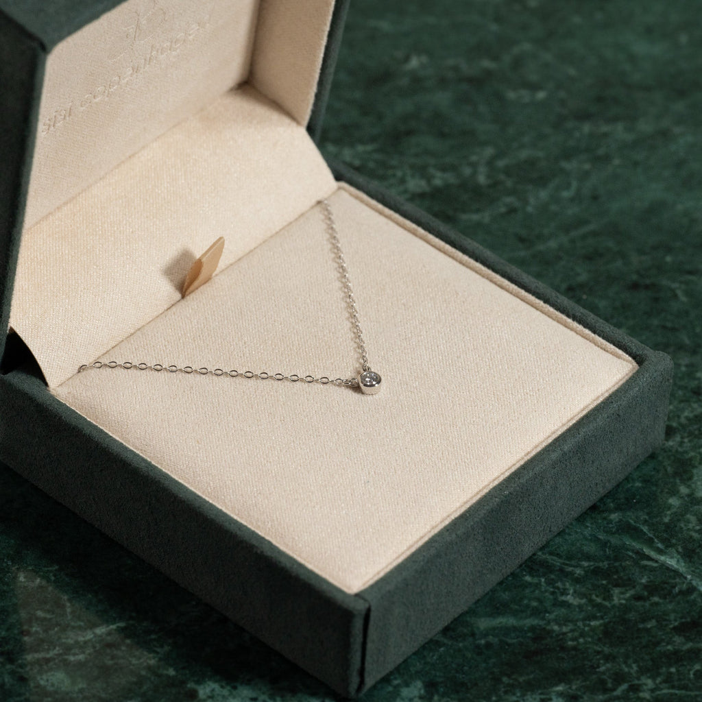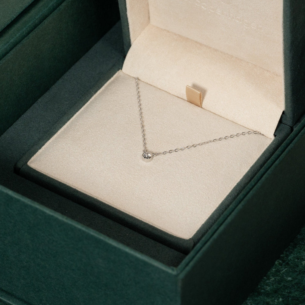 Halskjeden er laget i 14 karat massivt hvitt gull med en etisk skapt lab-grown diamant som har en vekt på 0,1 ct. (Ø: 3 mm). Diamanten har fargen E/F (River/Top Wesselton) og klarheten VVS-VS. Diamanten er skapt med grønn energi - hovedsakelig fra solenergi. Gullet er sertifisert 100% resirkulert.