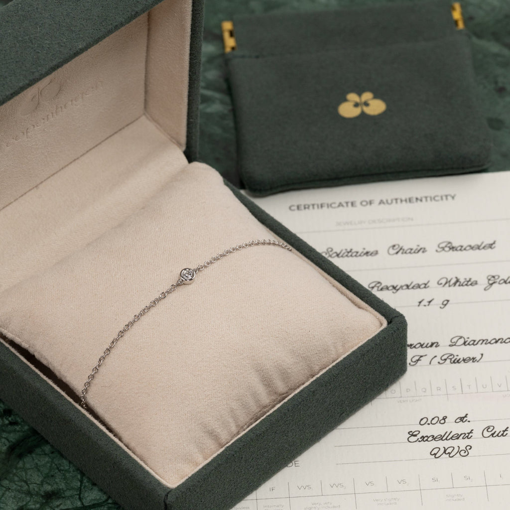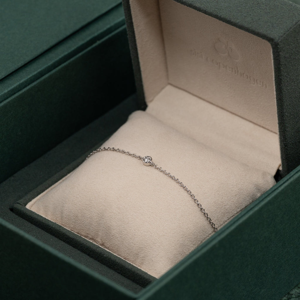 Armbåndet er laget i 14 karat massivt hvitt gull og prydet med en 0,08 ct lab-grown diamant. Diamanten har fargen E/F (River) og klarheten VVS. Smykket er skapt med omtanke, diamanten er fremstilt med blant annet solenergi, og gullet er 100 % sertifisert resirkulert.