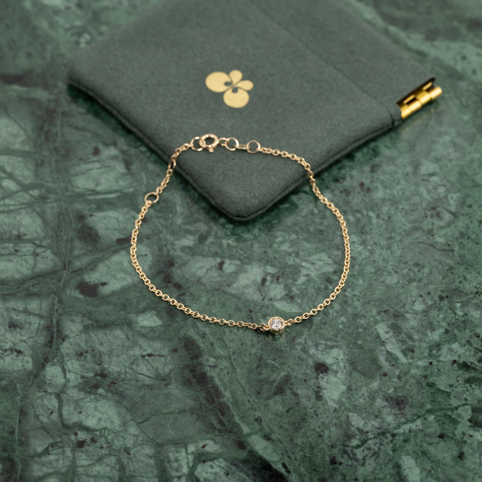 Armbåndet er laget i 14 karat massivt gull og prydet med en 0,08 ct lab-grown diamant. Diamanten har fargen E/F (River) og klarheten VVS. Smykket er skapt med omtanke – diamanten er fremstilt med blant annet solenergi, og gullet er 100 % sertifisert resirkulert.