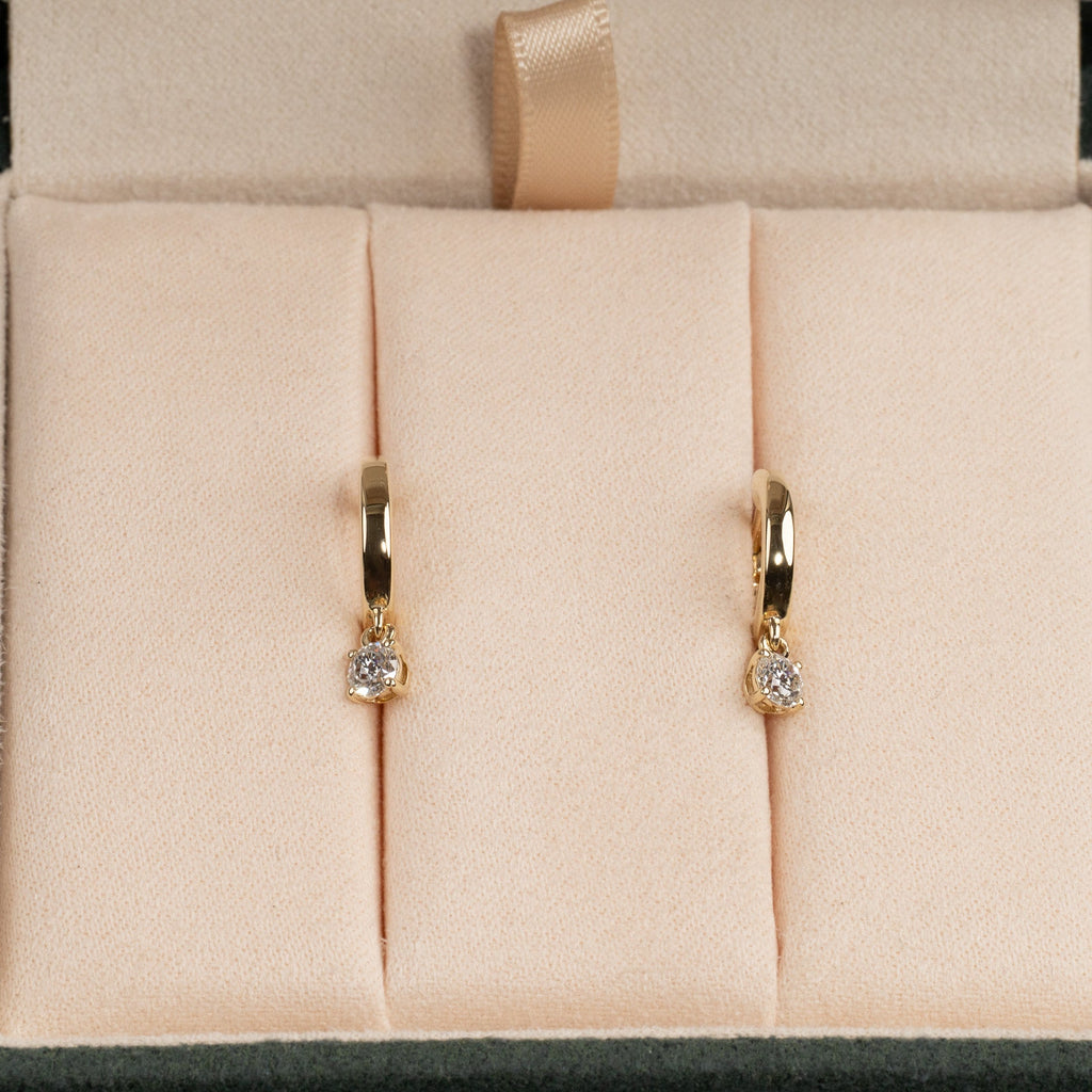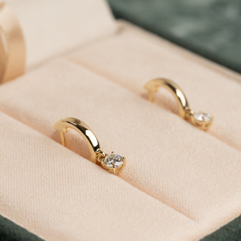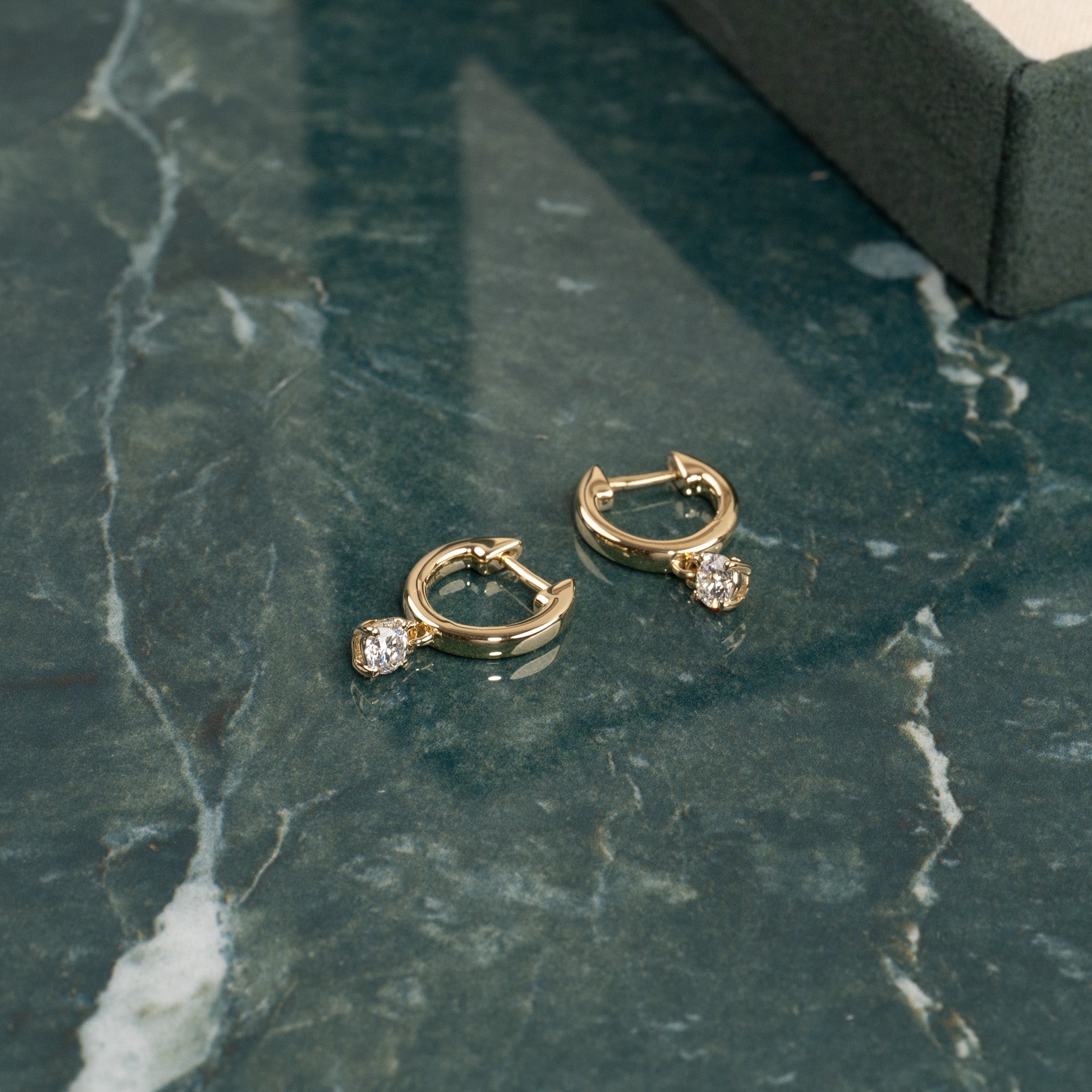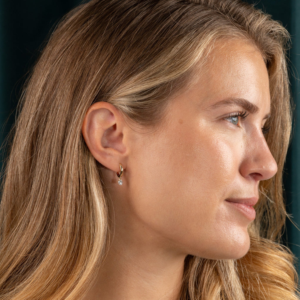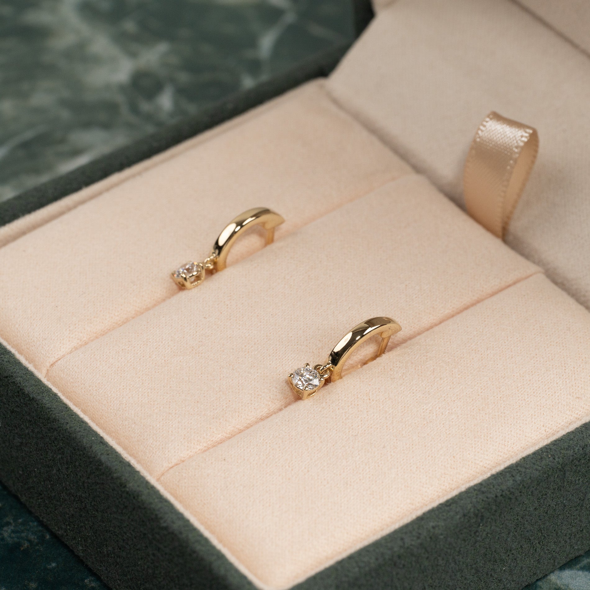 Elegante creoler i 14 karat gull med en enkel briljantsleben diamant i et vedheng under hver creol. Det tidløse og moderne design gjør dem perfekte til både hverdagsbruk og til festlige begivenheter.