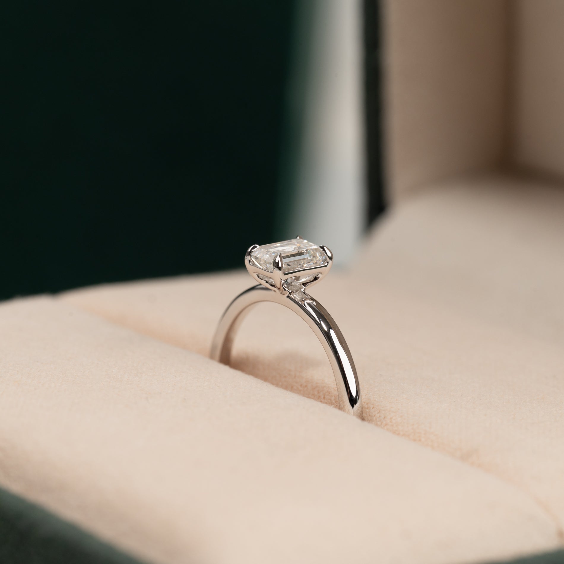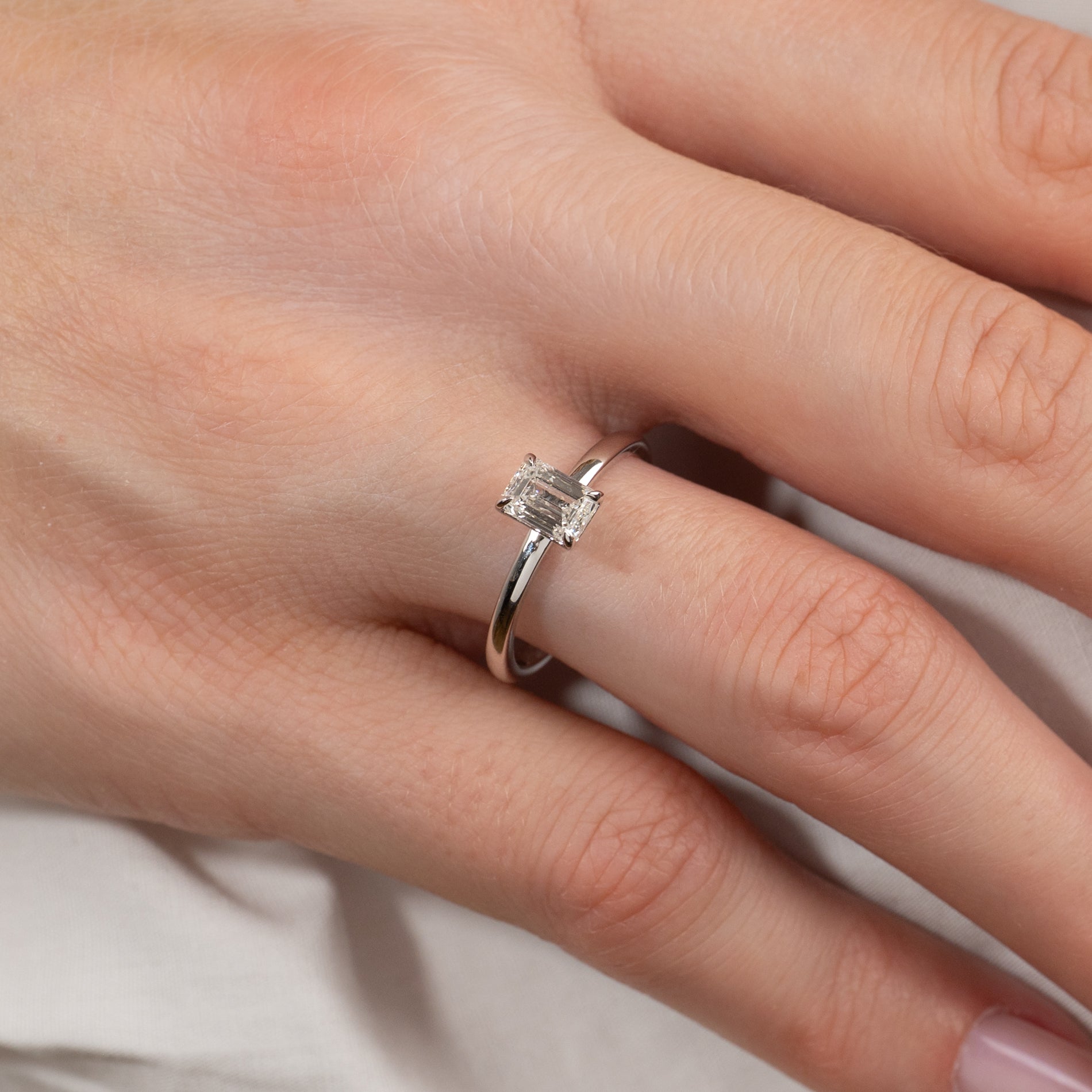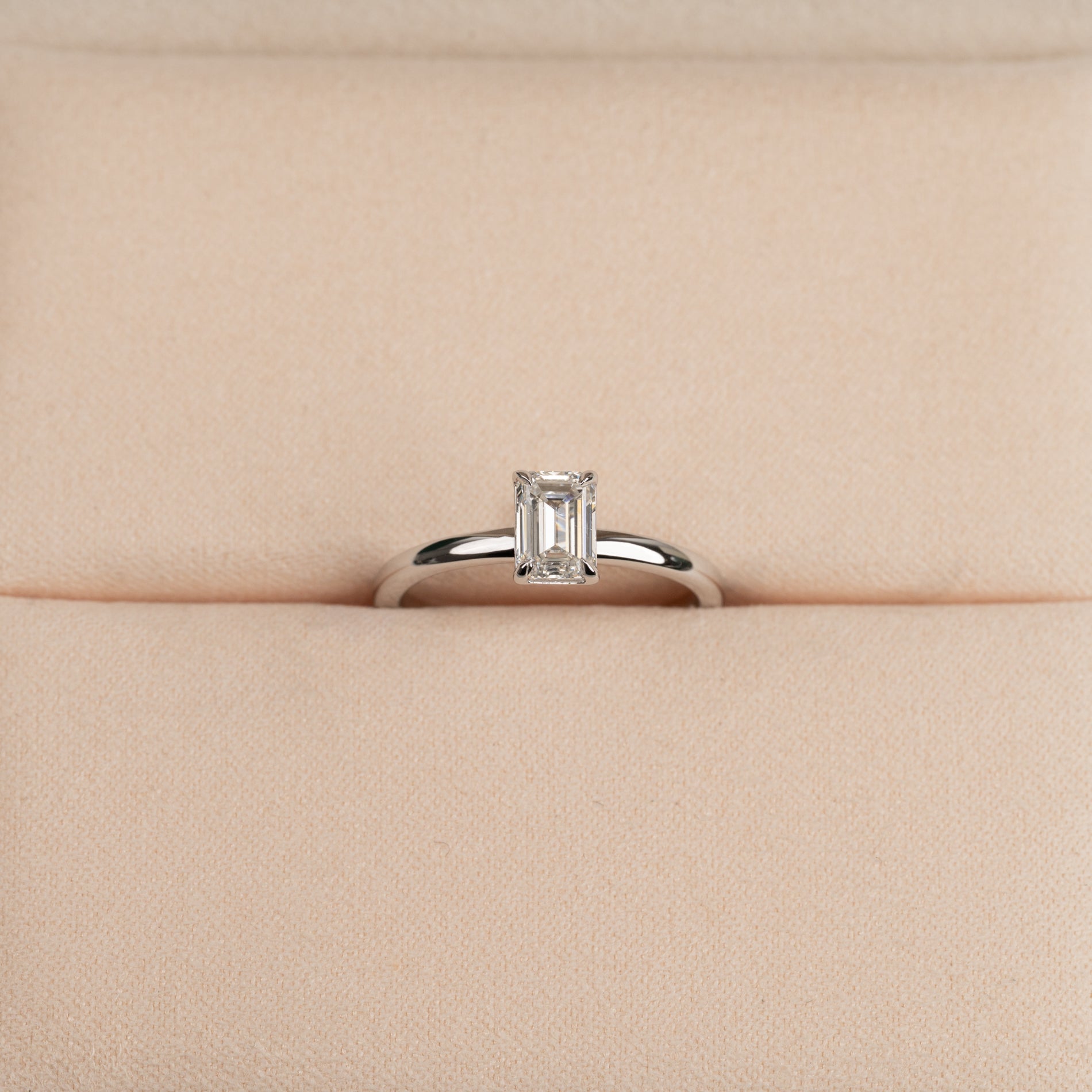 En tidløs ring i 14 karat hvitt gull med en vakker emeraldslipt laboratoriedyrket diamant på 0,75 ct. Diamanten er elegant satt i en lett hevet basket-innfatning som fremhever den klare, speilende glansen og de karakteristiske trinnslipte fasettene som kjennetegner emeraldslip.