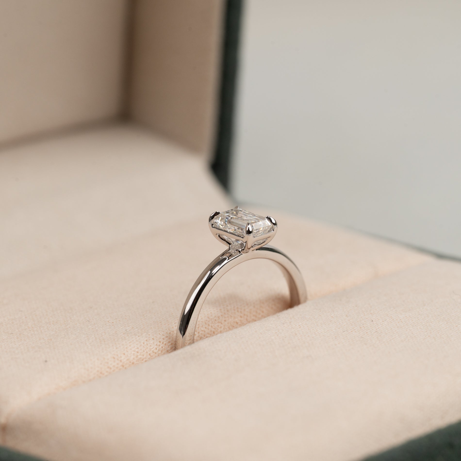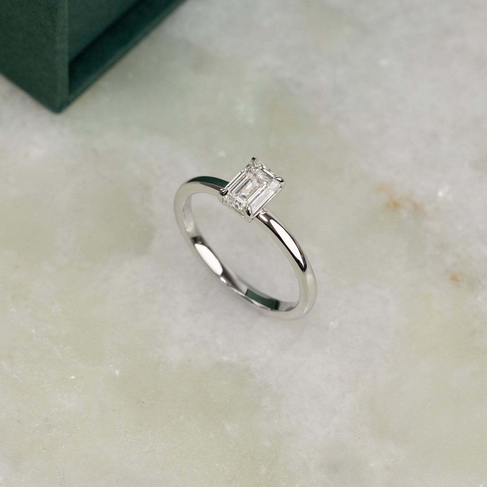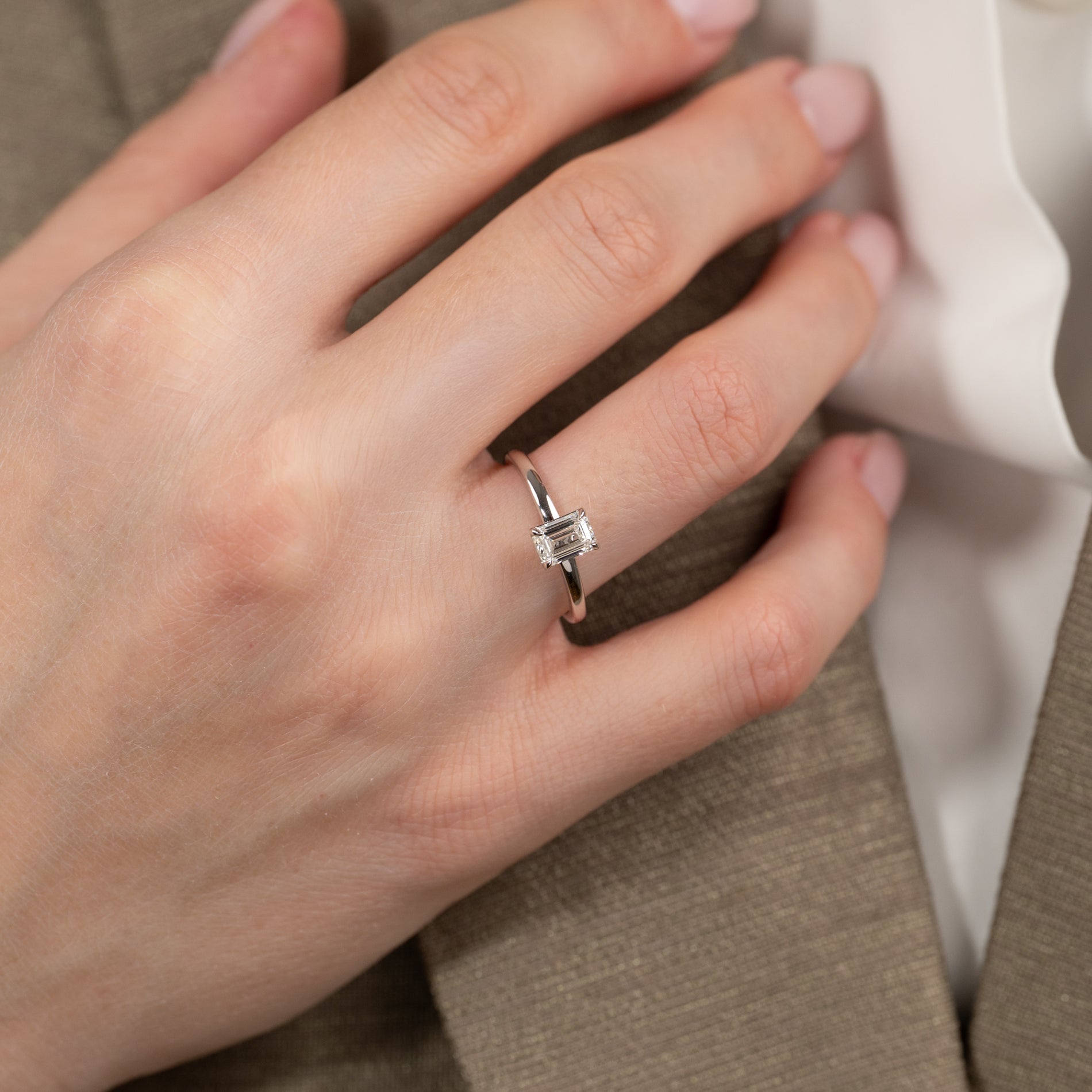 En tidløs ring i 14 karat hvitt gull med en vakker emeraldslipt laboratoriedyrket diamant på 0,75 ct. Diamanten er elegant satt i en lett hevet basket-innfatning som fremhever den klare, speilende glansen og de karakteristiske trinnslipte fasettene som kjennetegner emeraldslip.