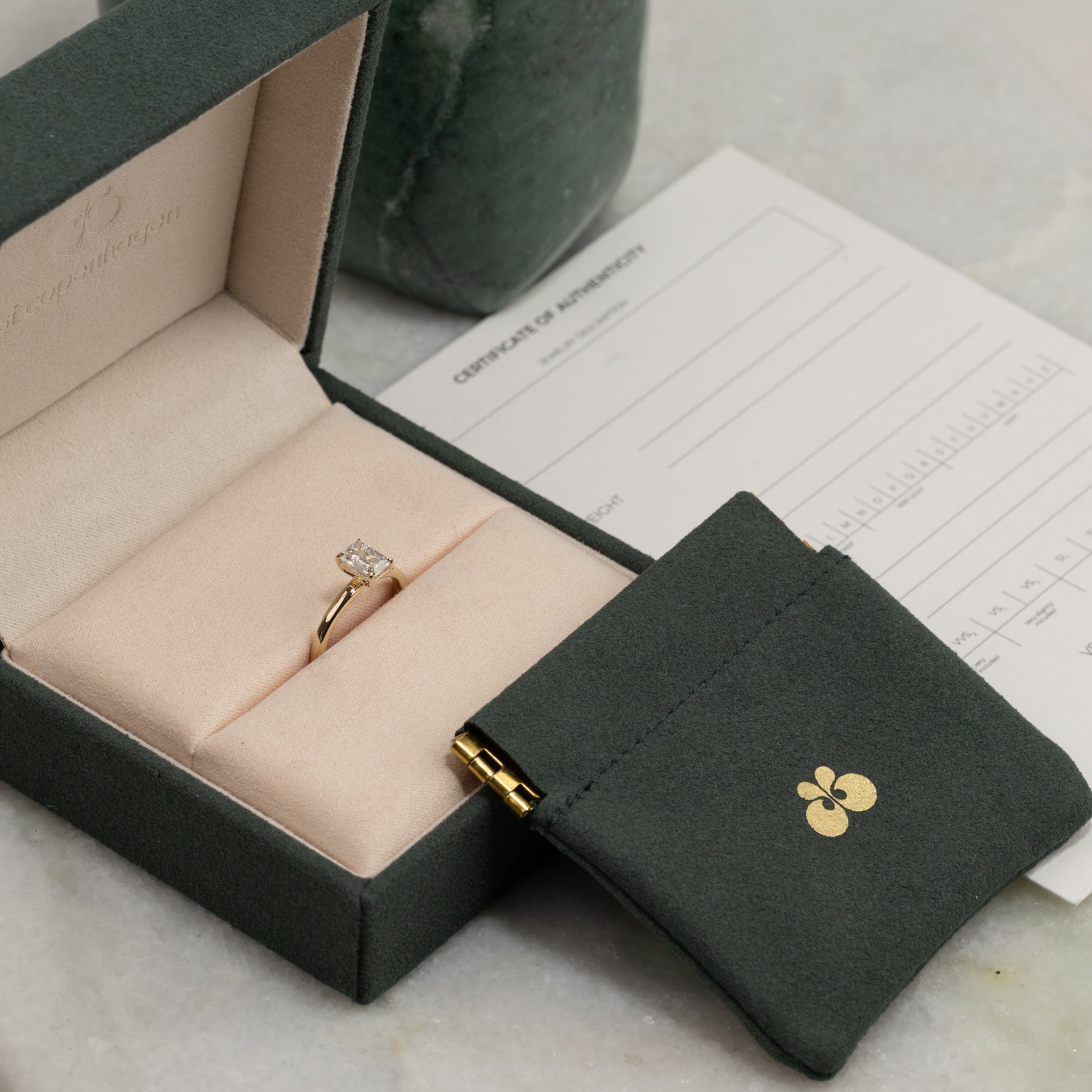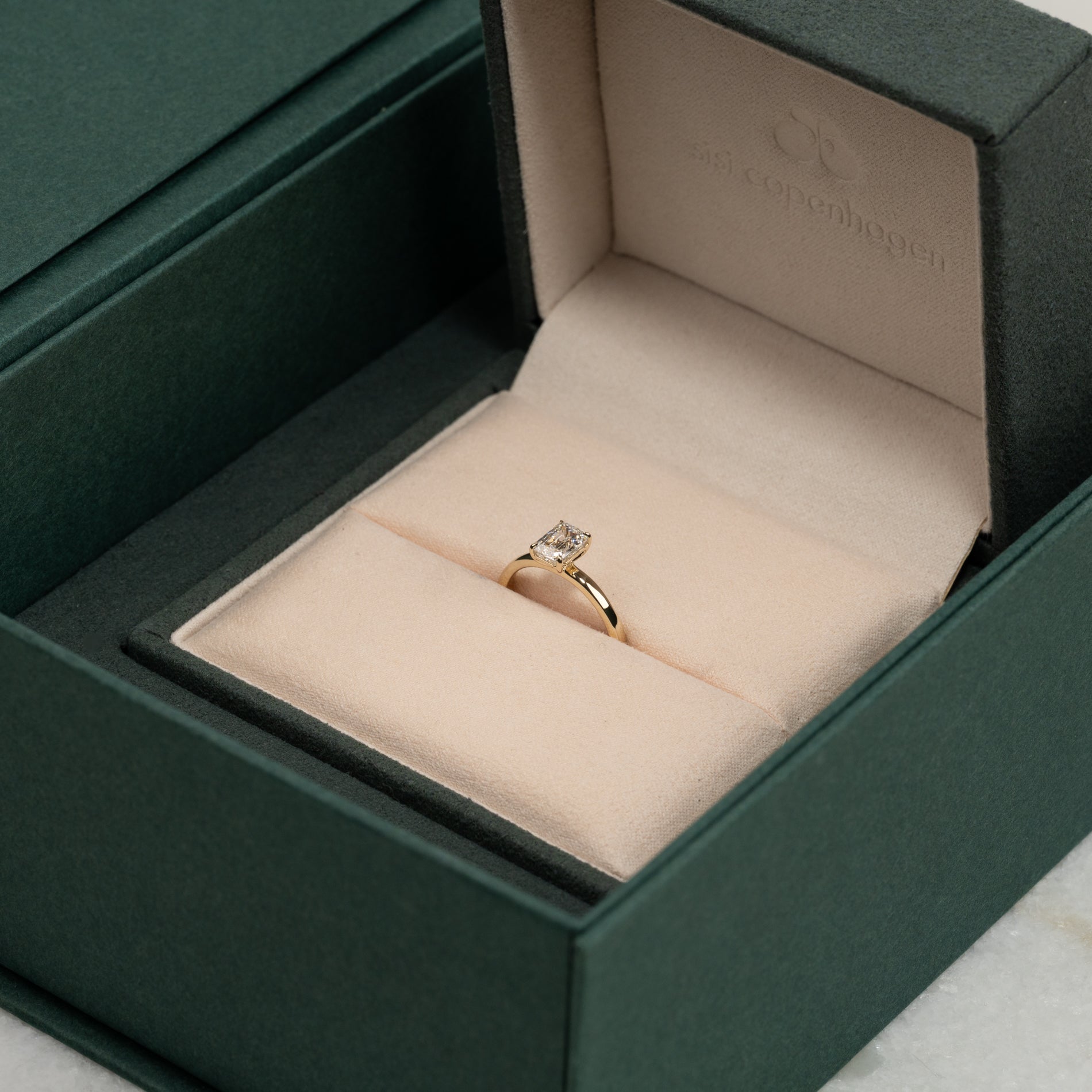 Ringen er laget i 14 karat massivt gull med en laboratoriedyrket diamant på 1,0 ct i fargen E–F (River) og klarheten VVS. Smykket er skapt med omtanke. Diamantene er produsert blant annet ved bruk av solenergi, og gullet er 100 % sertifisert resirkulert.