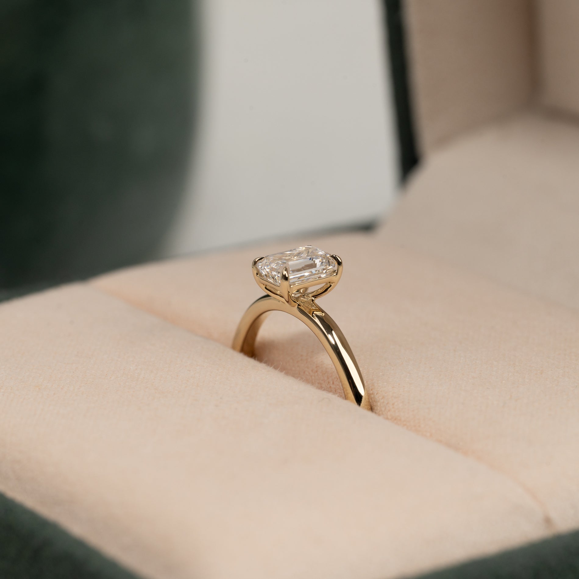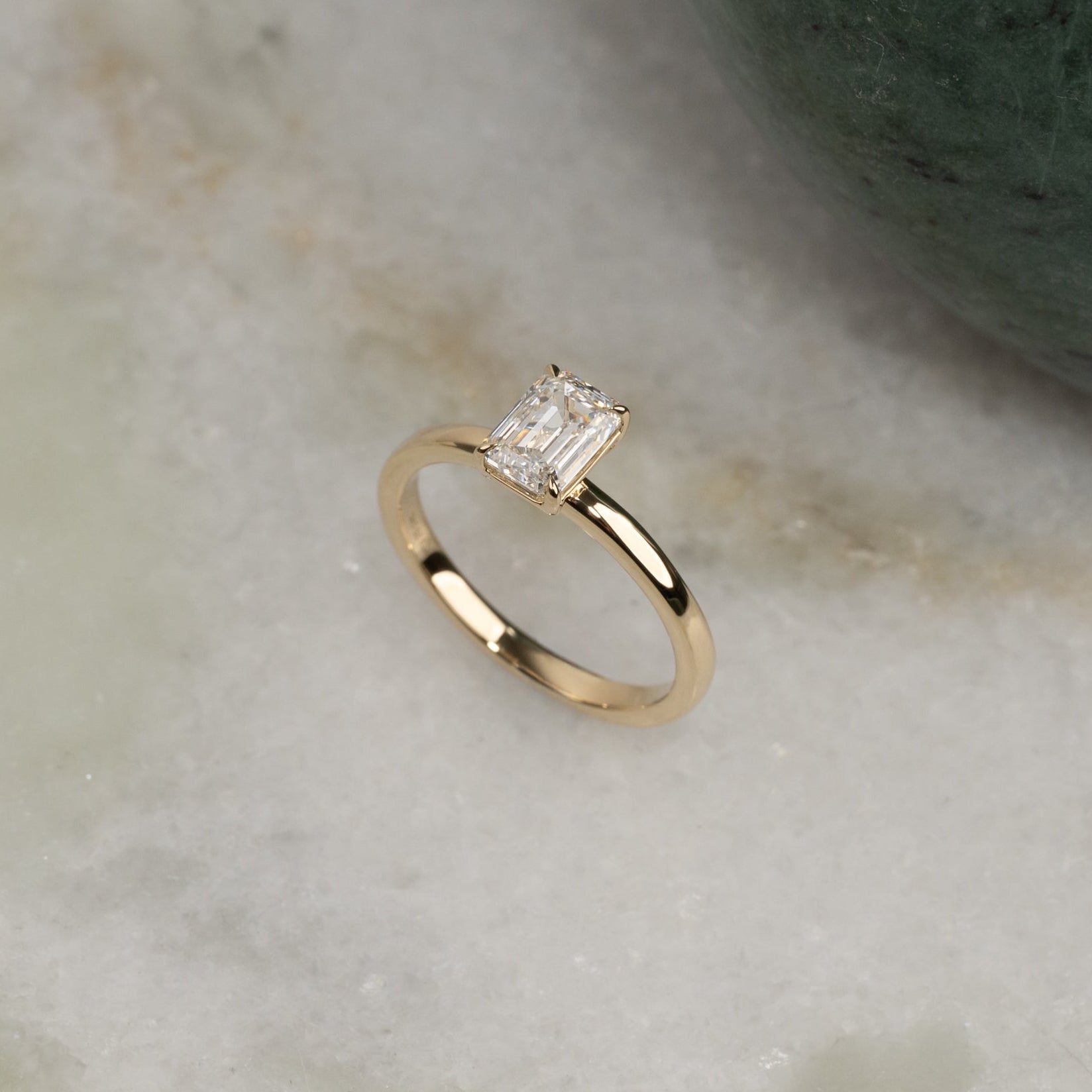 En tidløs ring i 14 karat gull med en vakker emeraldslipt laboratoriedyrket diamant på 1,0 ct. Diamanten er elegant satt i en lett hevet basket-innfatning som fremhever den klare, speilende glansen og de karakteristiske trinnslipte fasettene som kjennetegner emeraldslip.