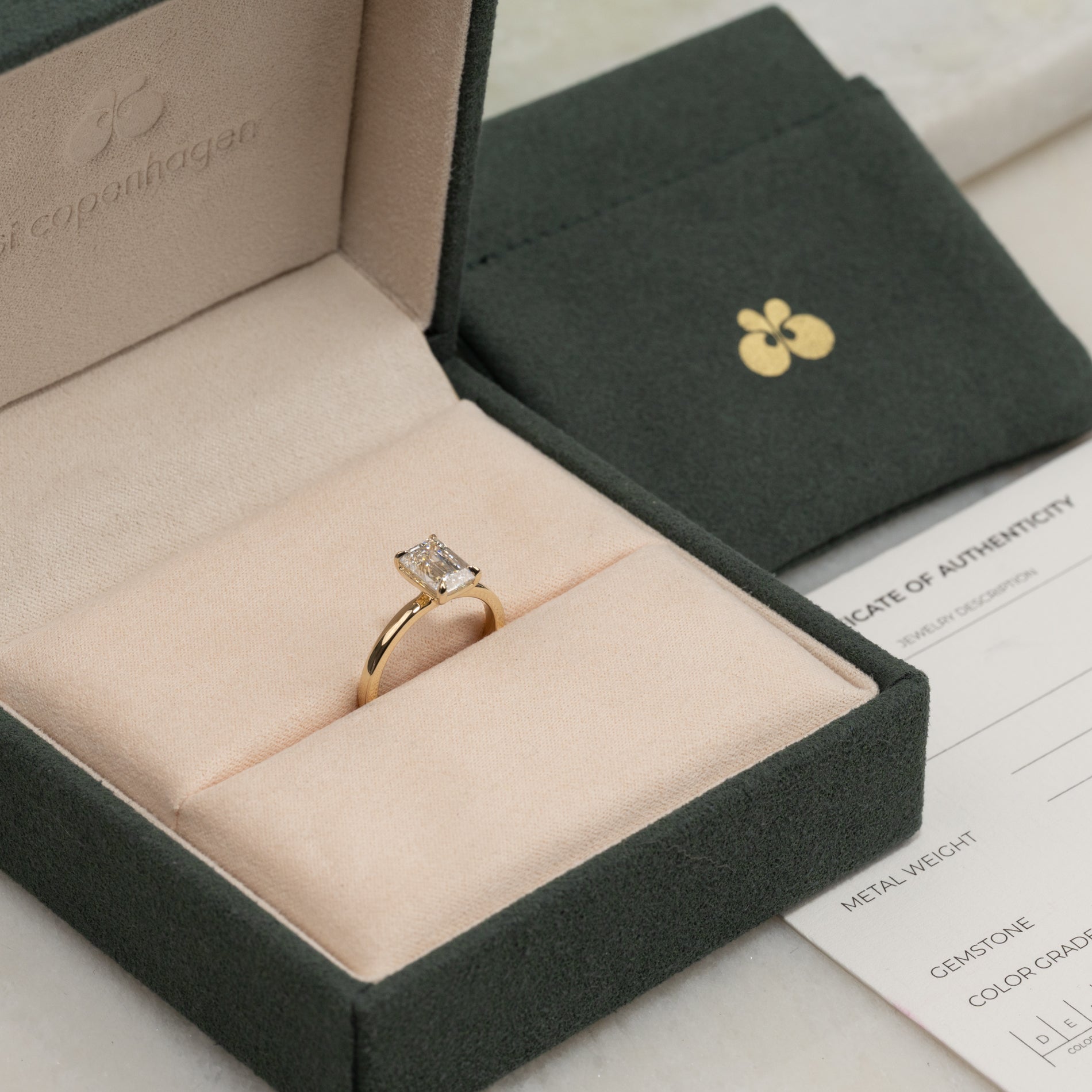 Ringen er laget i 14 karat massivt gull med en laboratoriedyrket diamant på 1,5 ct i fargen E–F (River) og klarheten VVS. Smykket er skapt med omtanke. Diamantene er produsert blant annet ved bruk av solenergi, og gullet er 100 % sertifisert resirkulert.