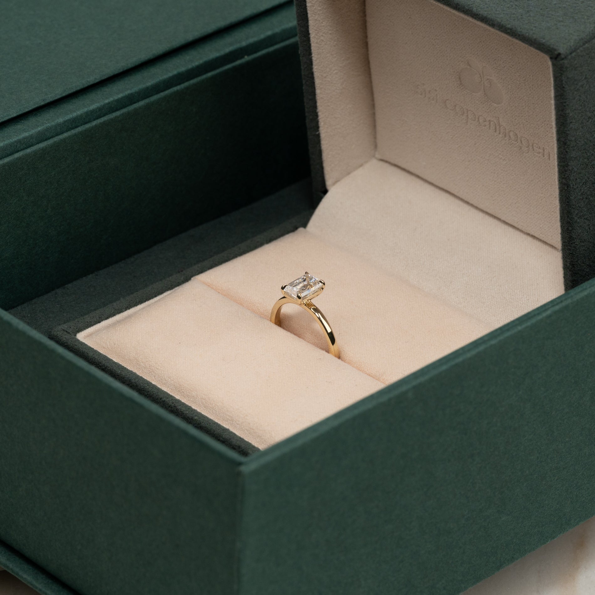 En tidløs ring i 14 karat gull med en vakker emeraldslipt laboratoriedyrket diamant på 1,5 ct. Diamanten er elegant satt i en lett hevet basket-innfatning som fremhever den klare, speilende glansen og de karakteristiske trinnslipte fasettene som kjennetegner emeraldslip.