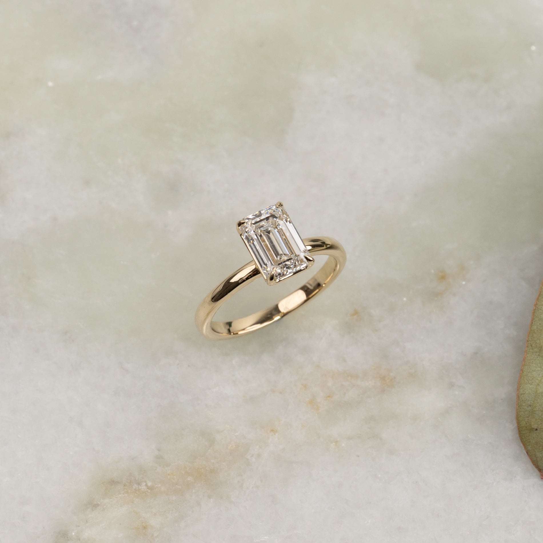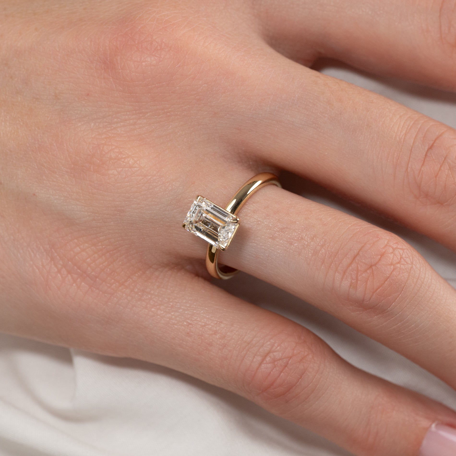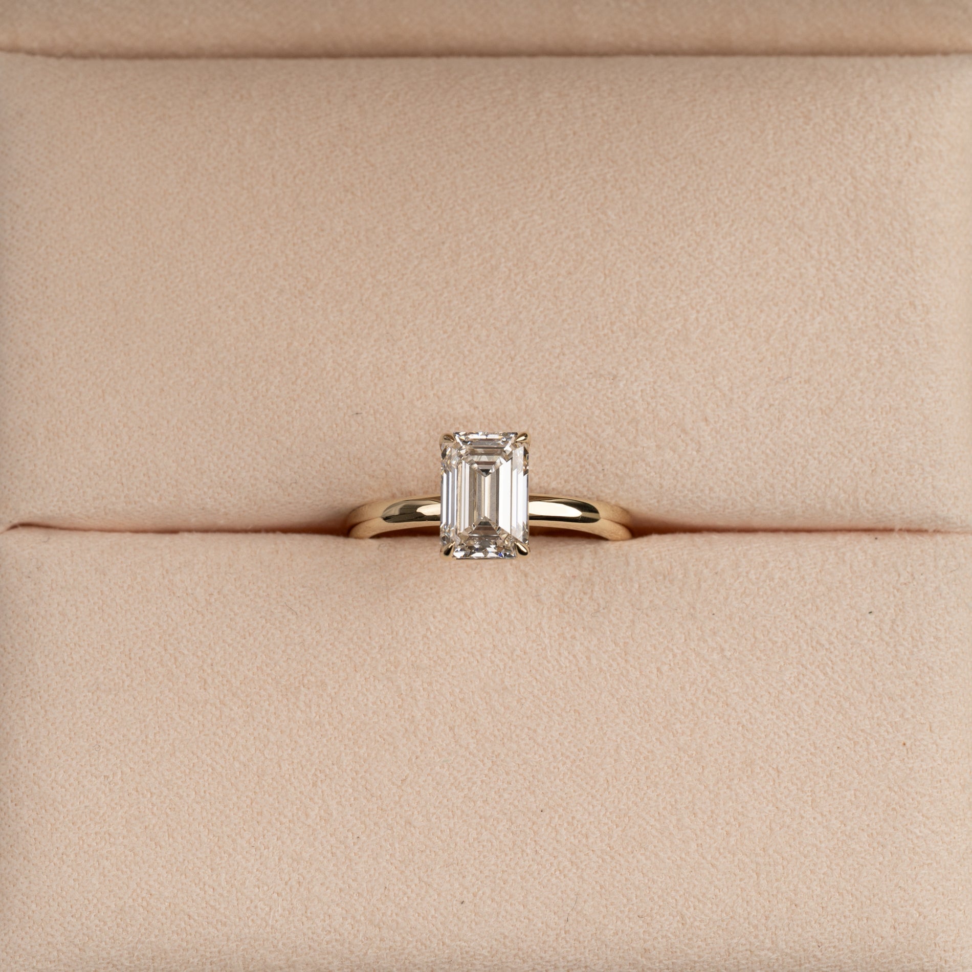 En tidløs ring i 14 karat gull med en vakker emeraldslipt laboratoriedyrket diamant på 2,0 ct. Diamanten er elegant satt i en lett hevet basket-innfatning som fremhever den klare, speilende glansen og den karakteristiske trinnfasetteringen som kjennetegner emeraldslip.