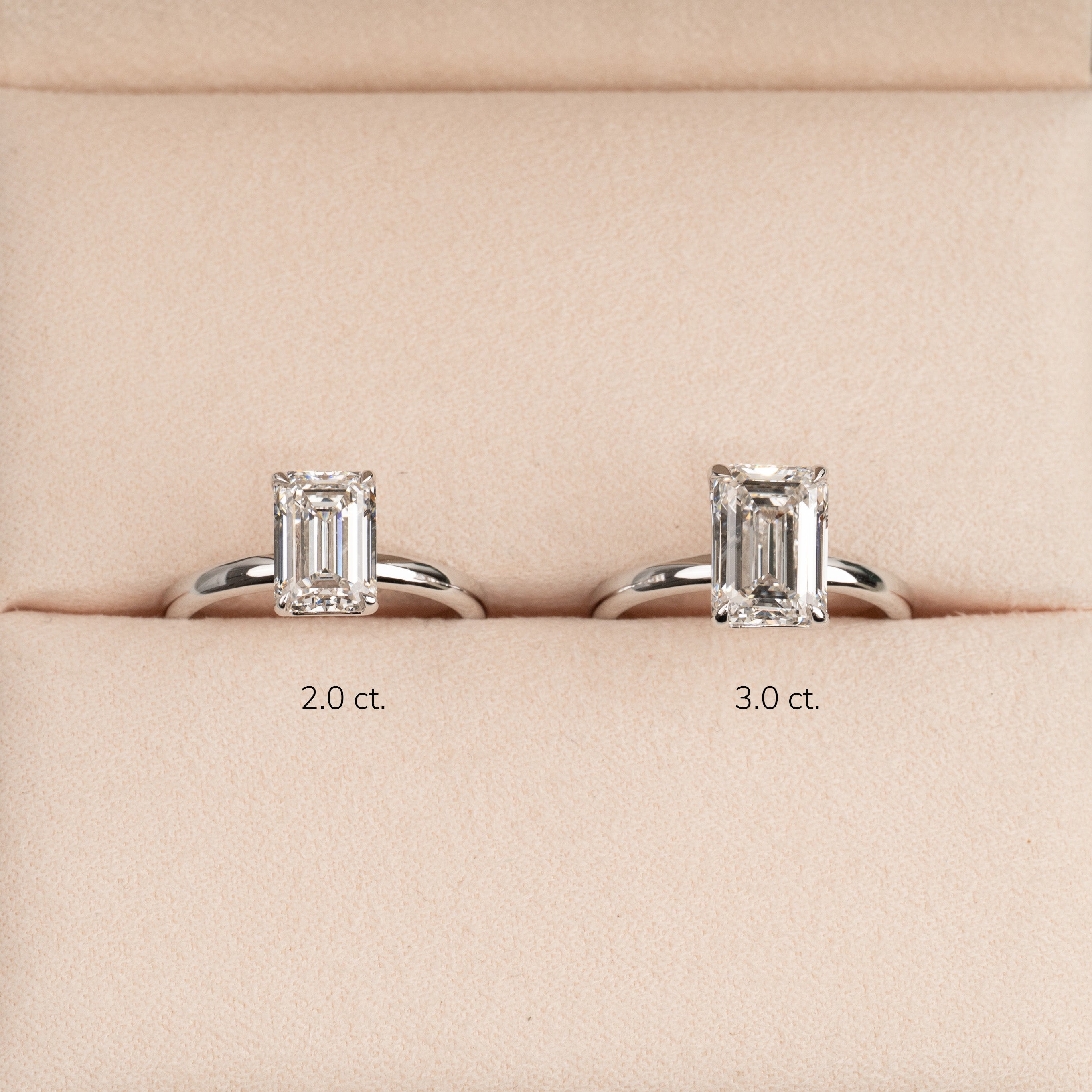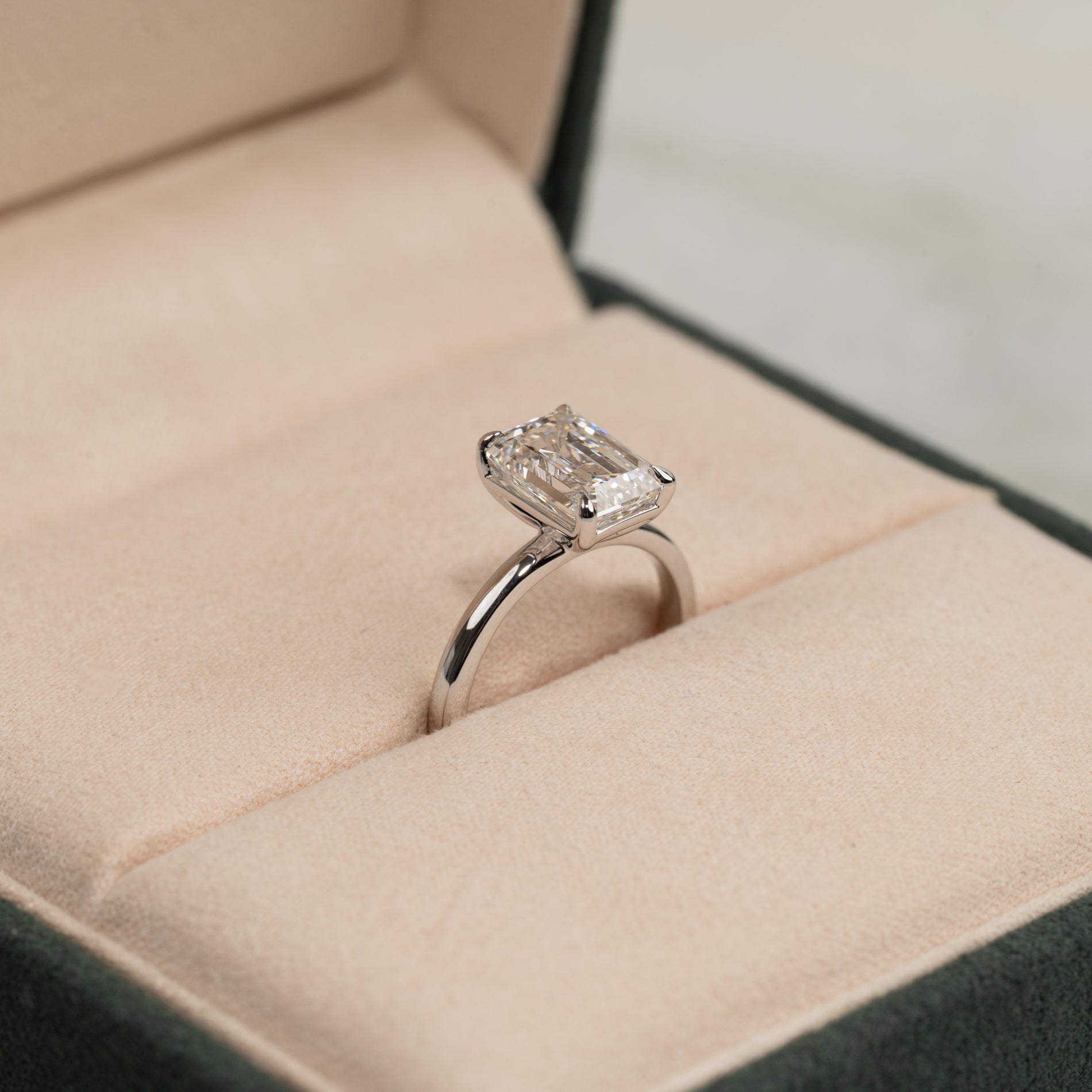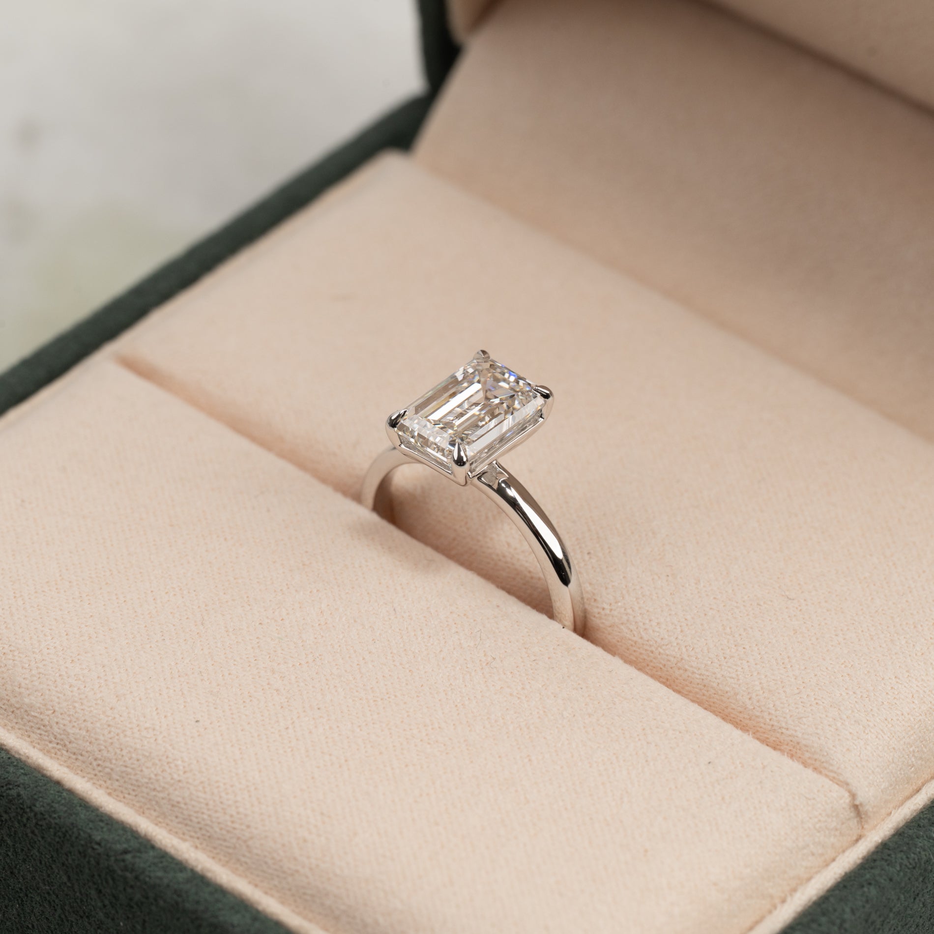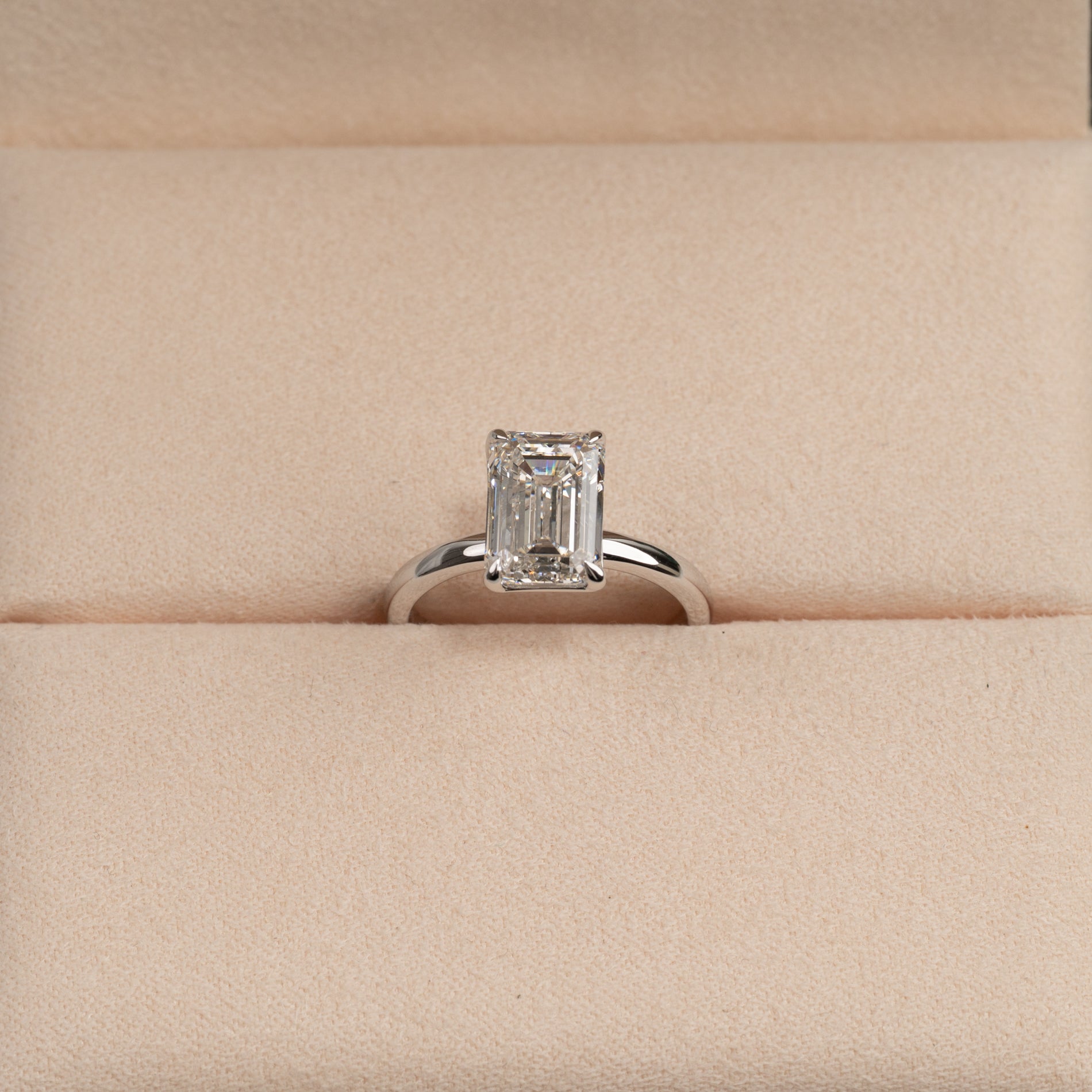 En tidløs ring i 14 karat hvitt gull med en vakker emeraldslipt laboratoriedyrket diamant på 3,0 ct. Diamanten er elegant satt i en lett hevet basket-innfatning som fremhever den klare, speilende glansen og den karakteristiske trinnfasetteringen som kjennetegner emeraldslip.