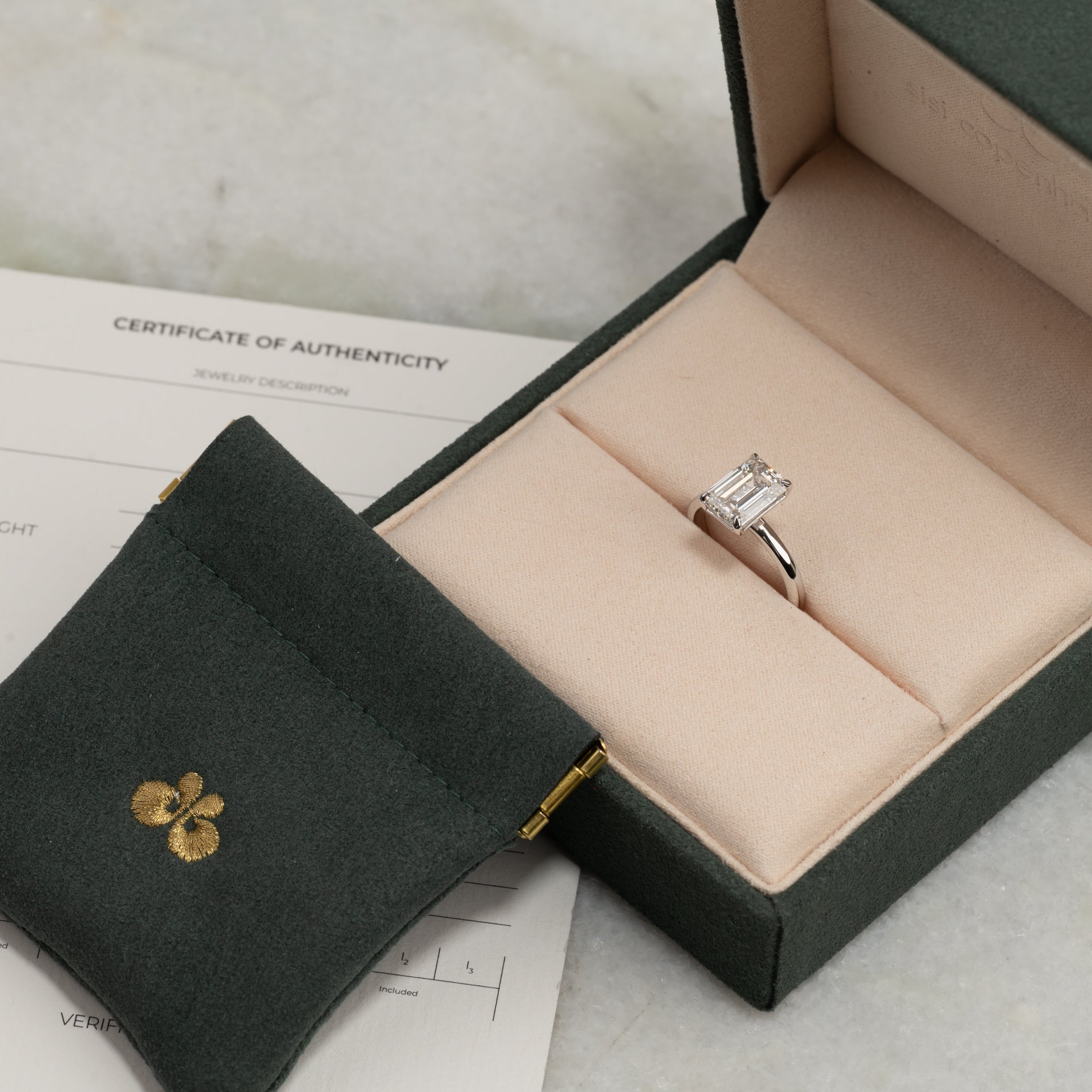 Ringen er laget i 14 karat massivt hvitt gull med en laboratoriedyrket diamant på 3,0 ct i fargen E–F (River) og klarheten VVS. Smykket er skapt med omtanke. Diamantene er produsert blant annet ved bruk av solenergi, og gullet er 100 % sertifisert resirkulert.