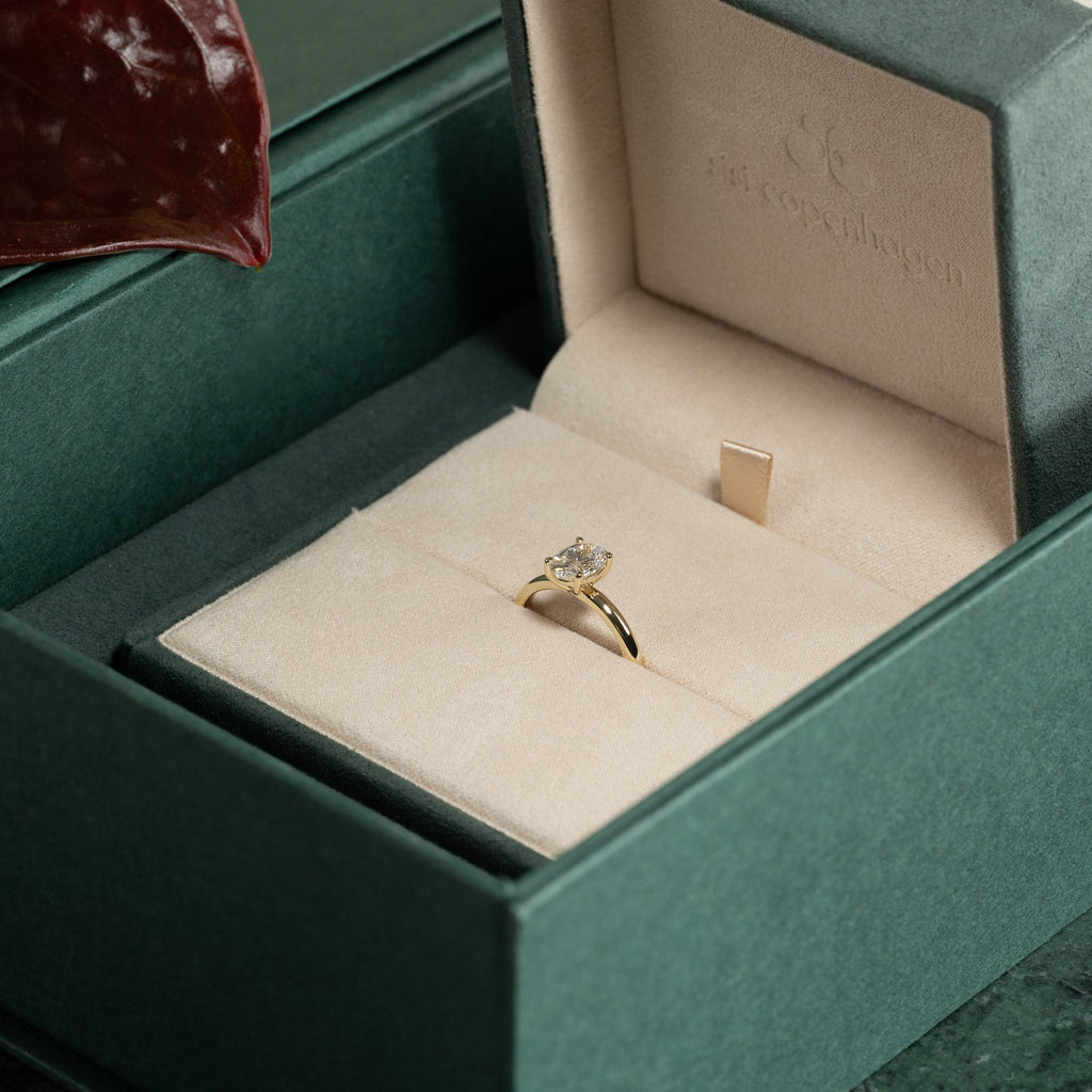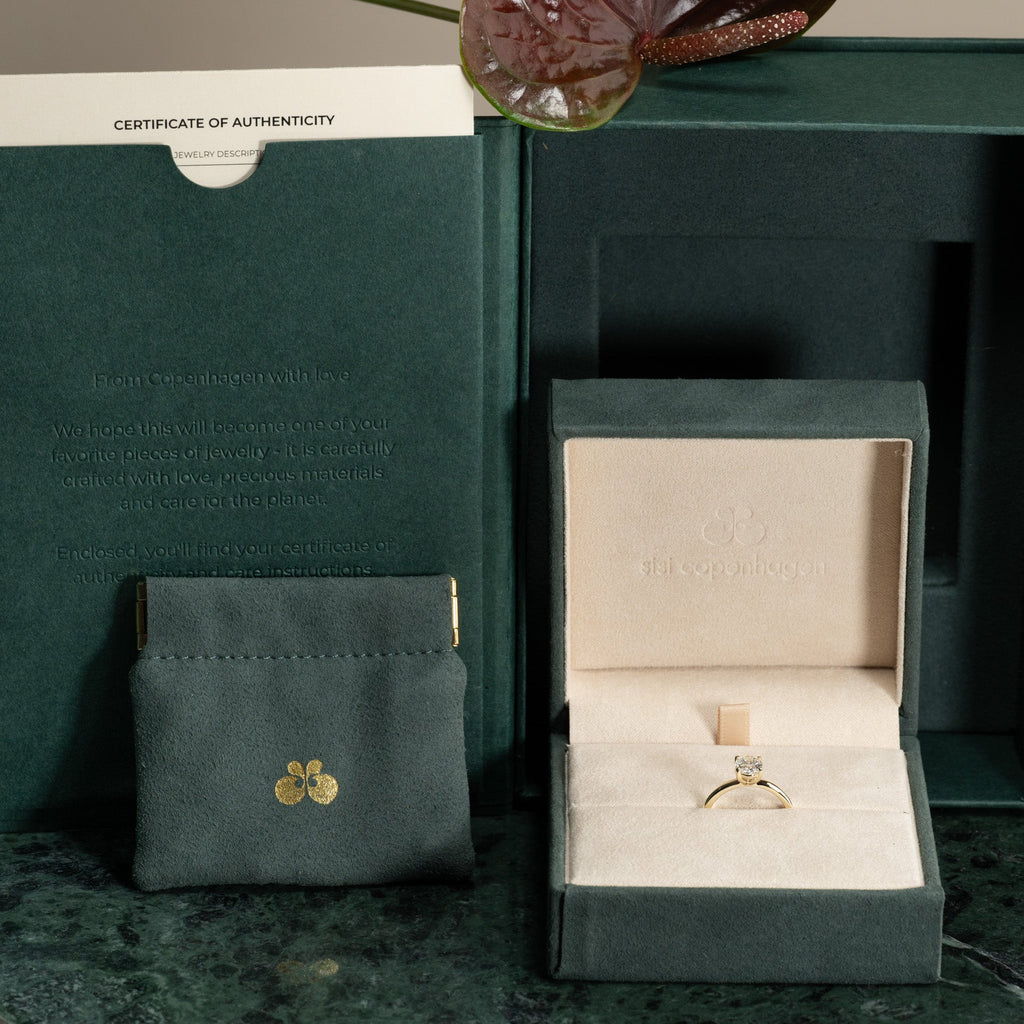 Ringen er laget i 14 karat massivt gull med en etisk skapt lab-grown diamant på 1,0 ct. i fargen E/F (River) og klarheten VVS. Smykket er skapt med omtanke; diamantene er fremstilt med blant annet solenergi, og gullet er 100% sertifisert resirkulert.