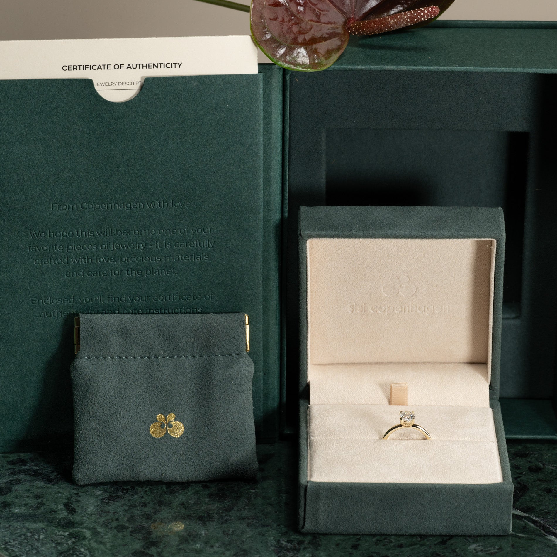 Når du mottar smykket, vil det være i vår gaveeske, bundet med et vakkert matchende silkebånd, klar til å gis som gave. Inne i esken finner du en smykkeboks, en pose og et ekthetsbevis.