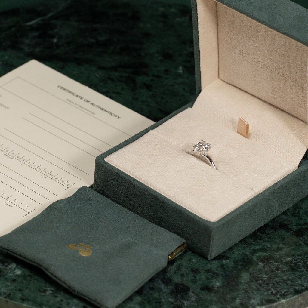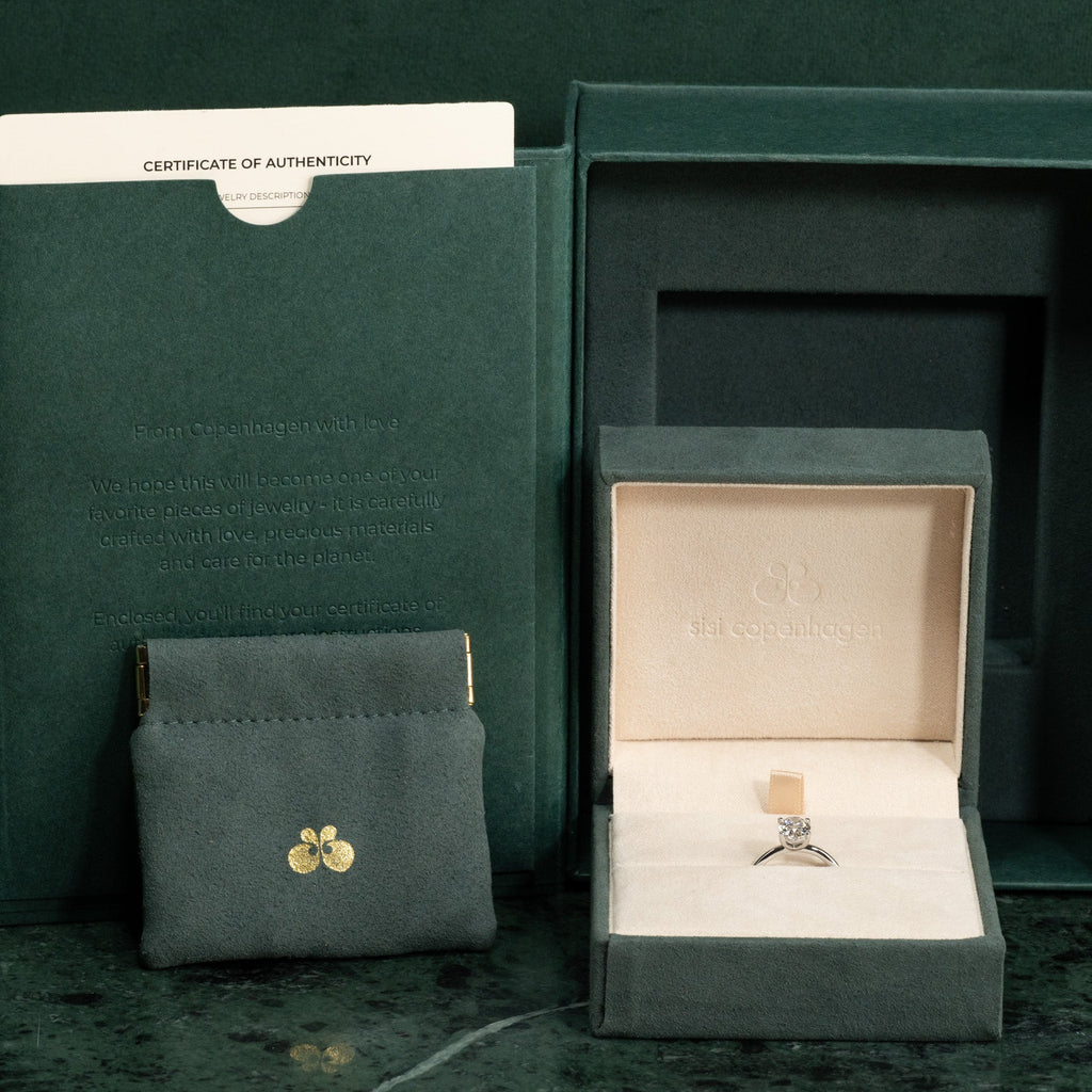 Ringen kommer i vår eksklusive Diamond Collection-boks. Boksen inneholder en smykkeeske, et diamant-sertifikat og en pouch. Esken kommer med gavebånd og er også perfekt hvis smykket skal gis i gave. Diamanten kommer med et IGI-sertifikat.