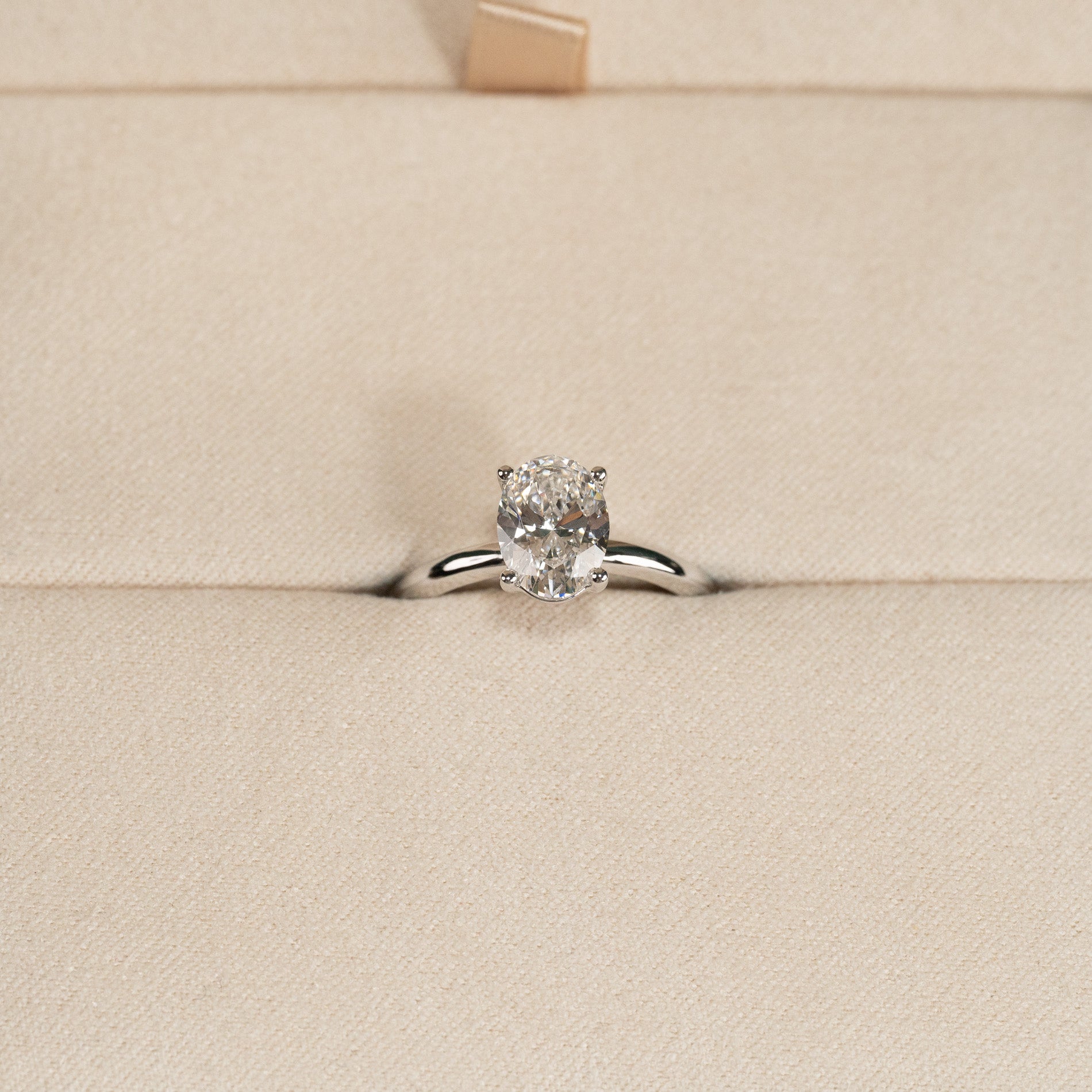 Ring i 14 karat hvitt gull med 1,5 ct. ovalslipt lab-dyrket diamant. Stenen er vakkert satt i en litt hevet basket-fatning som komplimenterer den elegante stenen.