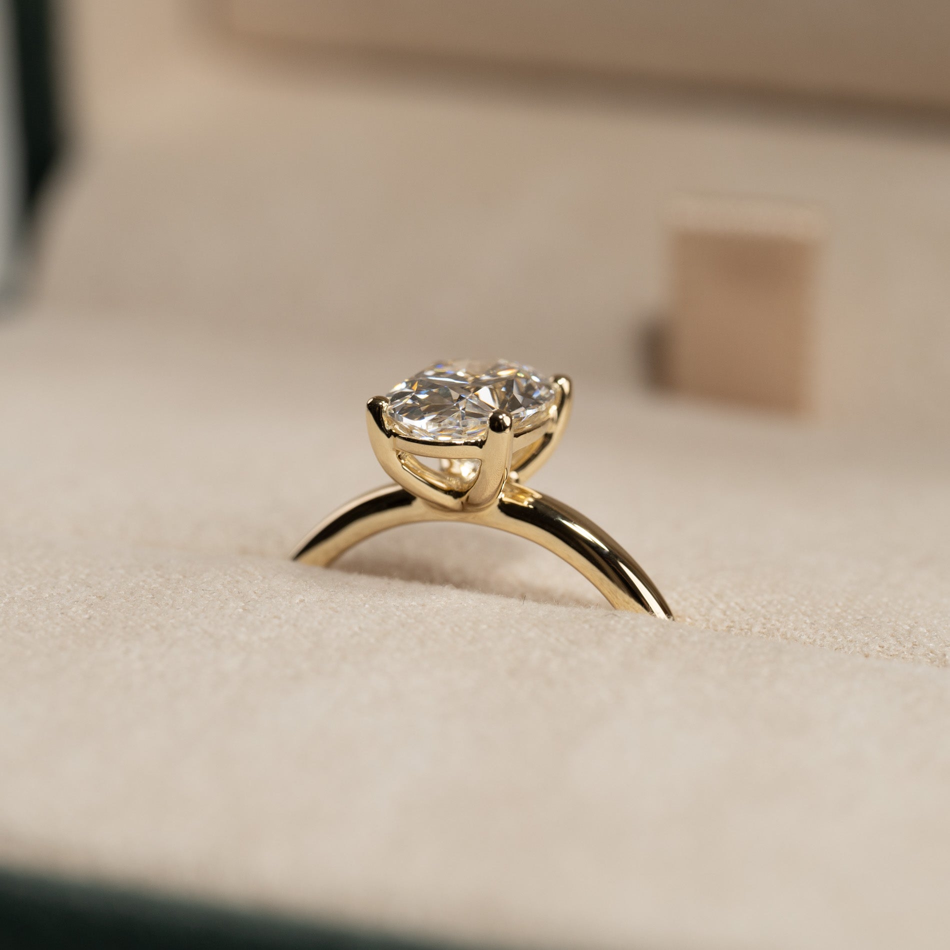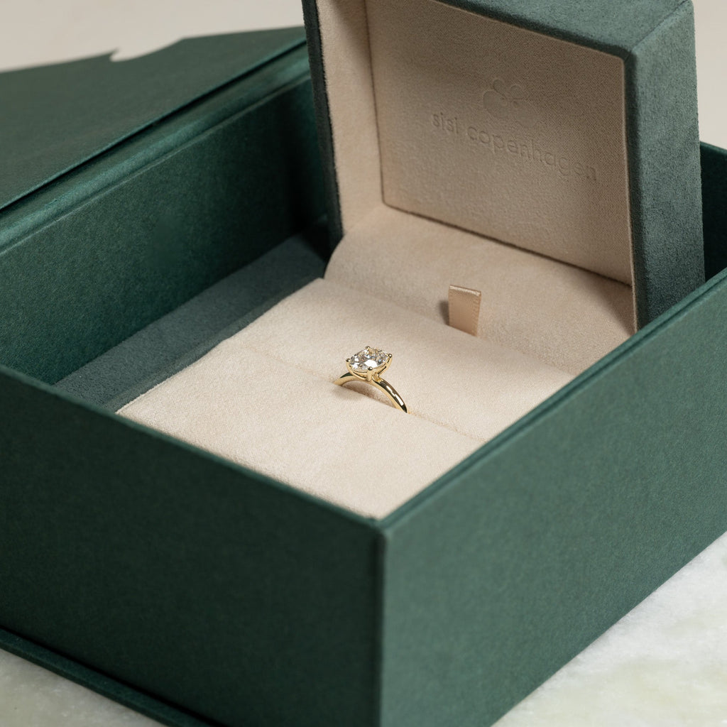Ringen er laget i 14 karat massivt gull med en lab-grown diamant på 1,5 ct. i fargen E-F (River) og klarheten VVS. Smykket er skapt med omtanke; diamantene er fremstilt med blant annet solenergi, og gullet er 100% sertifisert resirkulert.