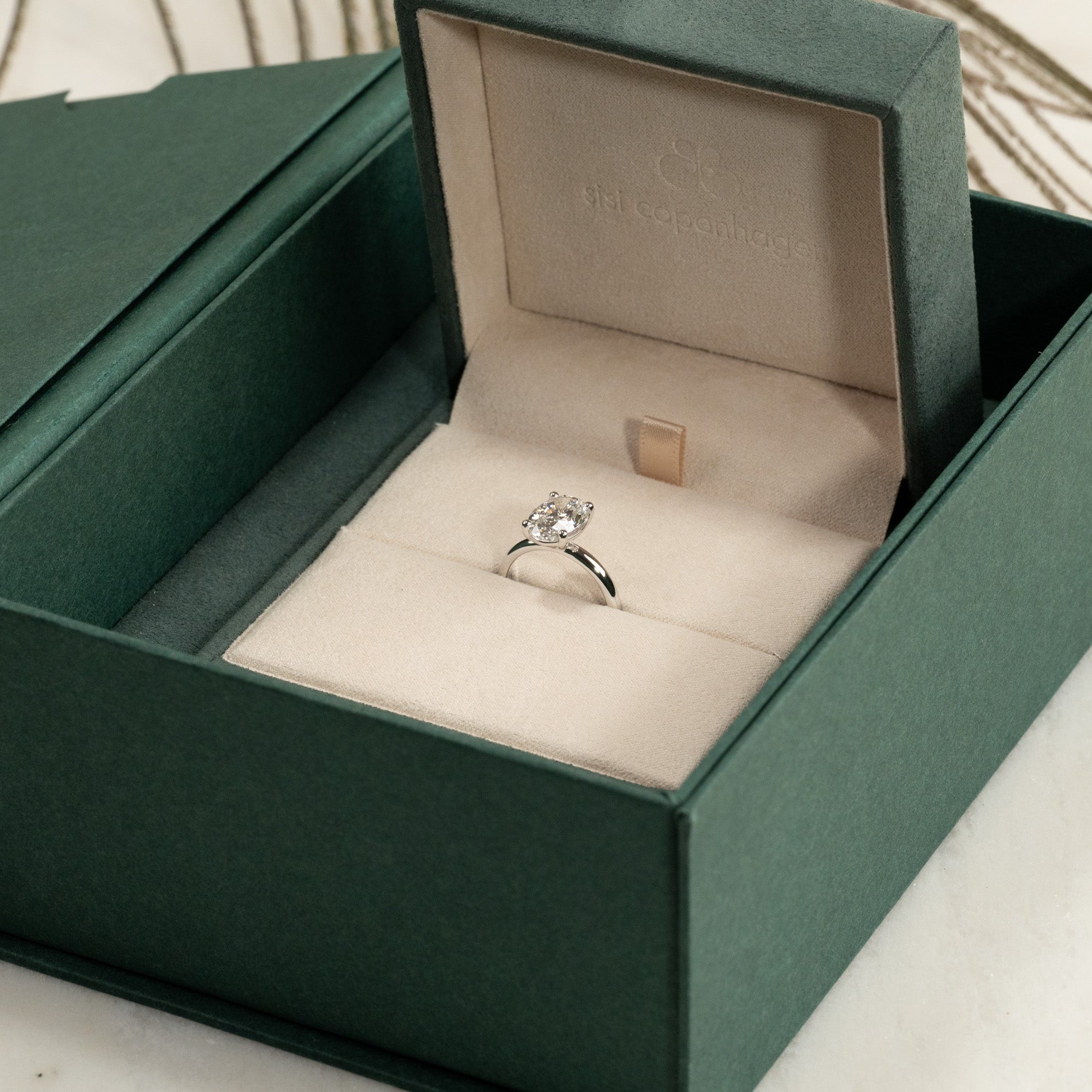 Smykket er pent og sikkert plassert i en smykkeboks som er trukket med vegansk semsket skinn.