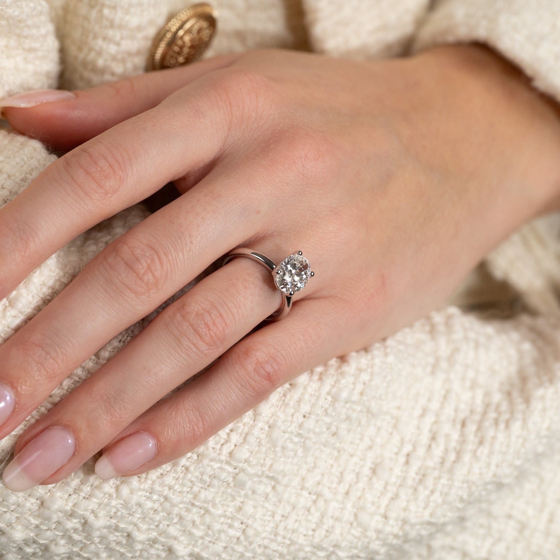 Ringen er laget i 14 karat hvitt gull med en lab-dyrket diamant på 3,0 ct. i fargen E/F (River) og klarheten VVS. Smykket er laget med omhu; diamantene er produsert med blant annet solenergi, og gullet er 100% sertifisert resirkulert.