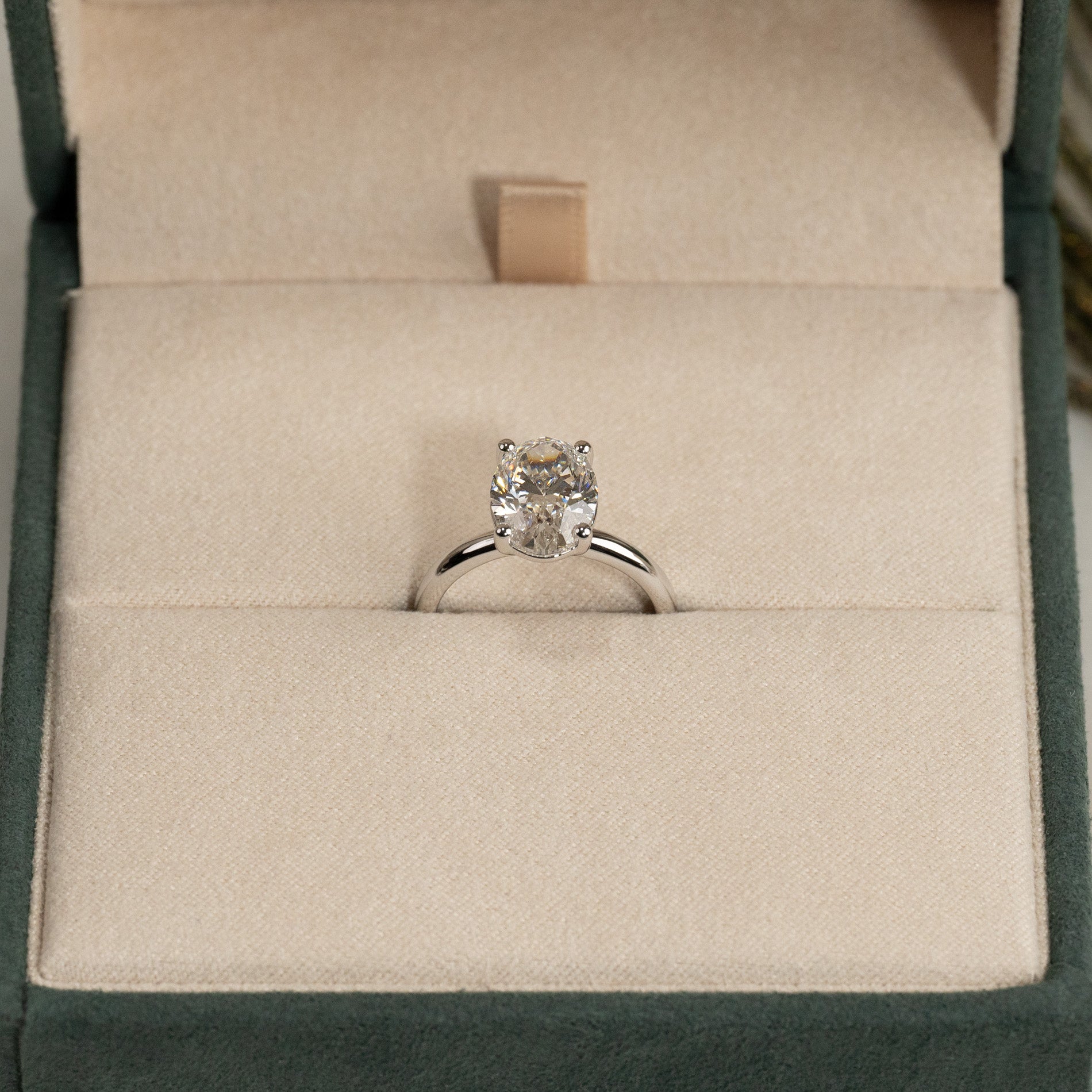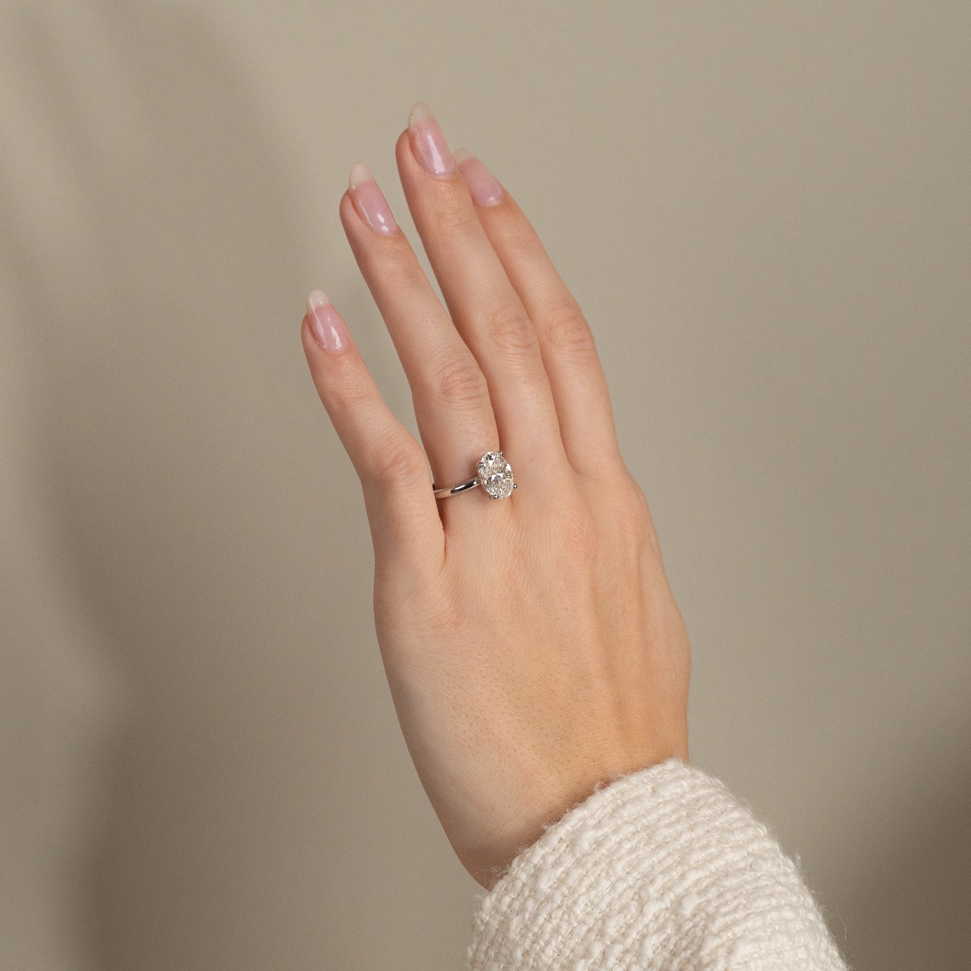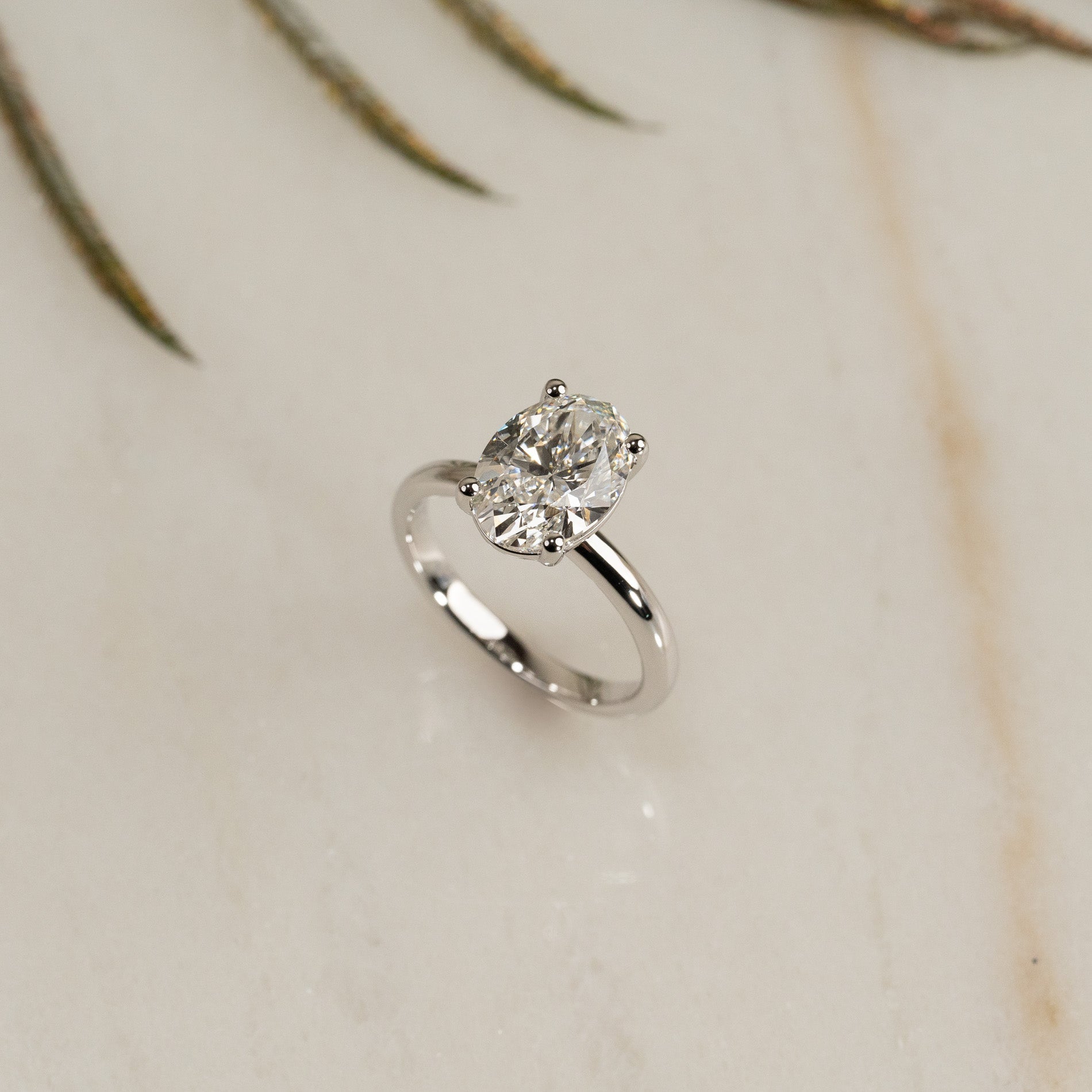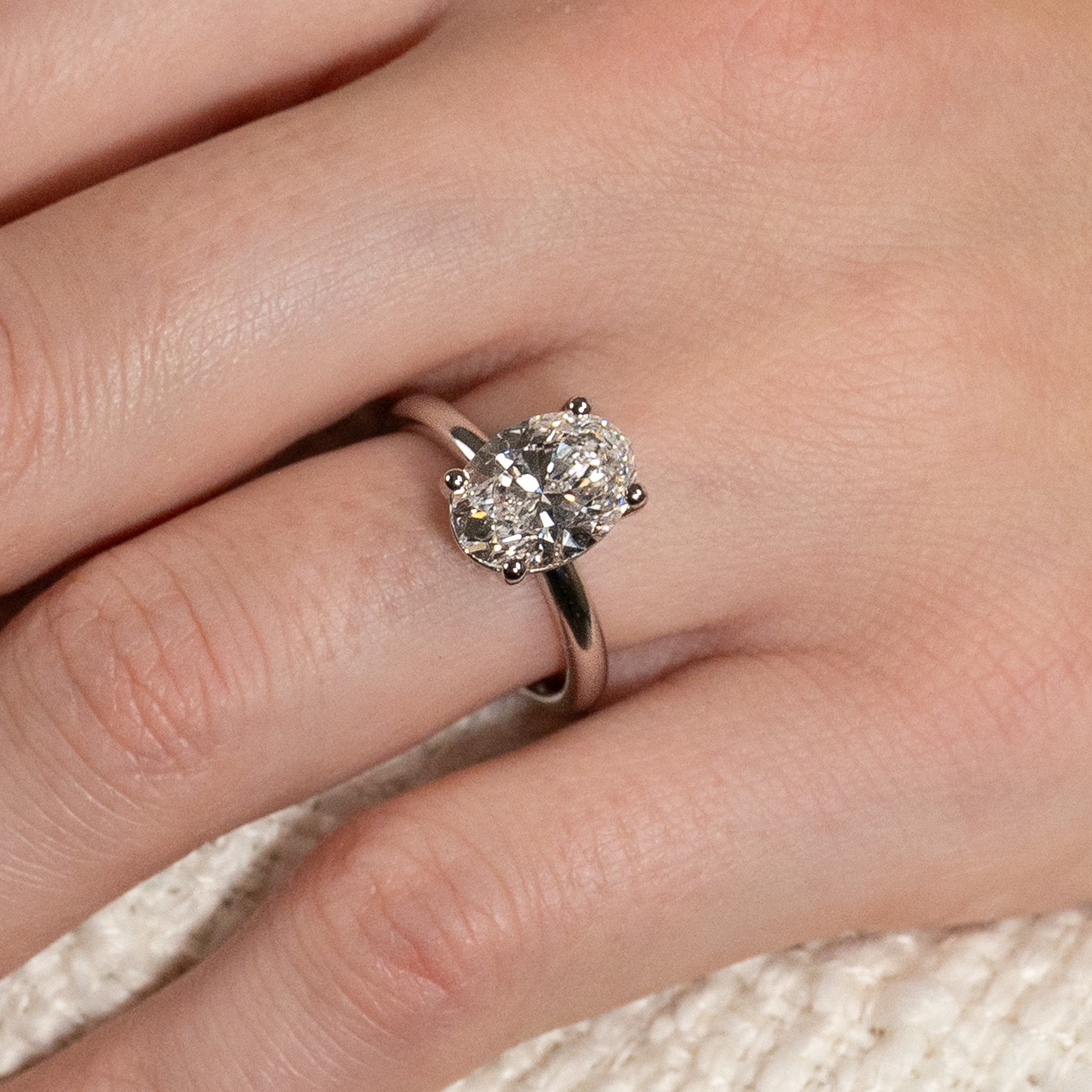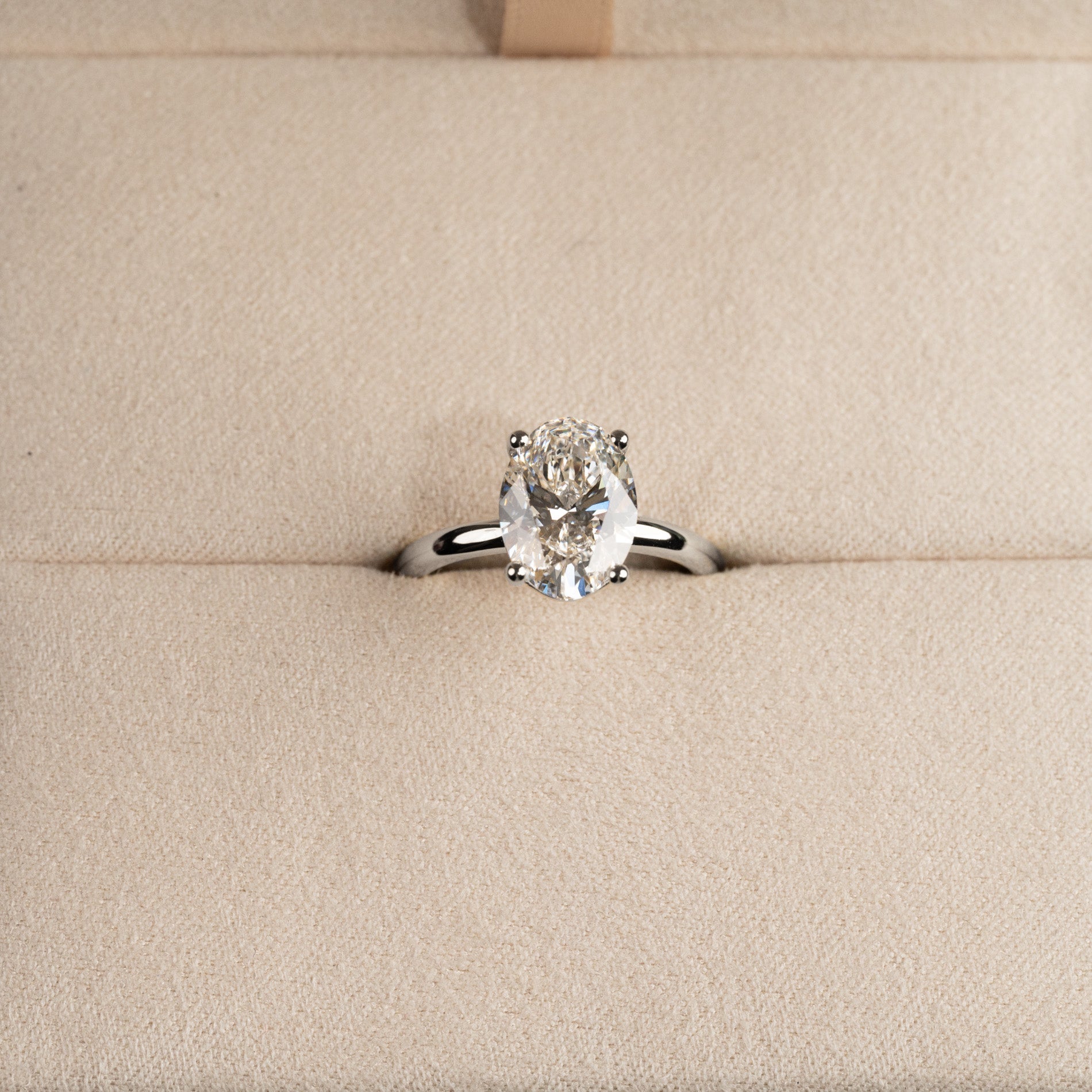 Ring i 14 karat massivt hvitt gull med 3,0 ct. ovalslipt lab-dyrket diamant. Stenen er vakkert satt i en litt hevet basket-innfatning som komplimenterer den elegante steinen. Ringen er en perfekt cocktailring, den perfekte gaven til noen du er glad i og bryr deg om eller som den perfekte forlovelsesringen.