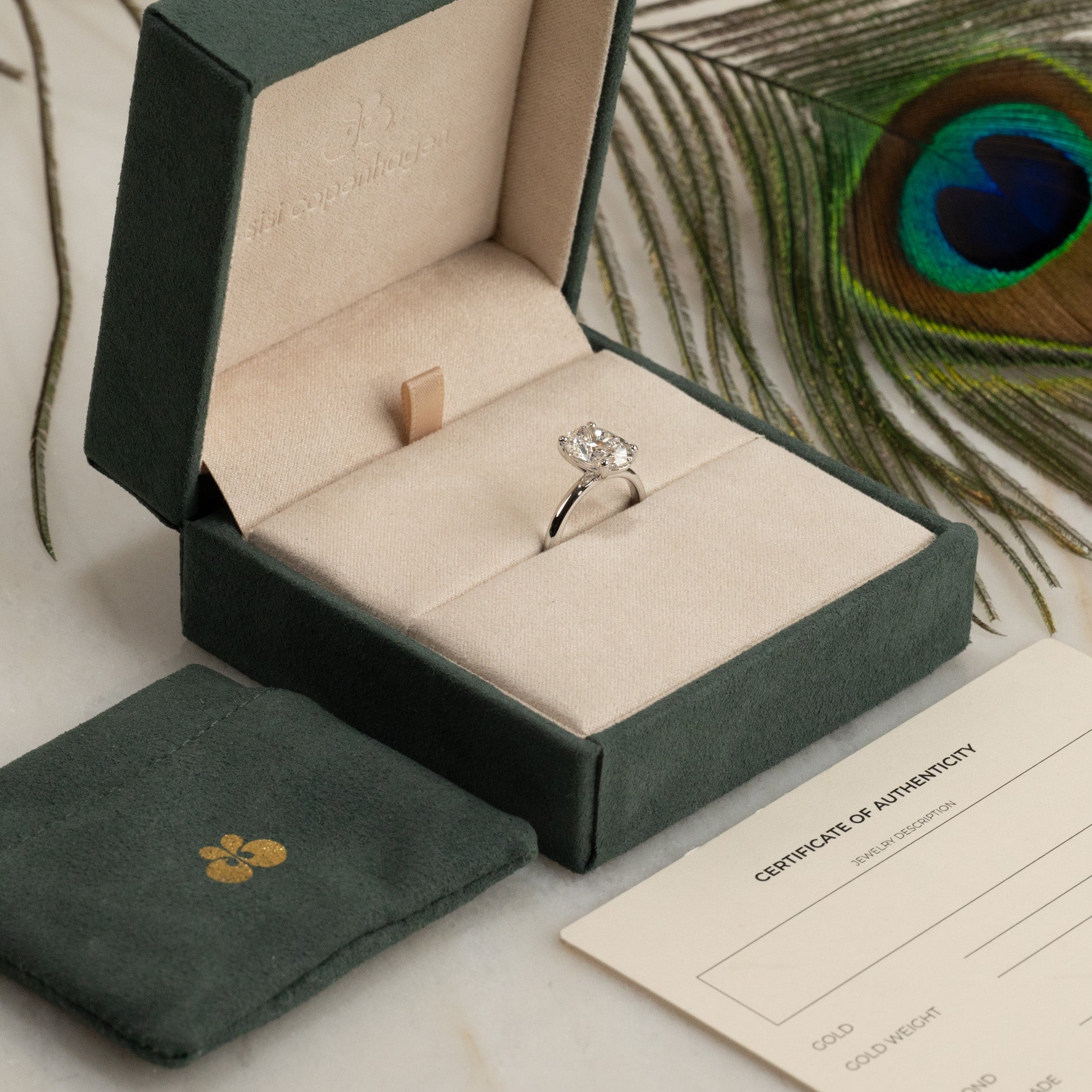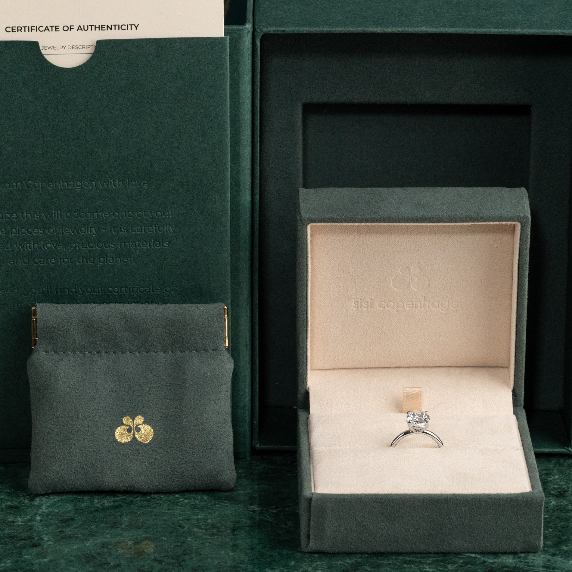 Når du mottar smykket, vil det være i vår gaveeske, bundet med et vakkert matchende silkebånd, klar til å gis som gave. Inne i esken finner du en smykkeboks, en pose og et ekthetsbevis.