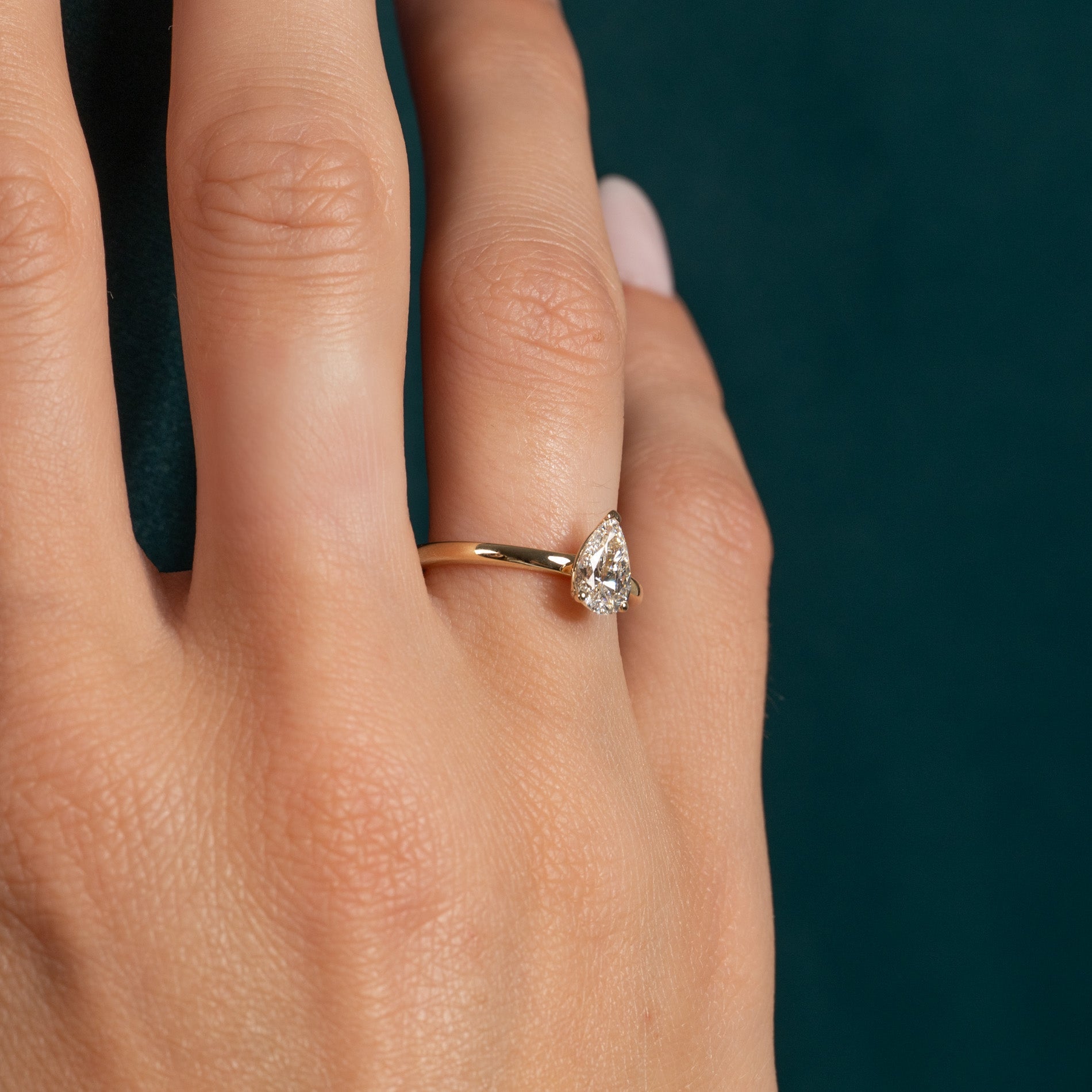 14 karat gullring med en stor 0,75 carat pæreformet (dråpeformet) laboratoriedyrket diamant. Steinen er vakkert satt i en litt hevet kurvfatning som komplementerer den elegante steinen. Ringen er en perfekt cocktailring eller et fantastisk smykke for henne som ikke har noe imot å gjøre litt oppstyr på en veldig stilig og elegant måte.