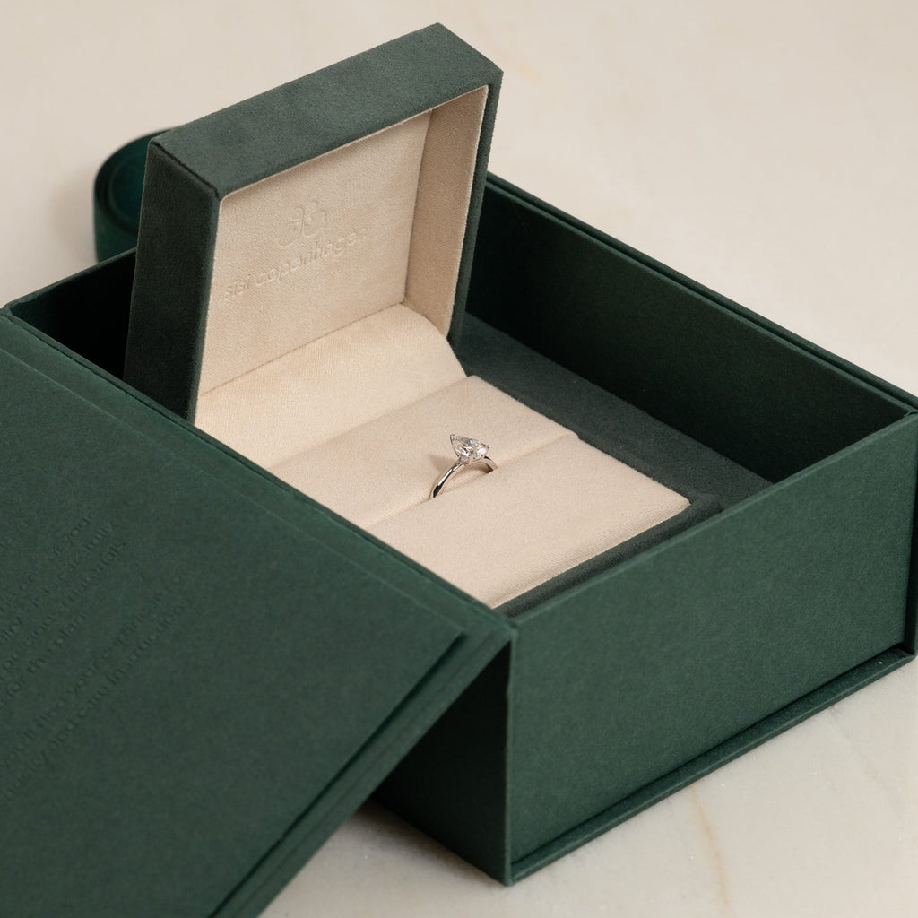Ringen er laget i 14 karat hvitt gull med en 1,2 karat laboratoriedyrket diamant (8,8 x 5,7 mm) i farge E/F (River) og klarhet VVS. Smykket er laget med omhu; diamantene er blant annet produsert ved hjelp av solenergi, og gullet er 100 % sertifisert resirkulert. Diamanten leveres med et IGI-sertifikat.