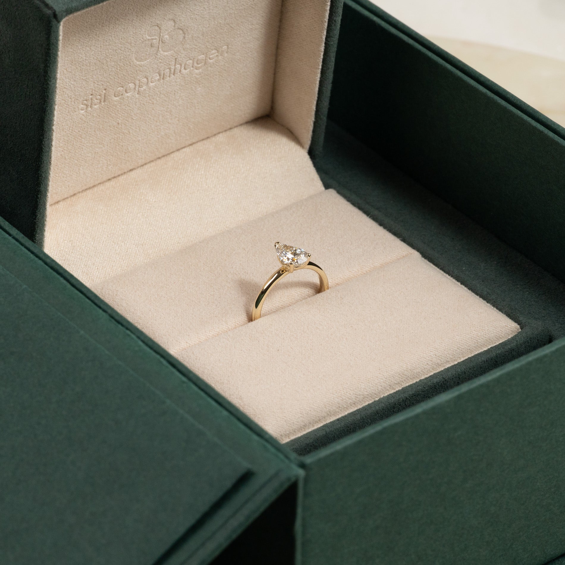 Ring i 14 karat massivt gull med en stor 1,2 carat pæreformet (dråpeformet) laboratoriedyrket diamant. Steinen er vakkert satt i en litt hevet kurvfatning som komplementerer den elegante steinen. Ringen er en perfekt cocktailring eller et fantastisk smykke for henne som ikke har noe imot å gjøre litt av seg på en veldig stilig og elegant måte.
