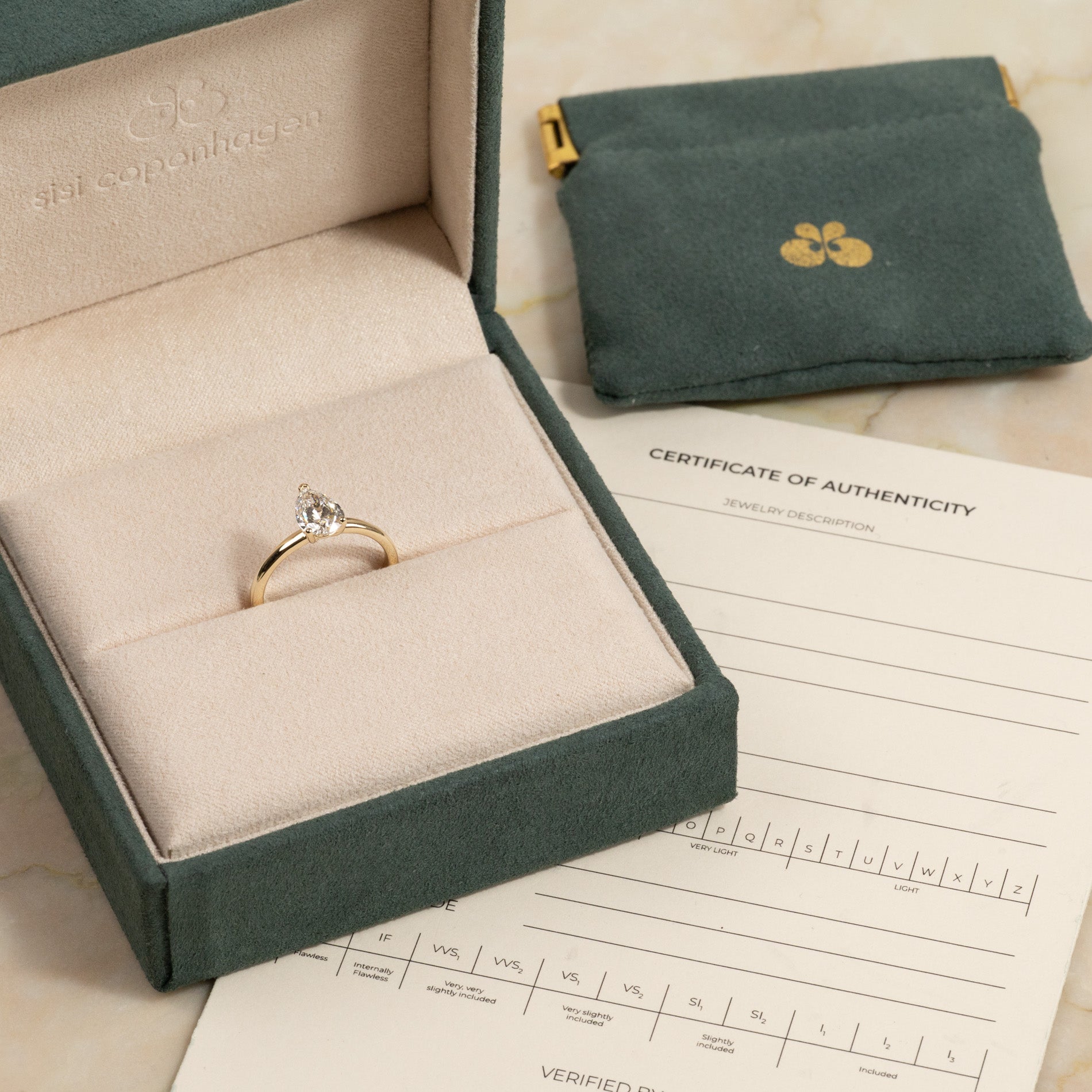 Ringen er laget av 14 karat massivt gull med en 1,2 carat laboratoriedyrket diamant (8,8 x 5,7 mm) i farge E/F (River) og klarhet VVS. Smykket er laget med omhu; diamantene er blant annet produsert ved hjelp av solenergi, og gullet er 100 % sertifisert resirkulert. Diamanten leveres med et IGI-sertifikat.