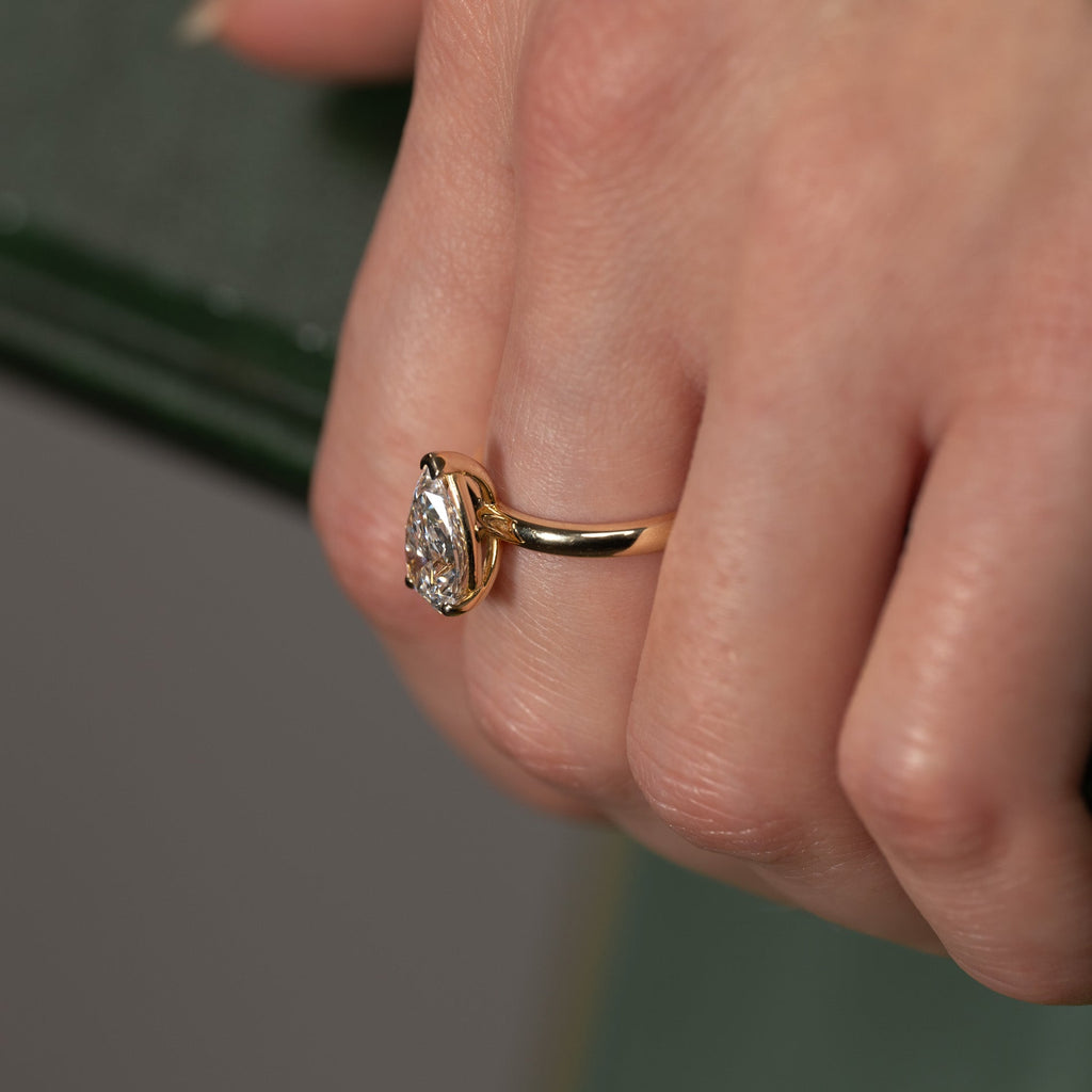 Ring i gull med en stor 2,1 ct. pear-slipt lab-grown diamant (dråbeformet). Stenen sitter i en vakker basket-omfatning som sitter litt hevet over ringskinnen, og som virkelig komplementerer den elegante stenen. Ringen er en perfekt ring til cocktail-fester eller et perfekt smykke til henne som ikke har noe i mot å bære en ring med statement.