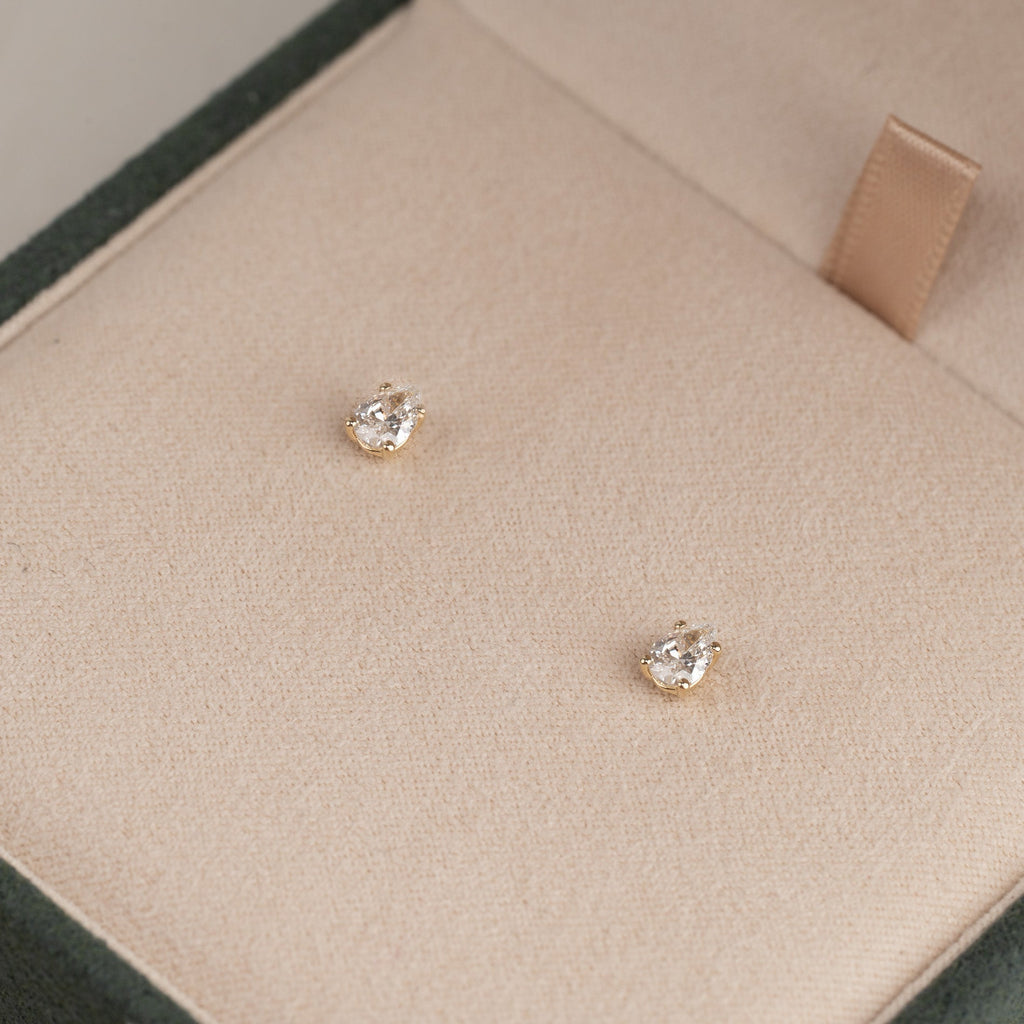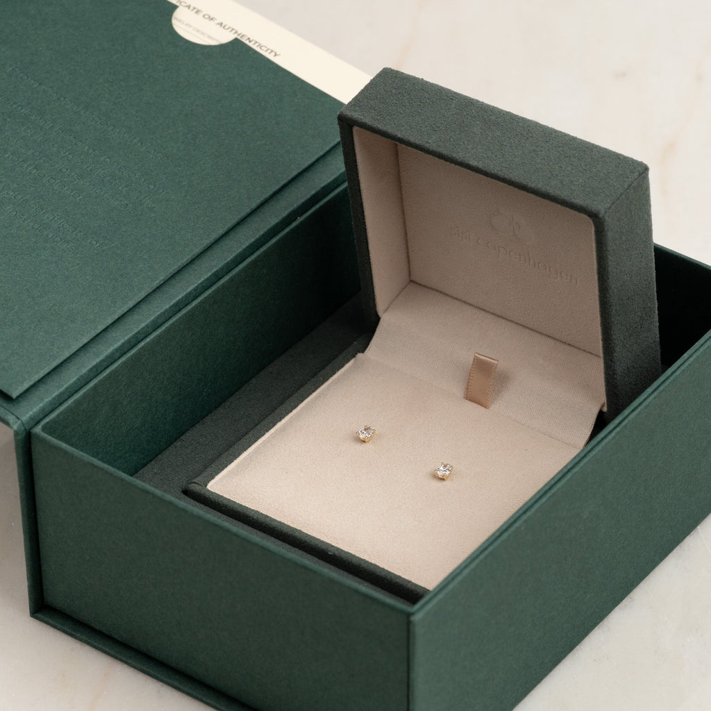 Øredobbene er laget i massivt 14 karat gull med laboratoriedyrkede diamanter med en total vekt på 0,5 ct. (2 x 0,25 ct.) i fargen E–F (River) og klarheten VVS. De er skapt med omtanke – diamantene er produsert ved hjelp av solenergi, og gullet er 100 % sertifisert resirkulert.
