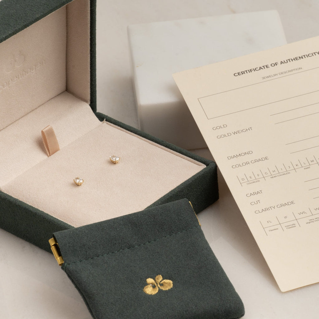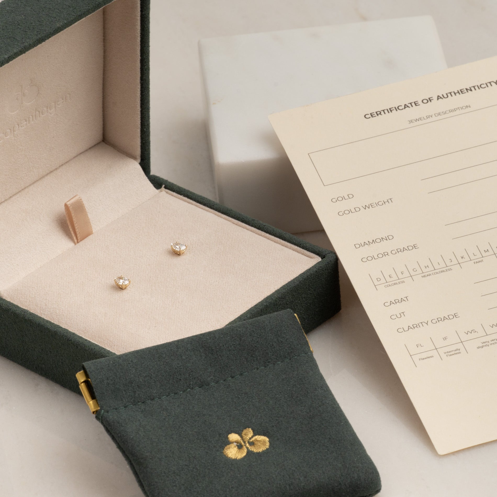 Smykket leveres i vår eksklusive Diamond Collection-boks med en elegant smykkeeske, sertifikat og smykkepose. Boksen er også perfekt dersom øredobbene skal gis som gave.
